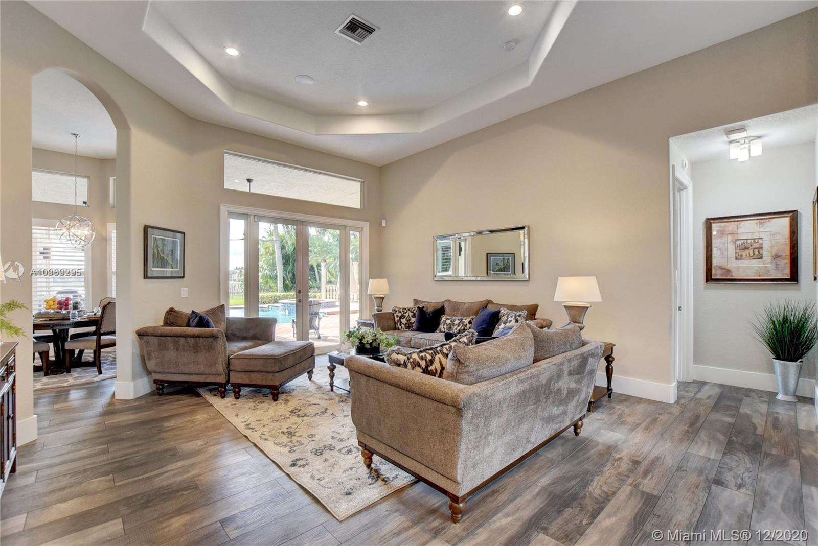 Gorgeous lake view from this immaculate, completely remodeled 5 bedroom + dedicated office + great room/3 bath residence in guard-gated Long Lake Estates. Impact glass windows/doors showcase generous yard, salt system pool w/raised spa, & wide view of the lake. Meticulously maintained & tastefully updated w/high-end finishes: porcelain wood tile flooring w/new 7.25" baseboards, quartz bathroom countertops, undermount sinks. Newer roof (2007) w/Roof-a-cide treatment, New a/c's, new Rheem water heater, new LG washer/dryer and all new Samsung & GE Profile kitchen appliances. U-line wine fridge, Plantation shutters, customized shelving in all closets. 3-car garage w/impact resistant garage doors, higher horse power motors & app-controlled entry. Whole-house water filtration/softening system.