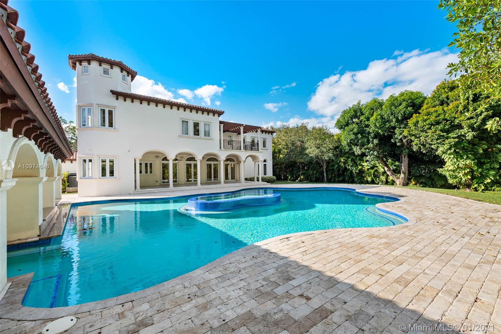 Superlative Mediterranean Masterpiece located on a stunning corner lot in coveted North Pinecrest. Awing interior with a soaring 2-story entry hall, huge windows, wood and marble floors, refined finishes & details. 5 bedroom, 5/2 bath perfectly spread designed over 7,628 SqFt of living area. Formal living and dining rooms, oversize chef’s kitchen with two cooking islands, WOLF and Subzero appliances and pool views is an epicurean dream. A spectacular oasis with heated salt water pool, expansive gazebo and patio with full summer kitchen – impeccably designed for entertaining inside & out. Full home generator, elevator, basketball court and three car garage complete this Pinecrest home.