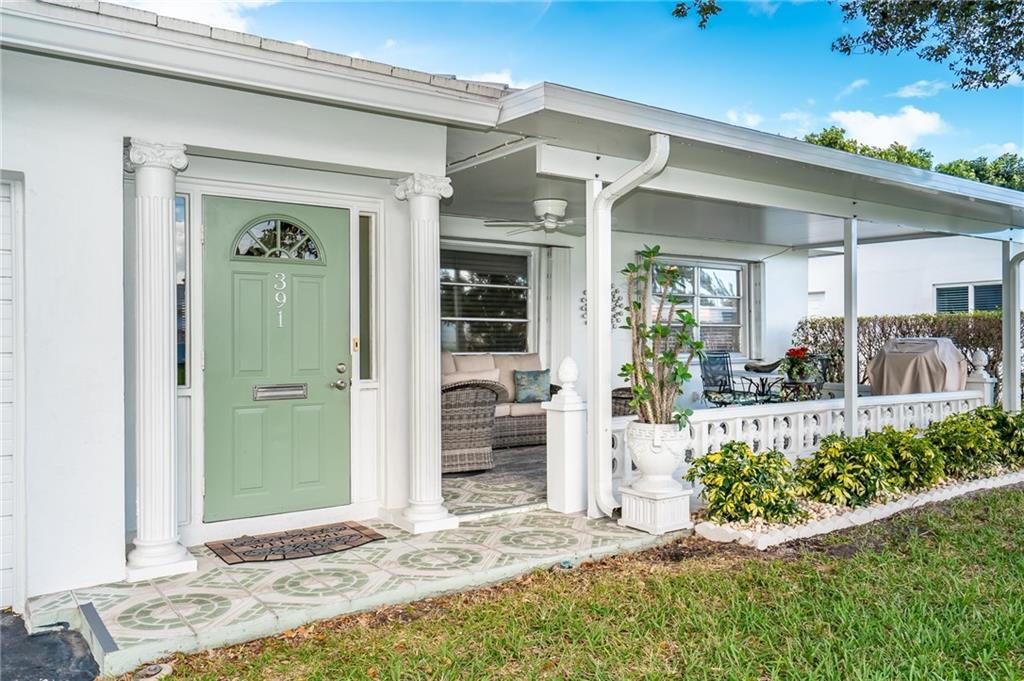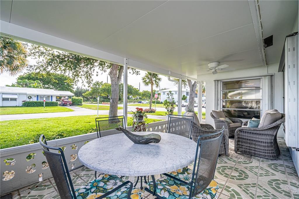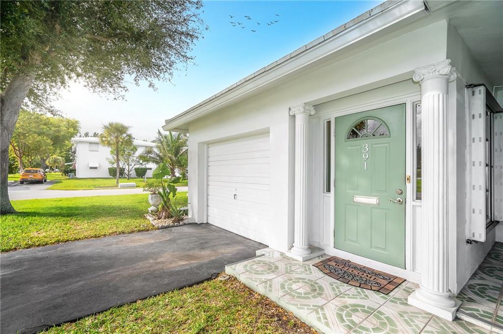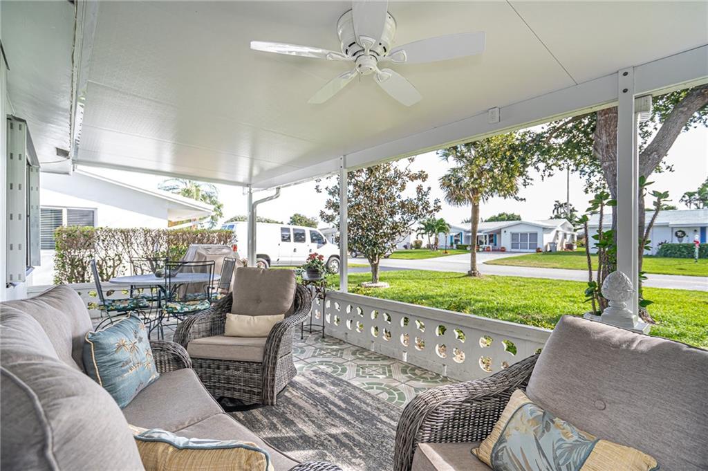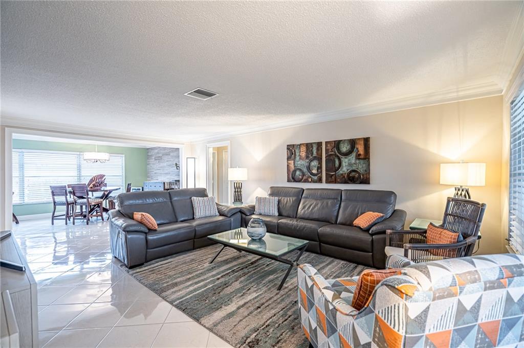 Modern, open concept featured in this bright and beautifully remodeled 2/2 home on corner lot. Garage & open front porch. Unique front foyer leads to a spacious eat-in kitchen w/huge picture window, modern design countertops and cabinetry and new stainless steel appliances +reverse osmosis water filtration system. Living area features beautiful tile and crown molding, continuing into Florida room/dining area. Unique lighting fixtures throughout. The design and decor of the completely renovated master and guest baths is fantastic! Bedrooms feature neutral laminate. And more!! NO LAND LEASE, 55+ Roof 2006 Newer A/C and water heater. Pets welcome! Maintenance includes water/sewer, 2 clubhouses with wifi, two pools, golf course, lawn maintenance, courtesy bus, and more!