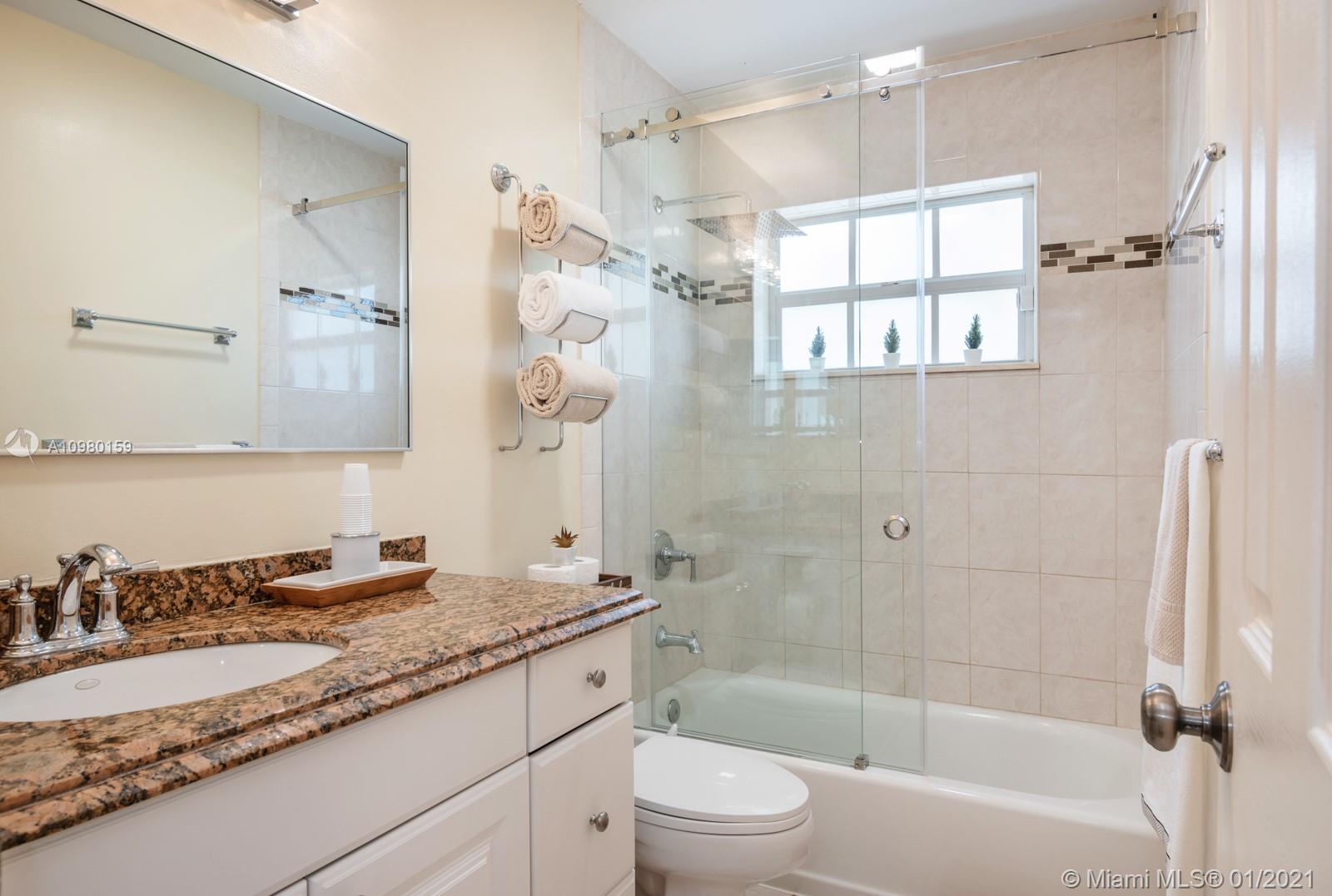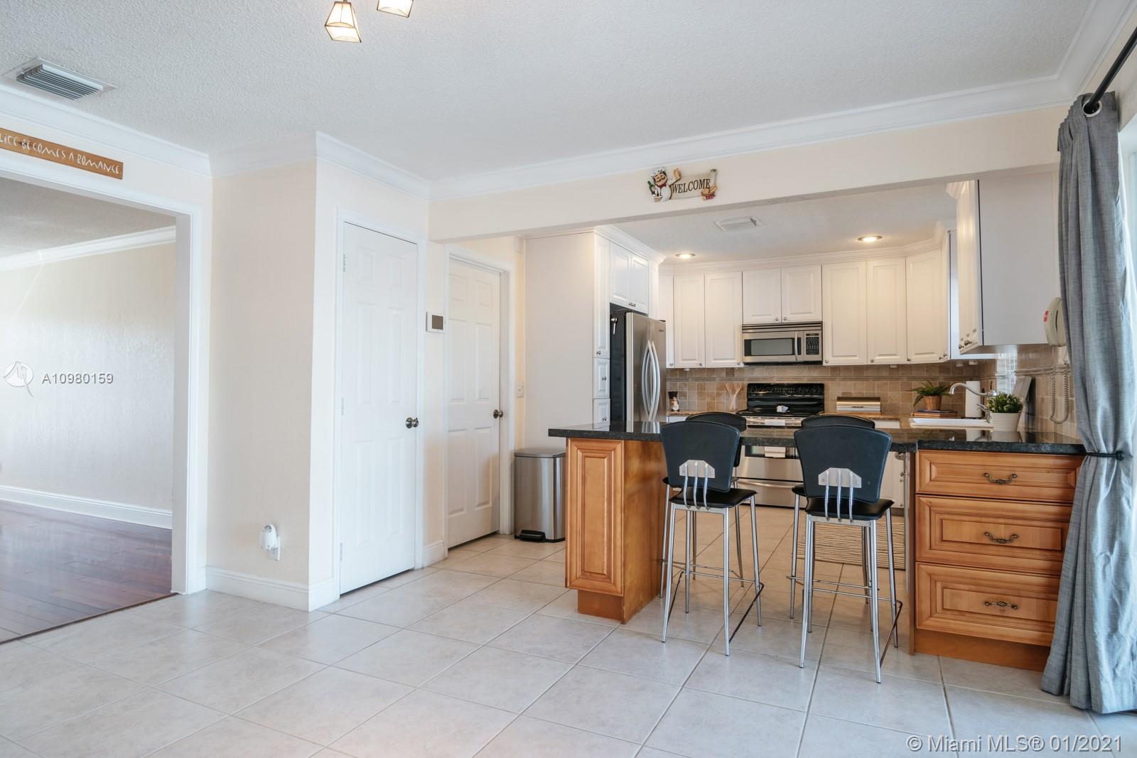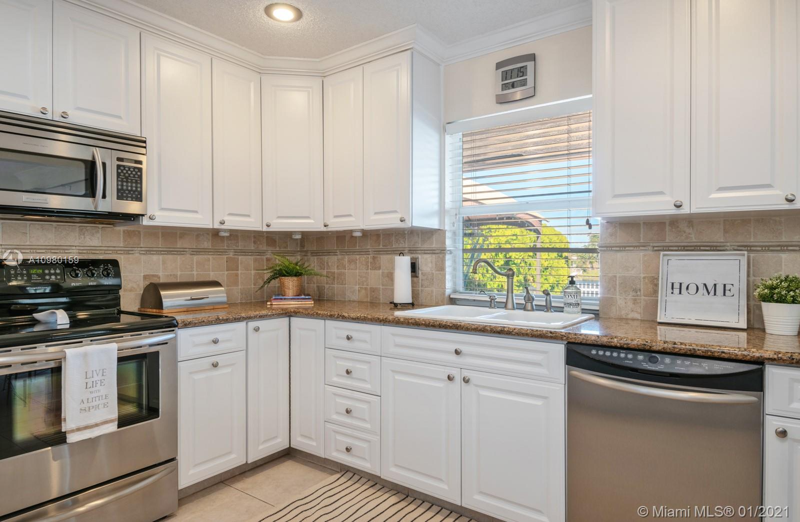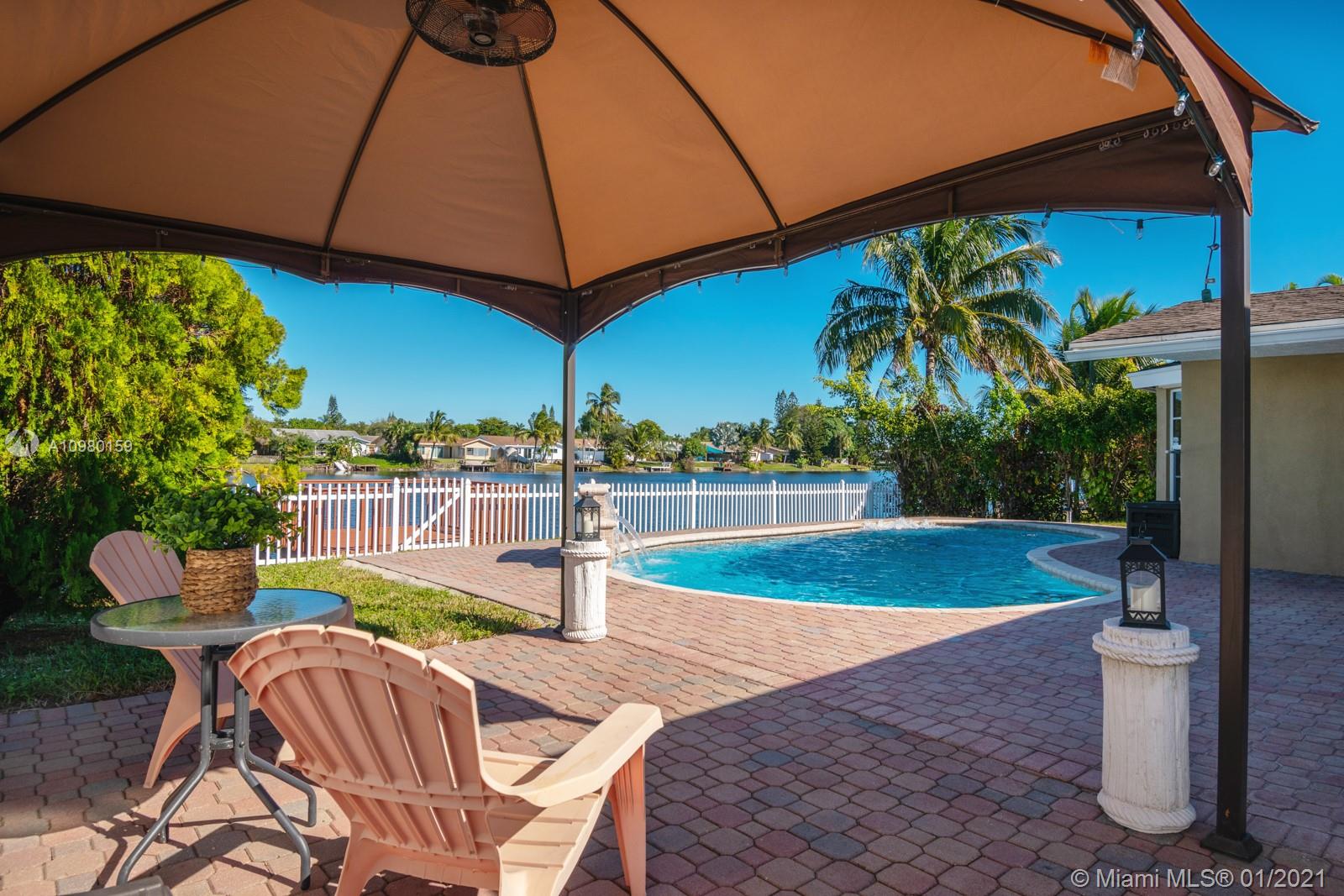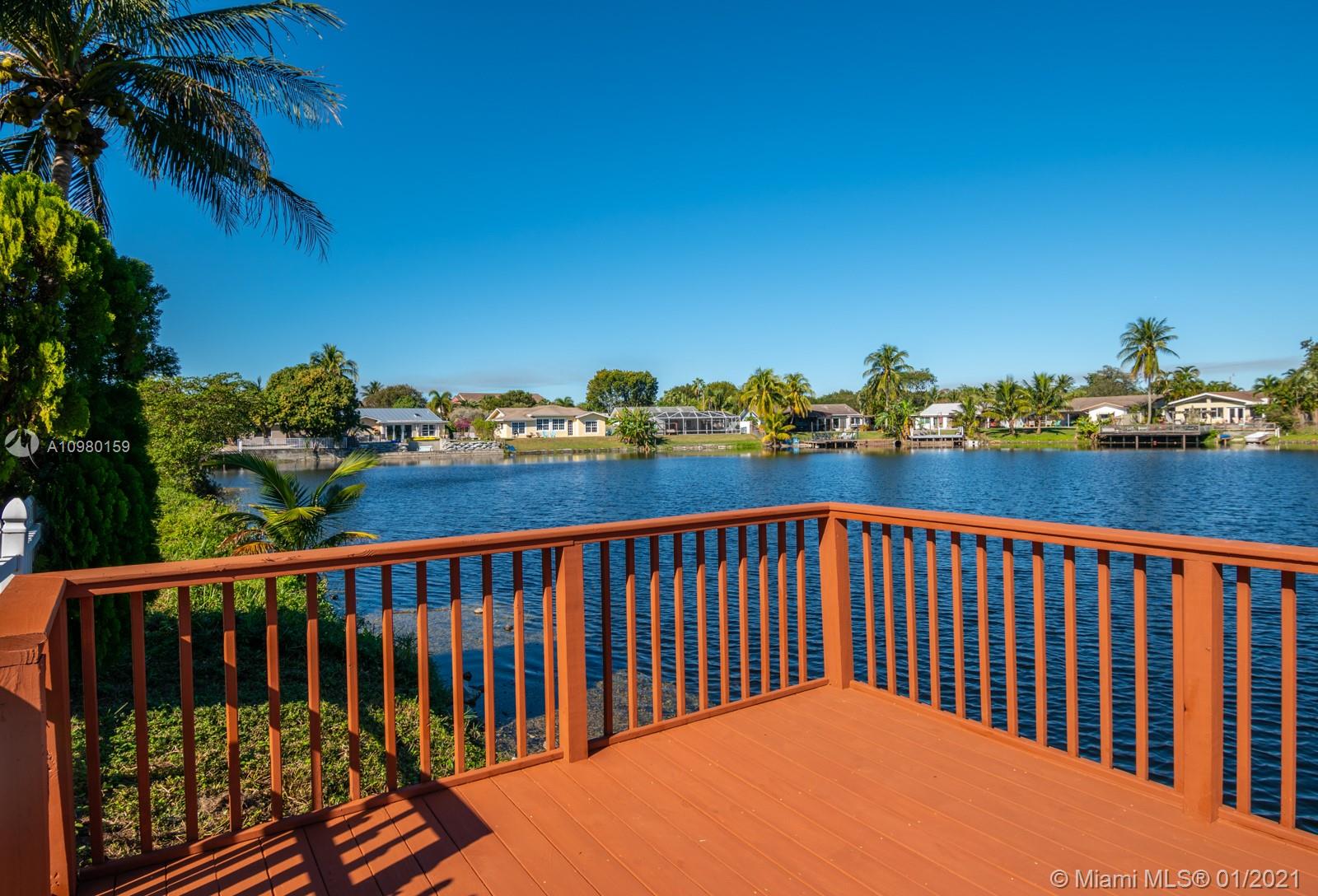 Home Sweet Home! Move-in-ready 4 bed/2 bath in Palm-Aire with sweeping lake views and heated salt water pool. Spacious white kitchen with granite counter tops, stainless steel appliances, breakfast bar, custom bottle rack, pass-through to outside, and generous storage. Primary bedroom features walk-in closet and bay window with relaxing water views. Both bathrooms renovated with new glass shower doors. Custom closet in one of the bedrooms. Brazilian cherrywood and tile flooring. Brand new deck on lake, fully fenced yard, NEW full-size washer and dryer (2020), tankless water heater (2018), and utility sink. Freshly painted exterior, adjacent storage room, extended 5-car driveway, sprinklers front and back, NEW AC package unit (2020). Storm ready with hurricane panels and generator hook-up.