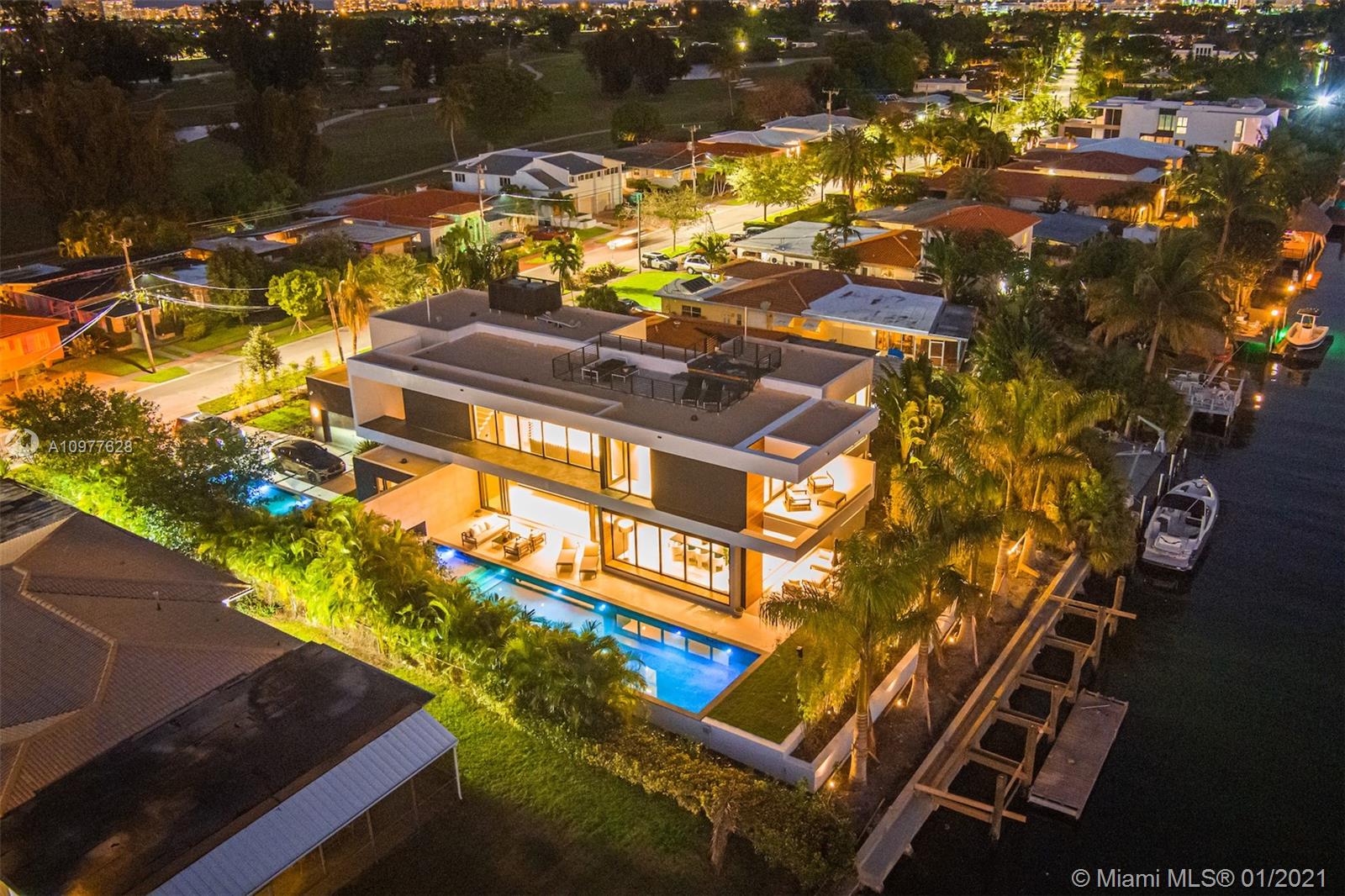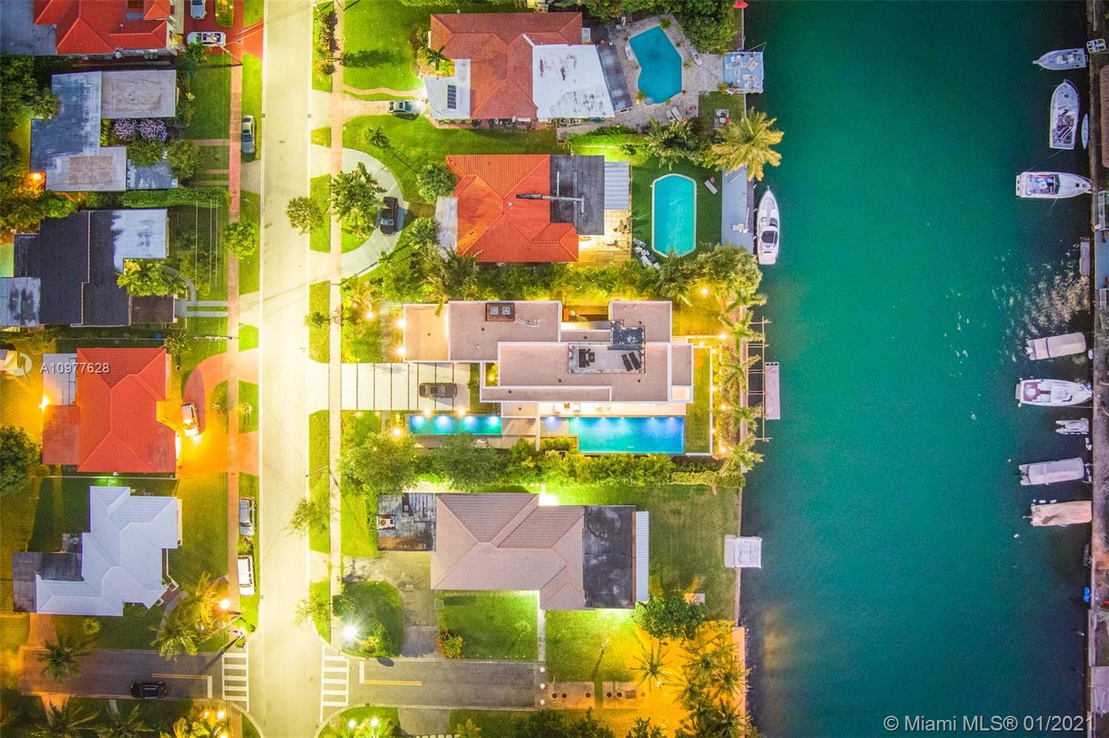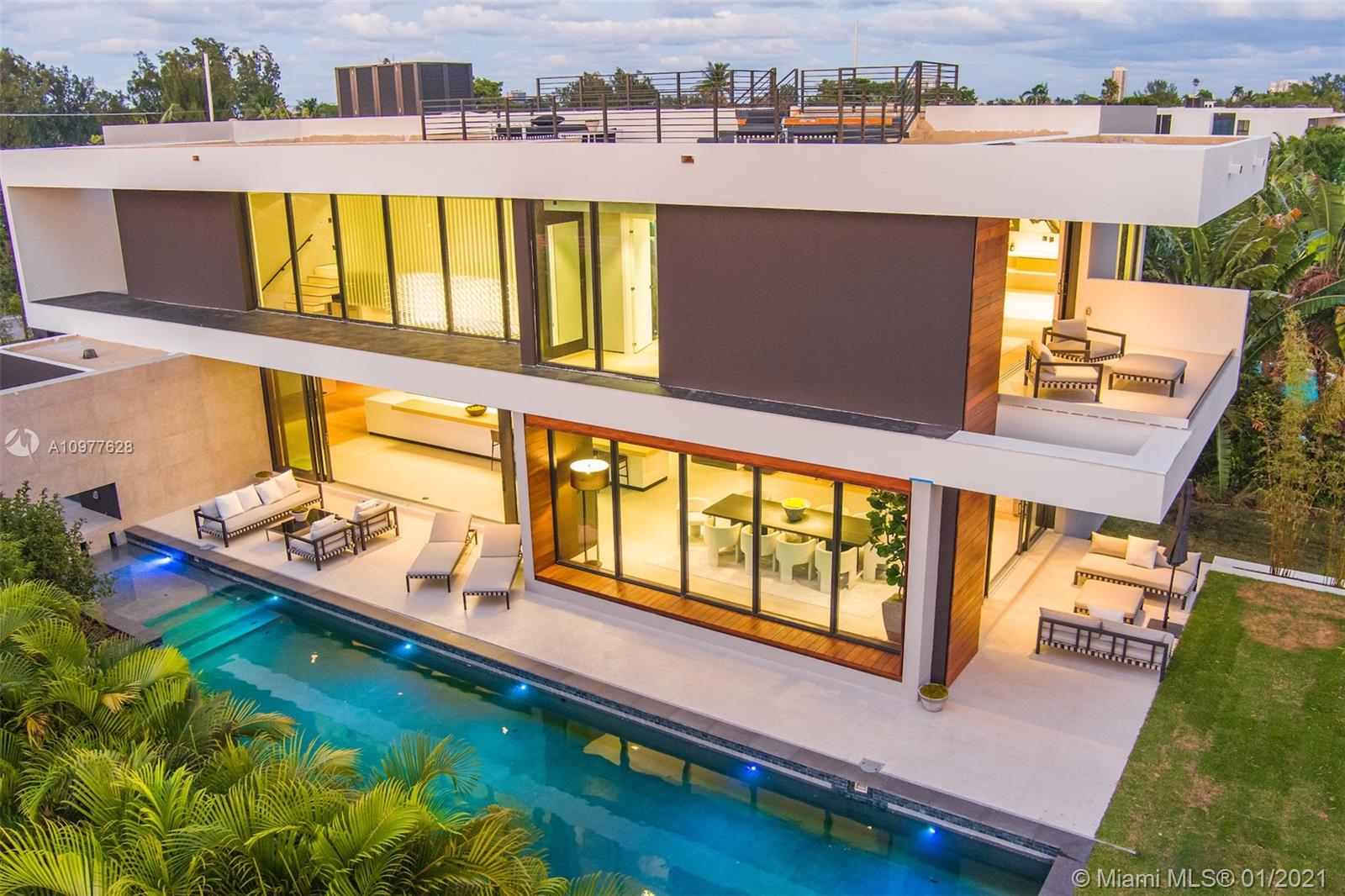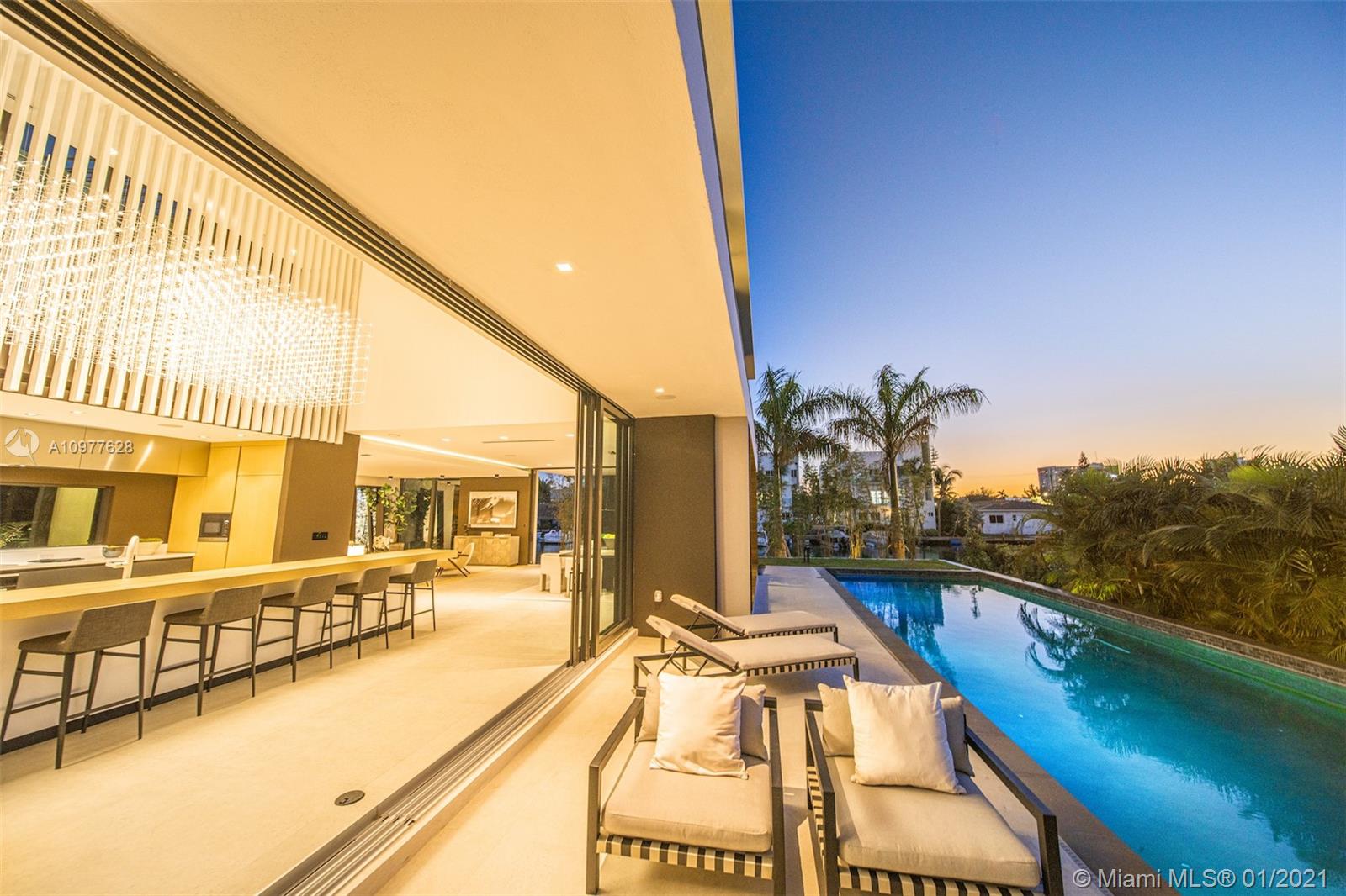Villa "L'Artiste" is a modern estate that sits in a quiet gated community encompassing the famous Normandy golf club and brand new tennis center. The property broadcasts 5 bedrooms with 5 en-suite bathrooms and 1 powder room.Boasting opulence and sophistication with design by Togu, the main level of the home provides a fully equipped kitchen with Miele appliances, a 22 foot bianquissimo quartz countertop, 20 ft high soaring ceiling and a 20 ft long LED Chandelier across the living area. A 500 sqft Rooftop overlooks the Golf course, the canal and the Bay. Full size sliding doors lead to a 55 foot long boat dock and oversized heated pool prolonged by a decorative 40ft pond. Finally, Villa "L'Artiste" is staged by Meredith Baer with Modern furniture to boast luxurious indoor-outdoor living.