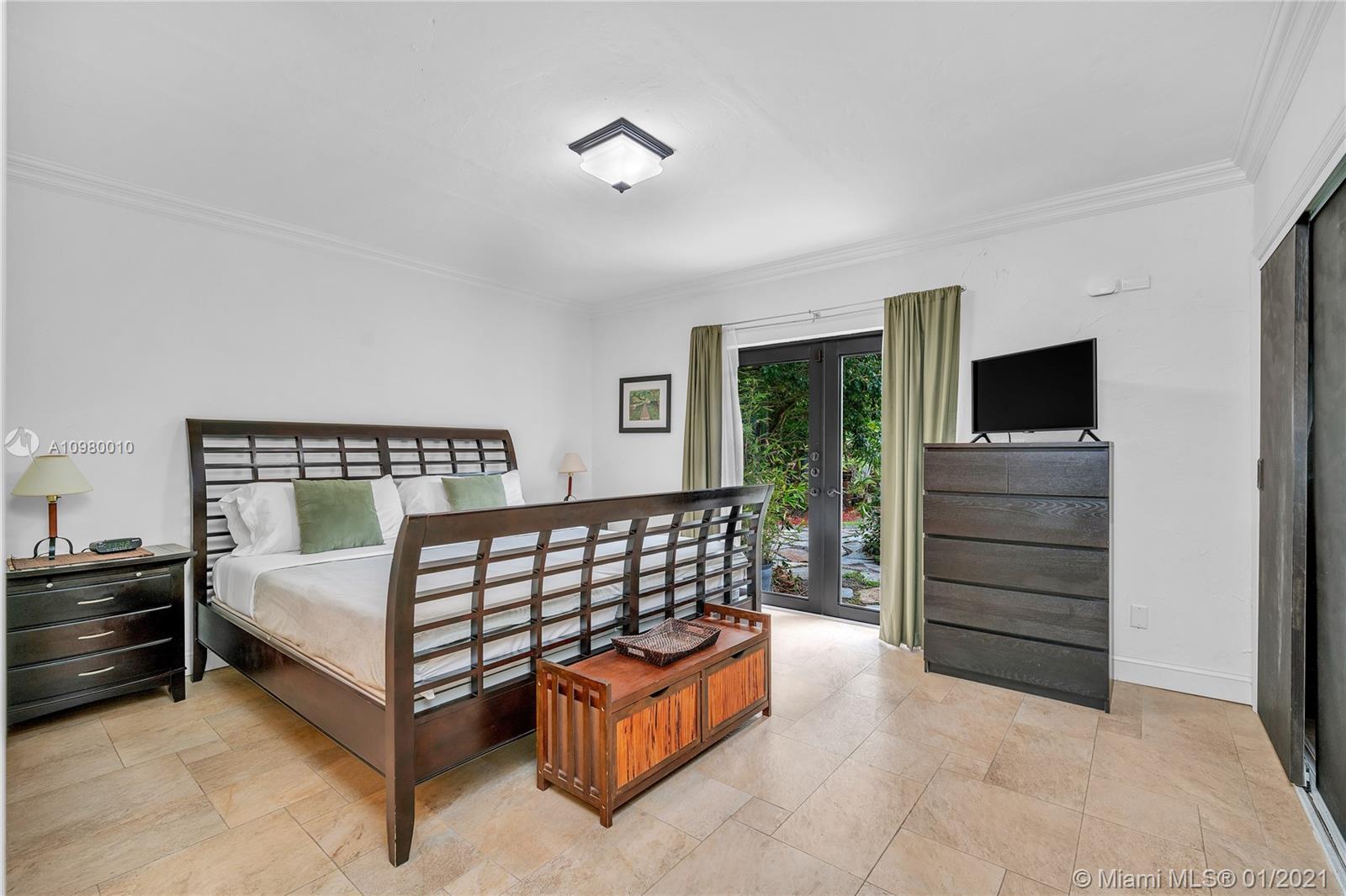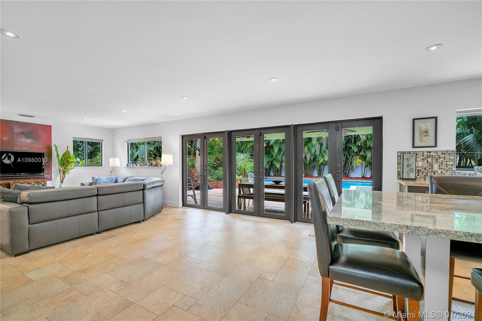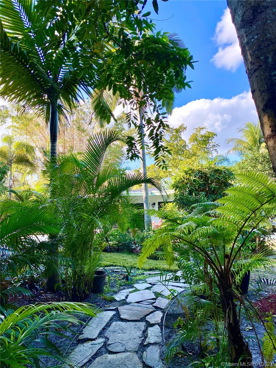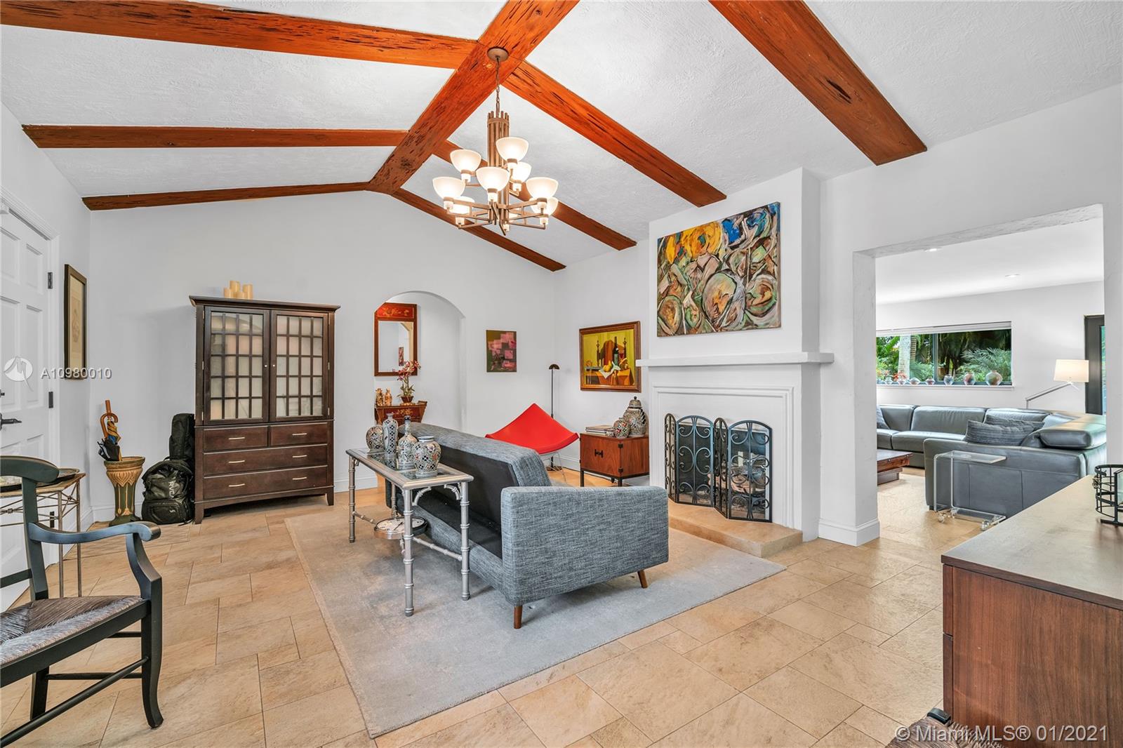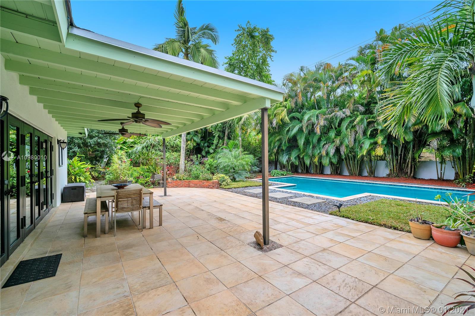 A cohesive mix of classic charm and contemporary style, this 3 bed/2 bath central Miami Shores home boasts unique features including living room with vaulted cypress ceiling, dual-sided natural-gas fireplace, and an expansive great room with modern kitchen and butlers pantry with its enormous custom island and views of your tropical gardens and gorgeous 36 foot swimming pool. There is room to grow on this double lot which includes specimen palms, fragrant Ylang Ylang trees, and productive fruit trees. There is a full sprinkler system that works with well water. The home's square footage is larger than recorded. Appraisers sketch is available on request. Walking distance to shops, parks, and restaurants, come and see why this hidden paradise retreat should be the one you call home.