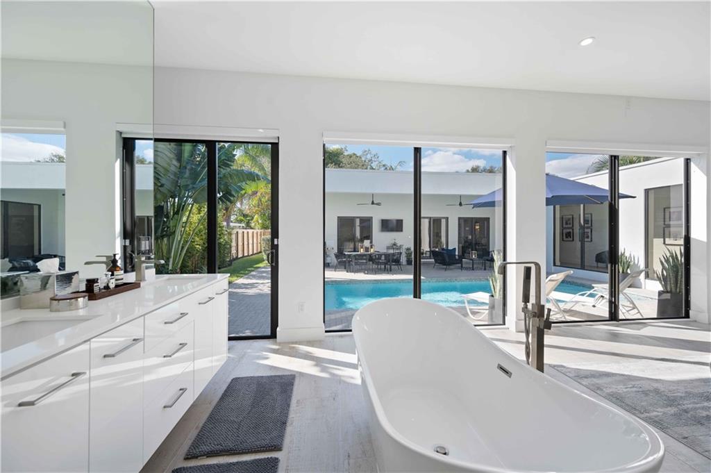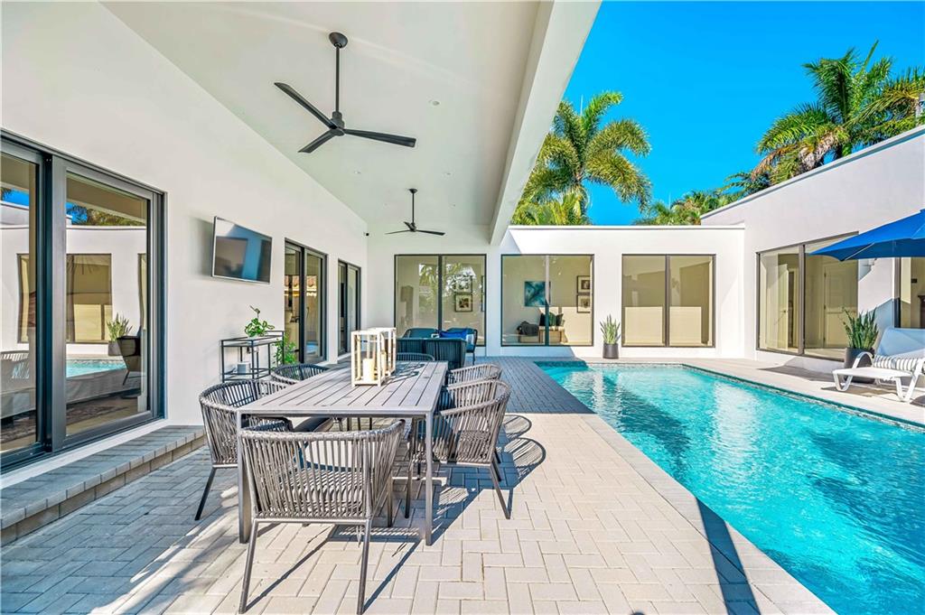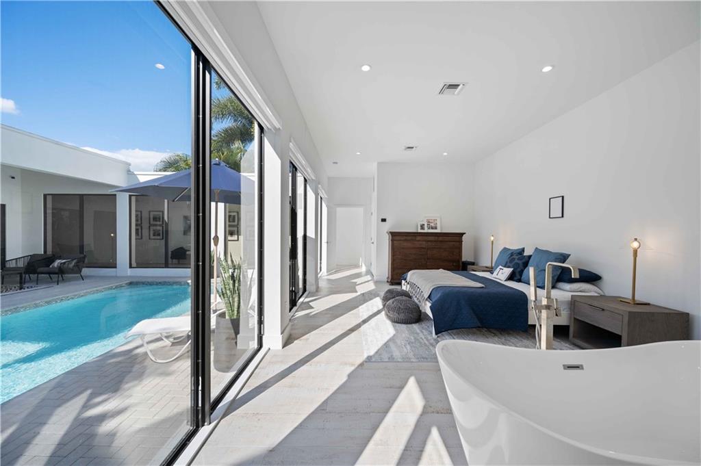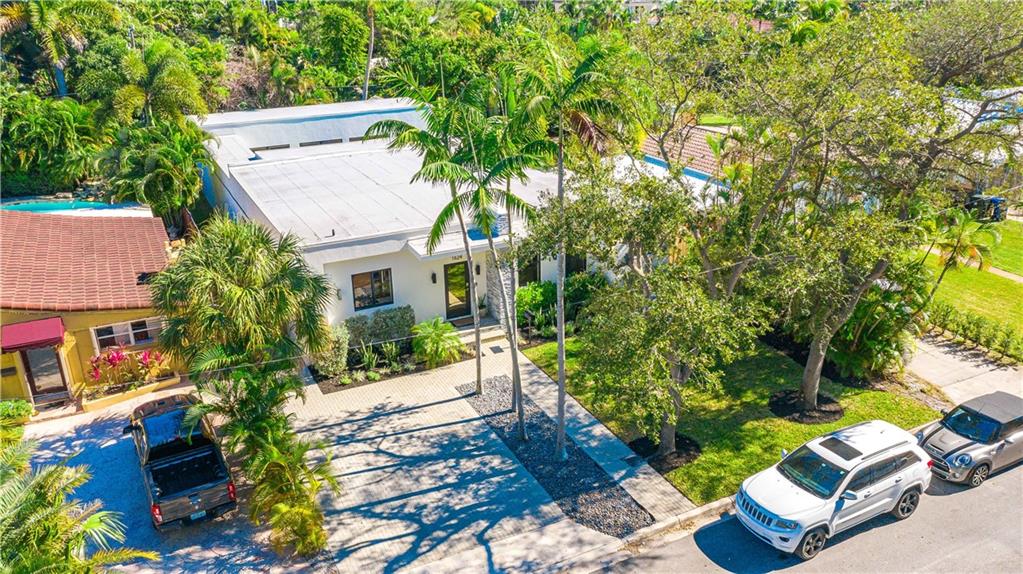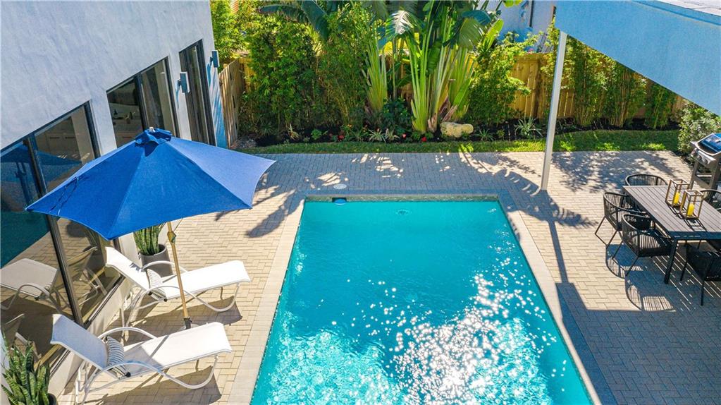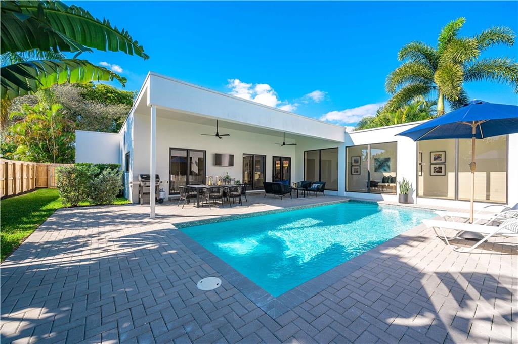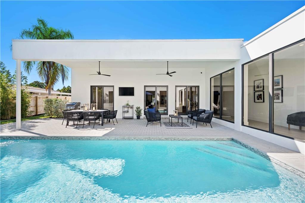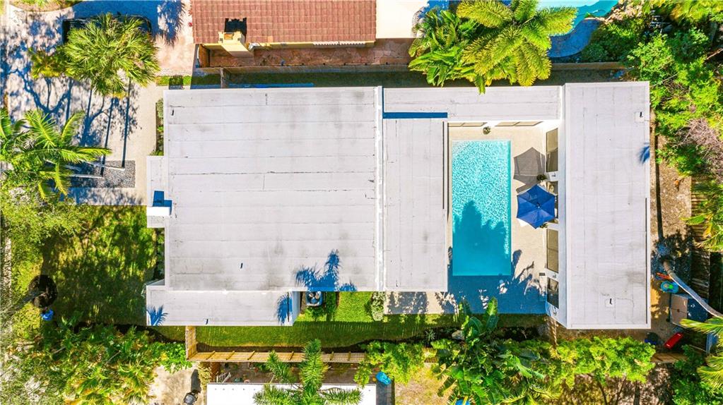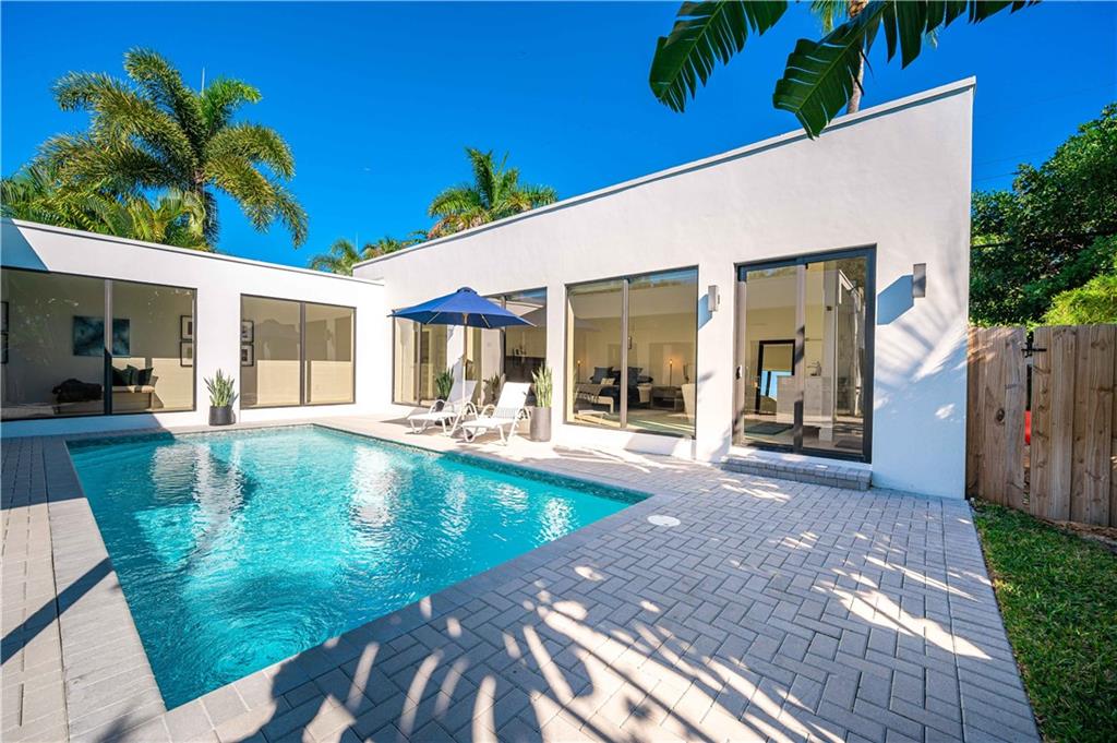 Distinct Miami Modern artfully designed surrounding a central courtyard pool making the pool into a centerpiece. Also a wide sundeck and generously sized covered terrace. All impact rated window walls and doors provide access from almost every room. Created for our casual Florida lifestyle this sun filled home transforms to a glowing glass box as evening sets. The two guest rooms each have generous closets, high ceilings and in-set lighting. The primary suite, with its own a/c features an integrated bath with a dramatic soaking tub and separate shower. The fully fenced rear yard offers an additional area away from the pool that is perfect for pets or a child's play area. Located in the heart of very desirable Poinsettia Heights, this home is convenient to shopping, dining parks & beaches.