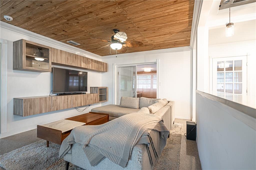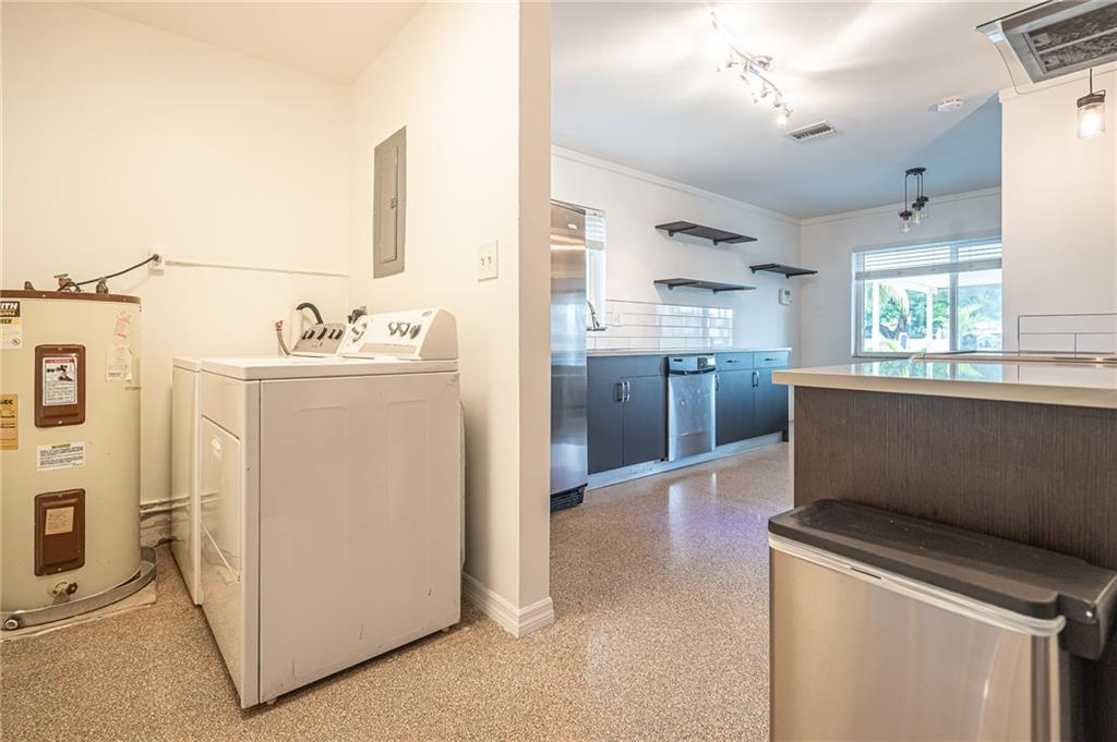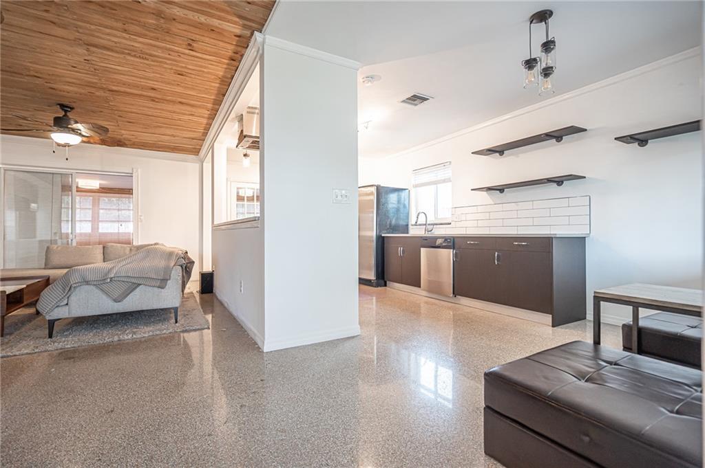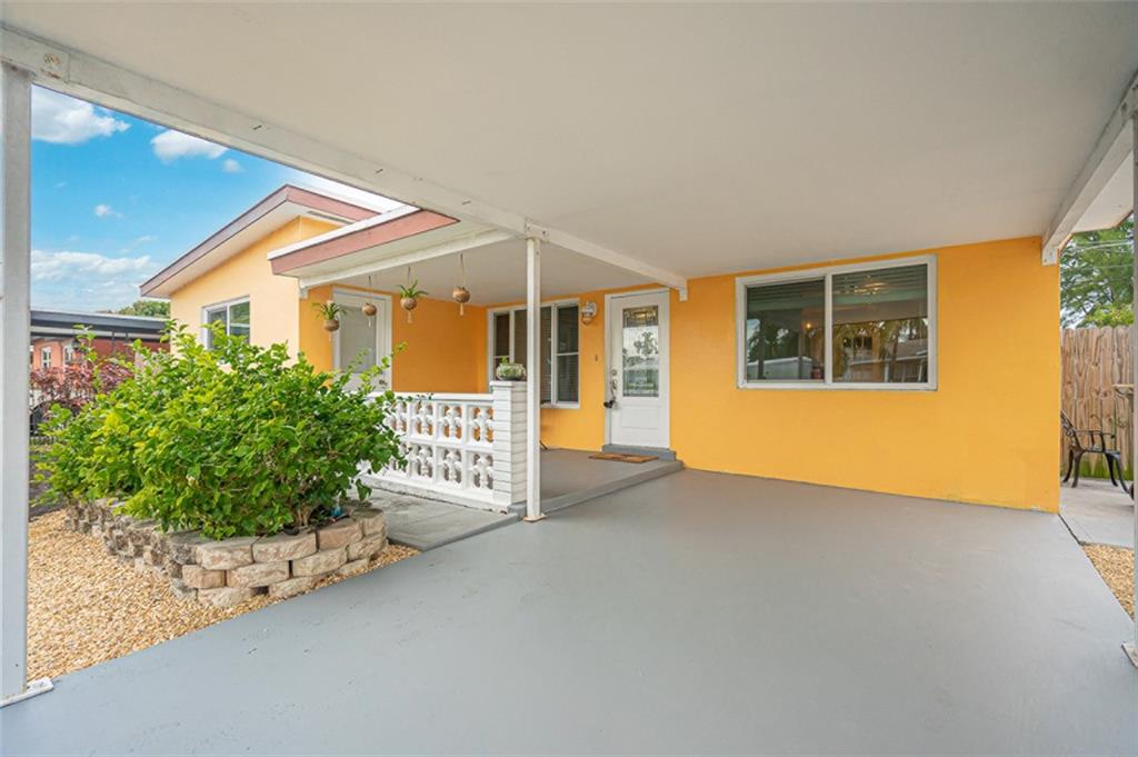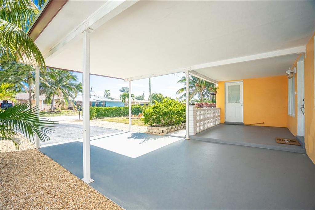 As you enter the main living room of this 2 bed/2 bath plus den you are greeted with Florida terrazzo floors and a beautiful cedar wood ceiling complete with built-in floating console cabinets, ceiling fans & contemporary lighting fixtures. The newly renovated open kitchen coupled w/the huge back yard including a vegetable garden & privacy fence make this a wonderful home for family gatherings & entertaining friends. Upgrades include; updated bathrooms, new A/C 2019, hurricane windows throughout (except for the den), & all cast iron pipes replaced with PVC piping, 2019. This is a true "TURN KEY" home that has been meticulously maintained & is ideally located just minutes to shopping, restaurants, the beach, & I-95. A unique combination of modern finishes & traditional Floridian charm.