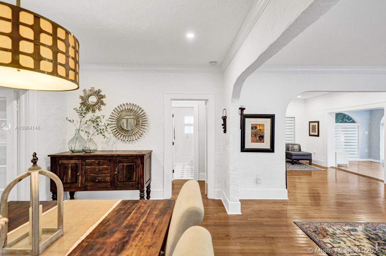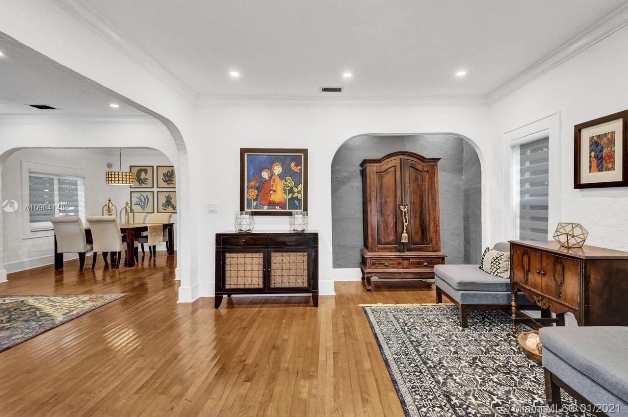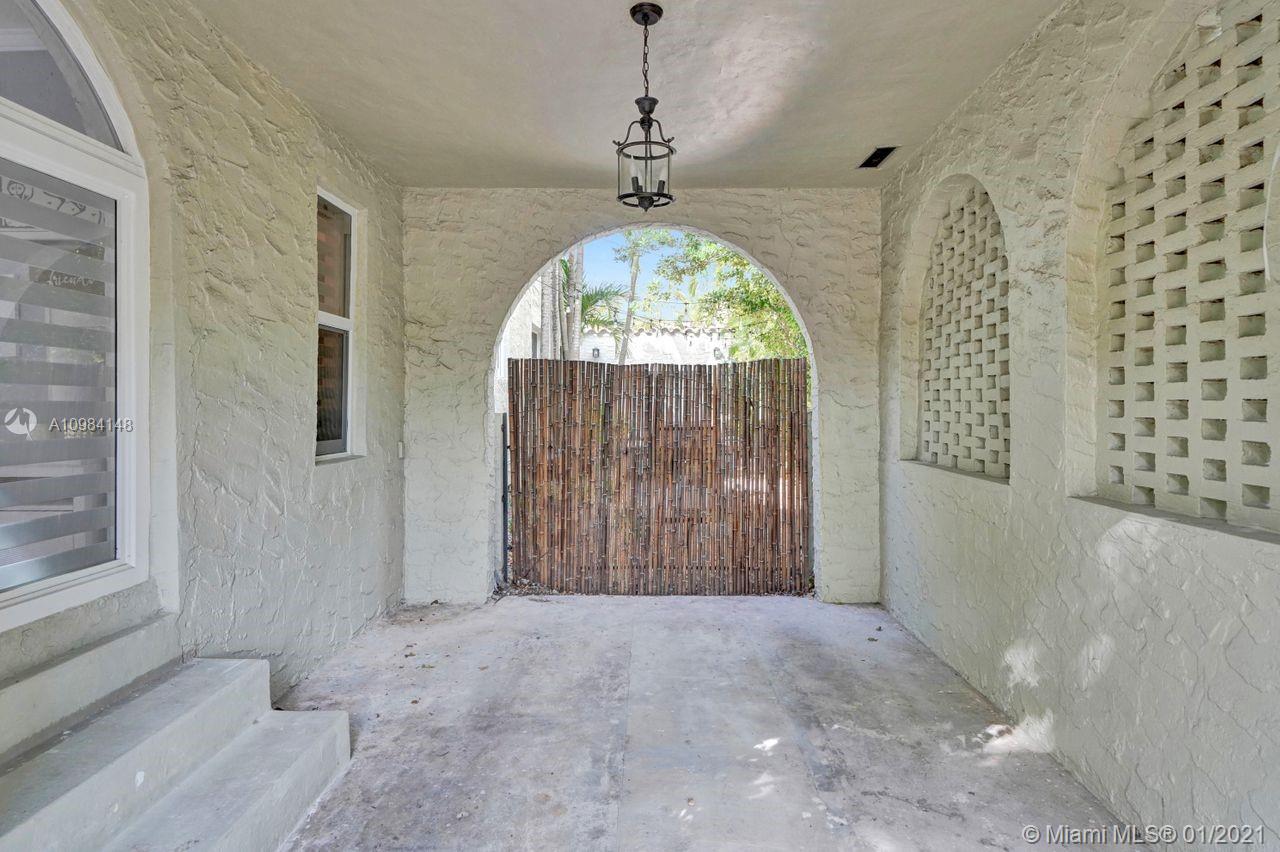 Renovated Old Spanish home with 1,976 sf on quiet N Gables street. Features include 3/2 main house + separate bonus room + carport. Newly updated maintaining architectural elements including original spiral columns, wood floors, decorative mantle & original arches. Foyer entrance with enclosed front porch perfect for home office leads to formal living room, bonus living area & separate dining room. Designer ktchn with white quartz counters, custom cabinetry & walk in pantry renovated 2017. Spacious master bath with double sinks, separate shower & tub renovated 2019 & walk in closet. Converted garage offers flex space for office/den + storage. Roof 3.5 yrs old, impact windows, telescoping door, a/c & water heater installed 2020. Private back and separate side patio perfect for entertaining.