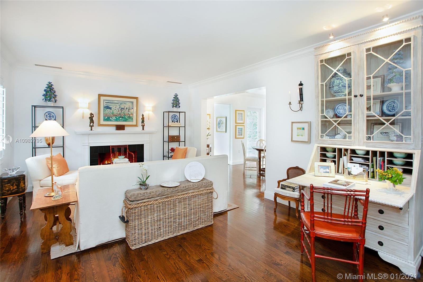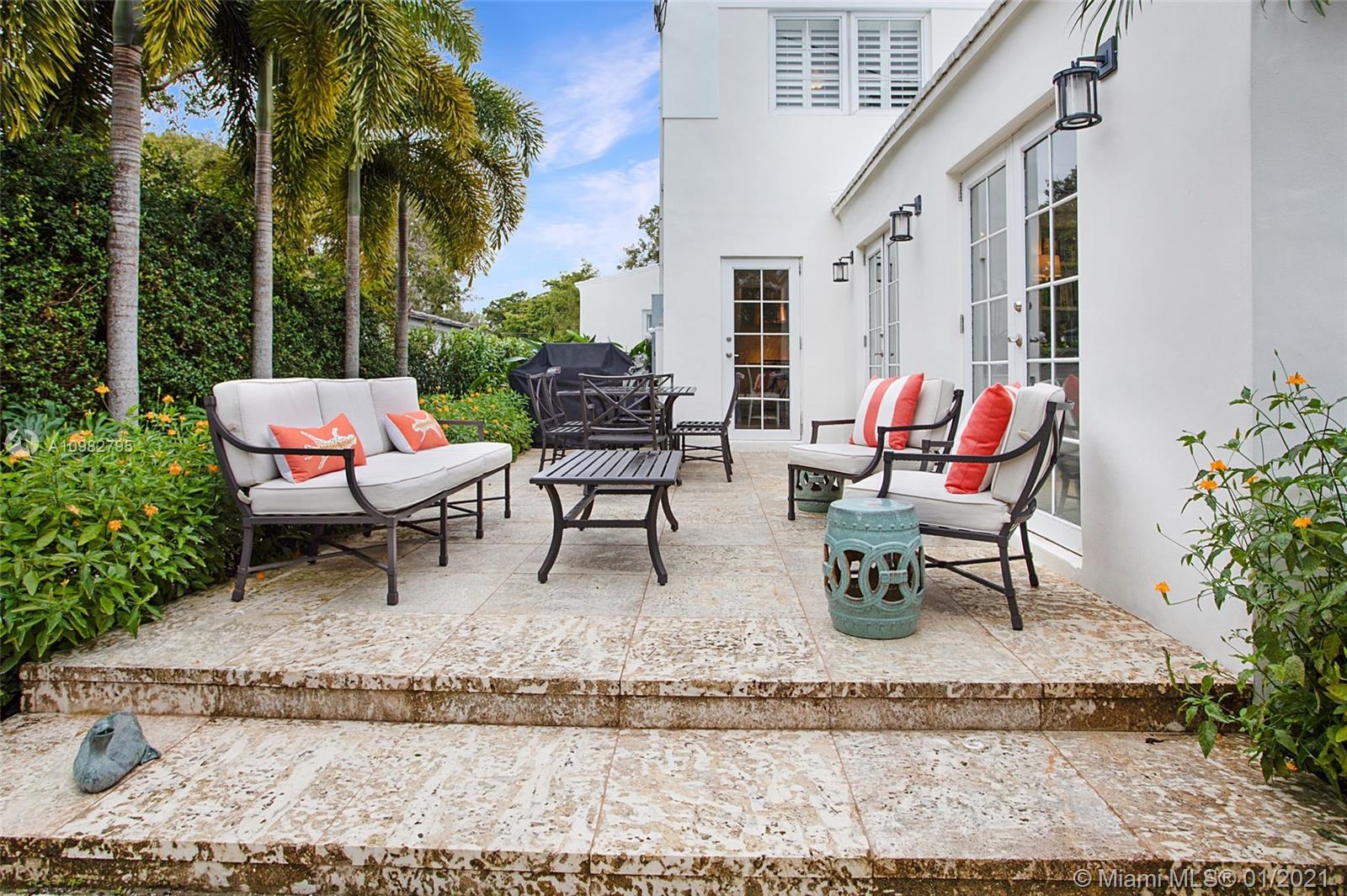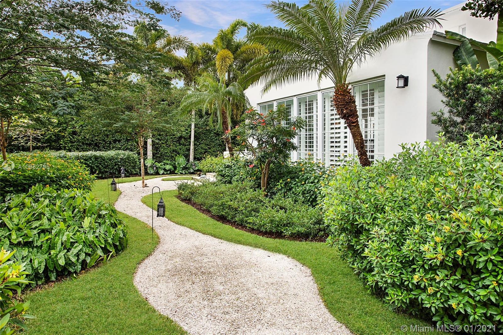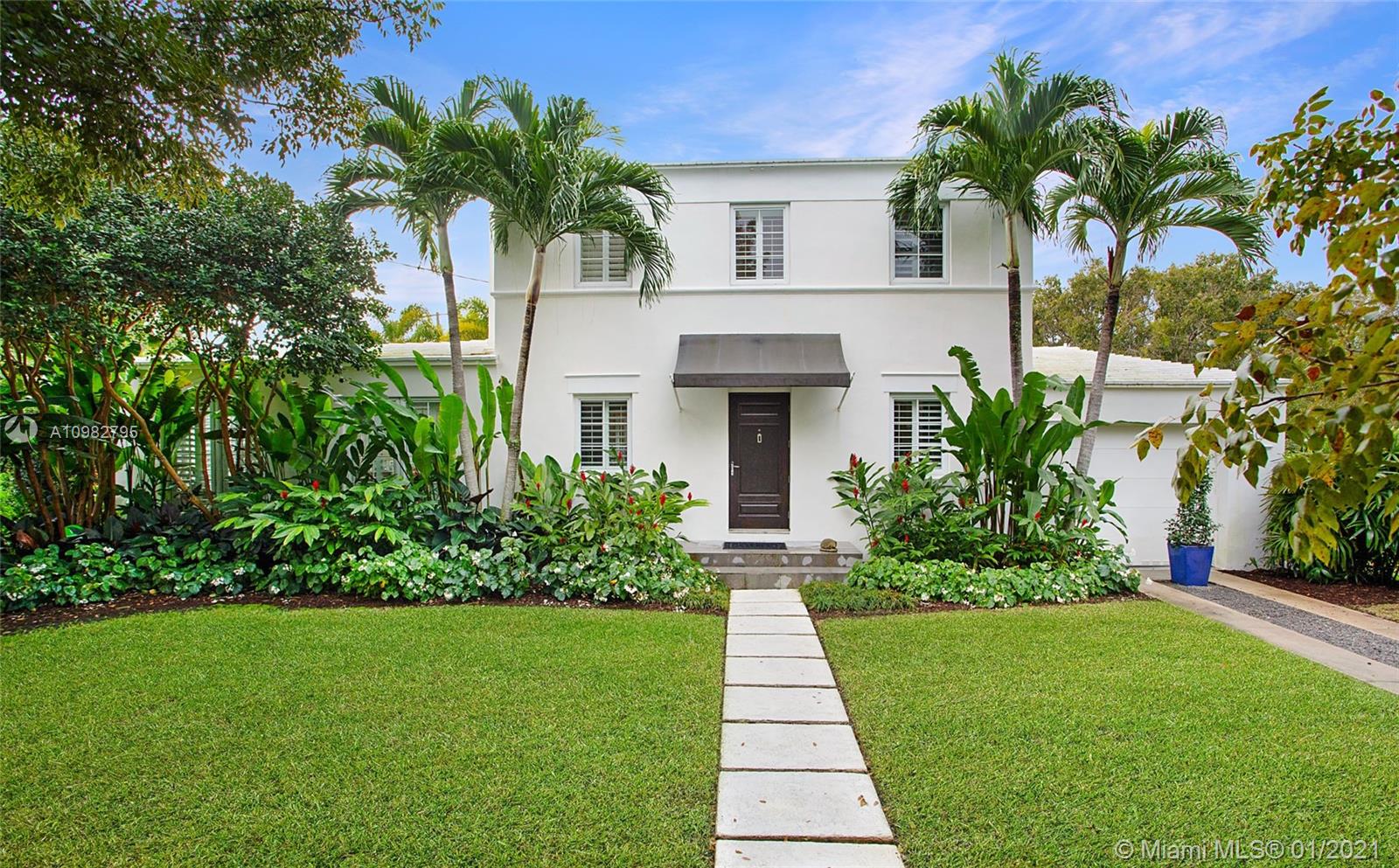 Gorgeous, charming and impeccably maintained home in highly desirable Golden Triangle neighborhood on a corner lot. Over 2,300 sqft living area includes a classic living room and fireplace, a bright kitchen open to dining room, and a spacious family room featuring a built-in bar and bookcases. Enjoy the gardens with beautiful landscaping, a walking path and comfortable patio. Conveniently located on the first floor is one full bathroom and bedroom. Upstairs find the primary bedroom with walk-in closet, third bedroom and full bathroom. A one-car garage neatly fits laundry area and storage, and outside a private side yard for playtime or perhaps adding a pool. All impact glass, all new septic system. A quiet and central neighborhood with sidewalks, and proximity to the best of Coral Gables!