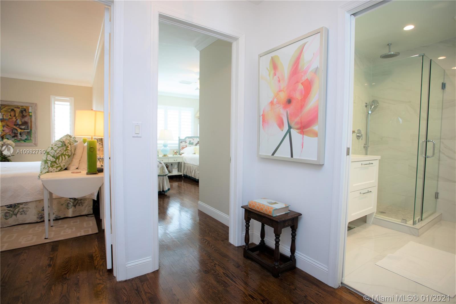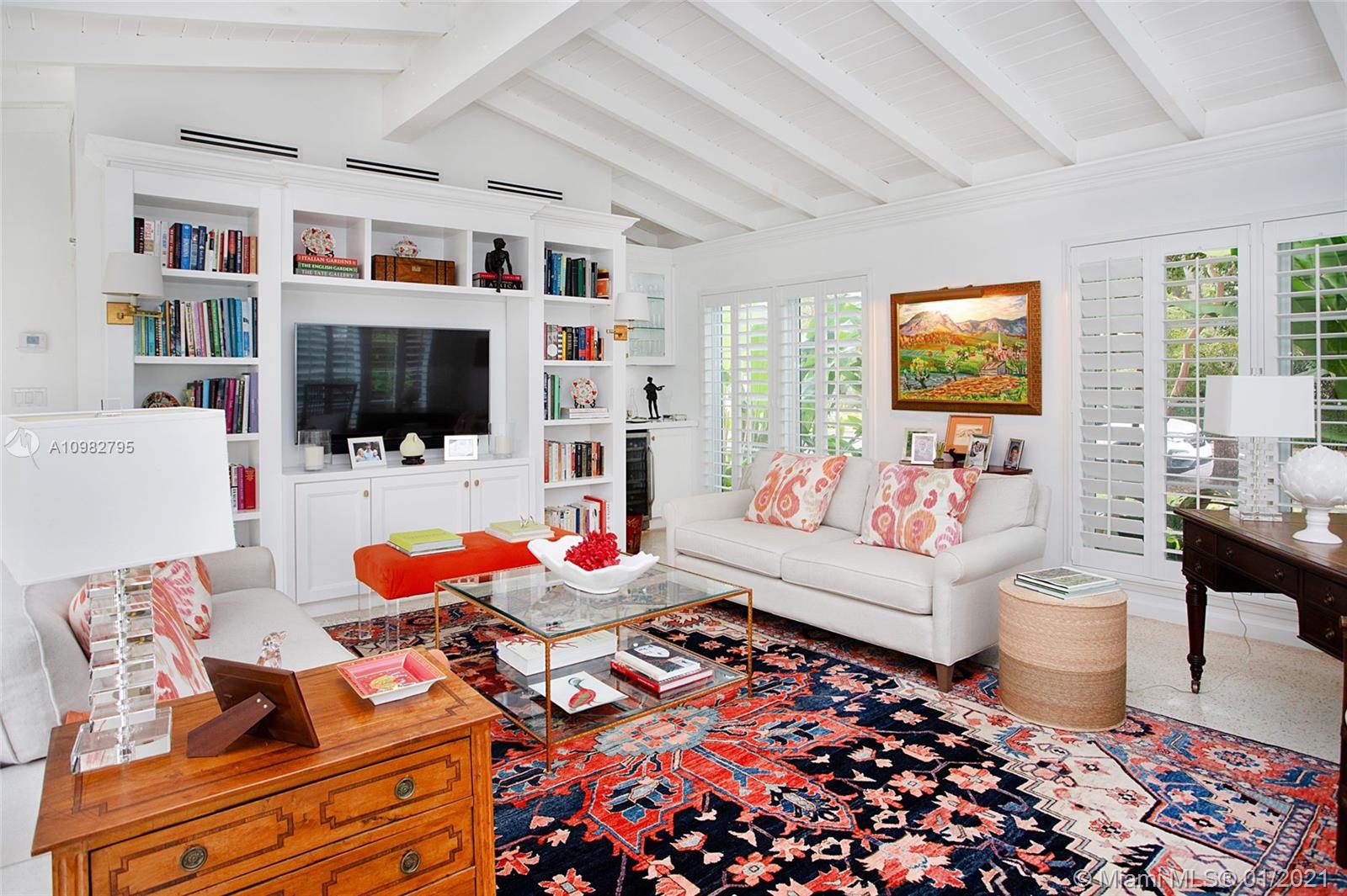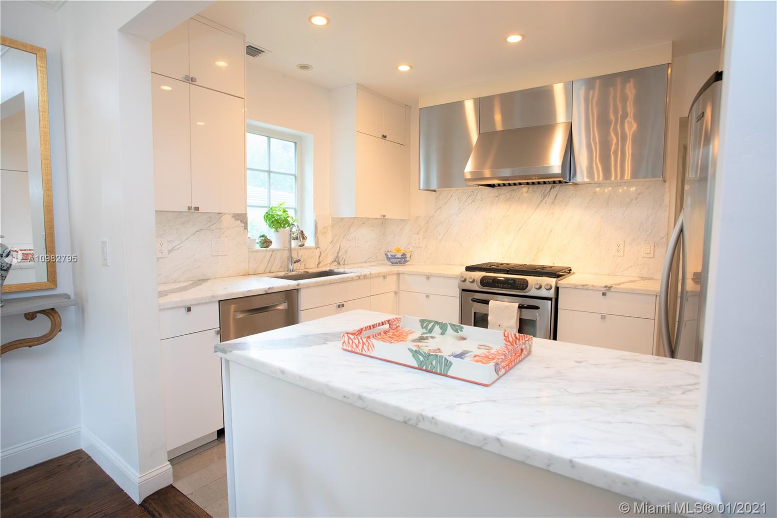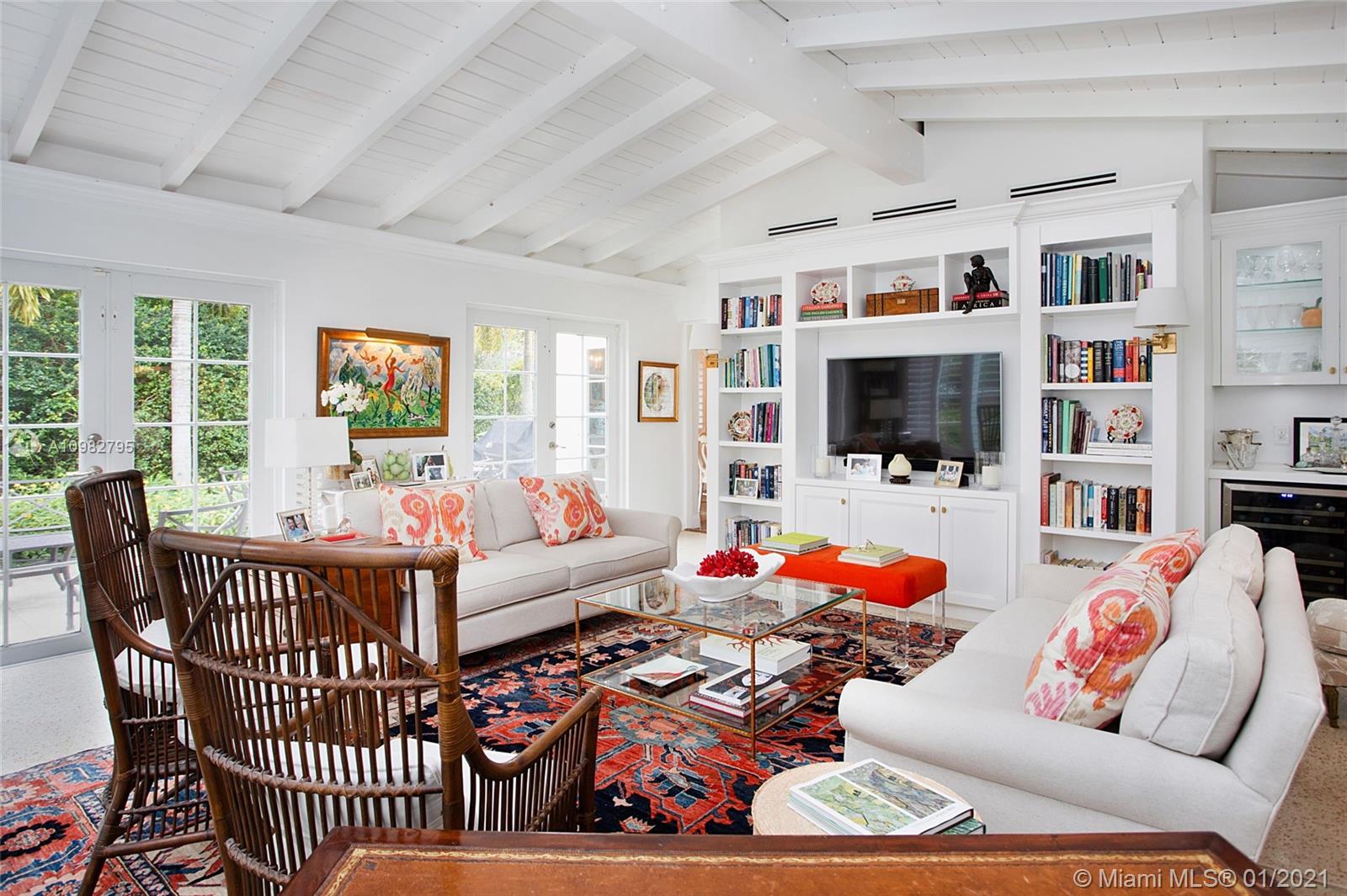 Gorgeous, charming and impeccably maintained home in highly desirable Golden Triangle neighborhood on a corner lot. Over 2,300 sqft living area includes a classic living room and fireplace, a bright kitchen open to dining room, and a spacious family room featuring a built-in bar and bookcases. Enjoy the gardens with beautiful landscaping, a walking path and comfortable patio. Conveniently located on the first floor is one full bathroom and bedroom. Upstairs find the primary bedroom with walk-in closet, third bedroom and full bathroom. A one-car garage neatly fits laundry area and storage, and outside a private side yard for playtime or perhaps adding a pool. All impact glass, all new septic system. A quiet and central neighborhood with sidewalks, and proximity to the best of Coral Gables!
