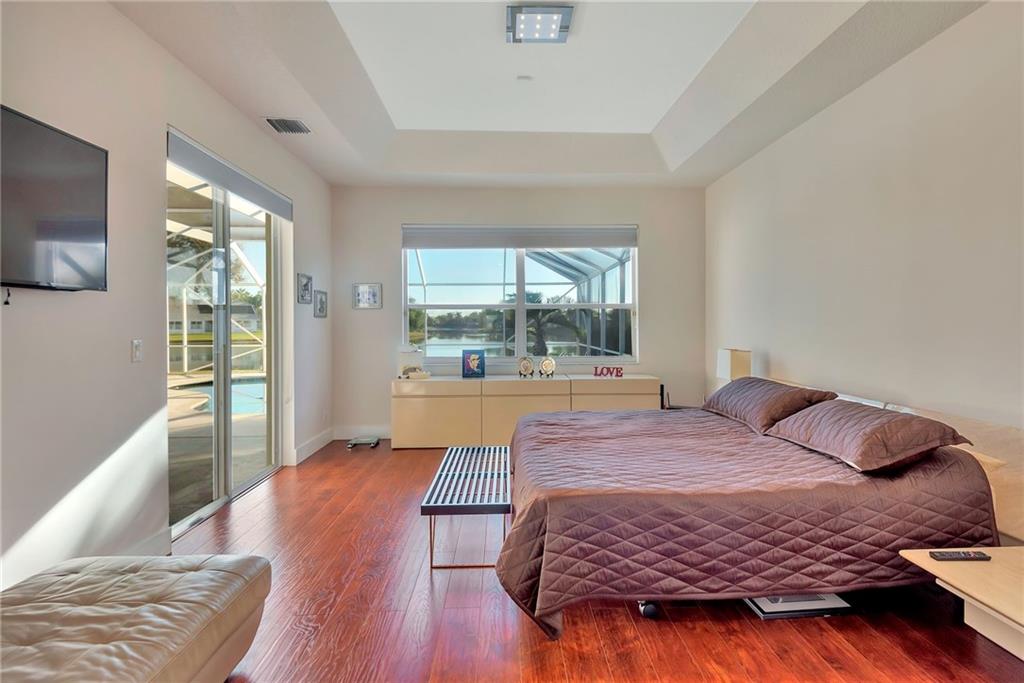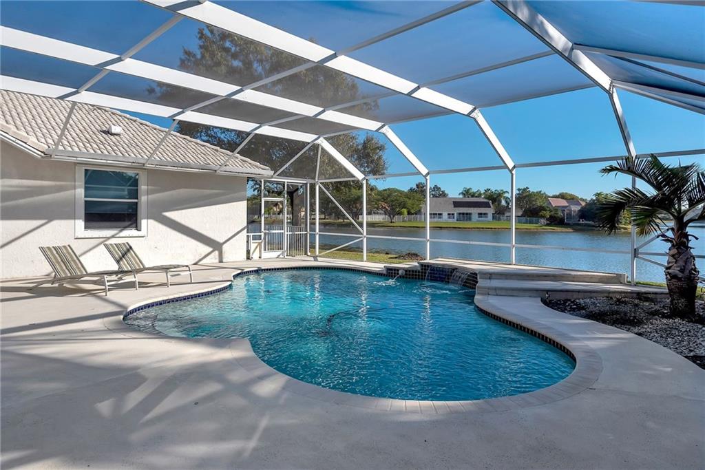 A MUST SEE!. Breath taking view from Pool and Lake. 5 Bedrooms 3 Baths, 5th bedroom used as office it can be converted into bedroom. Split layout w/screened pool, 3 car garage, large laundry room w/sink and storage shelves. Abundant windows & beautiful natural light. Very spacious Master Suite with 2 large custom built walk in closets, renovated bath with stand alone tub. Tiled in the main living areas, new flooring in the master bed and office, updated baths w/new calacatta quartz kitchen island. Great gated community with low HOA, tot lot and tennis court. Walk or bike to A rated elementary. Top rated middle and high school as well. Gated community, convenient to everywhere but in a secluded setting. ***MUST FOLLOW COVID PROTOCOLS DURING SHOWINGS. MASKS ARE REQUIRED***
