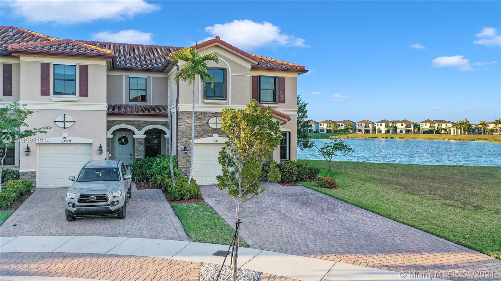Presented by LIFESTYLE international realty is a immaculate Corner Lakefront townhouse 4 bed /2.5 bath which features a 4 car driveway and a one car garage nestled in the family oriented resort style neighborhood of BONTERRA. Enjoy tranquil lake views from your own backyard or step inside your mediterrean constructed home with quartz counter tops , stainless steel appliances, and in home washer and dryer units. The property has new accordion hurricane shutters ,a fenced backyard, and ceramic tiles on first floor & plush carpet on the second floor.The clubhouse offers great amenities such as full gym ,game rooms, conference rooms and a resort style pool. PLEASE follow CDC guidelines wear a mask to showing.Property is located in a gated community with private security.