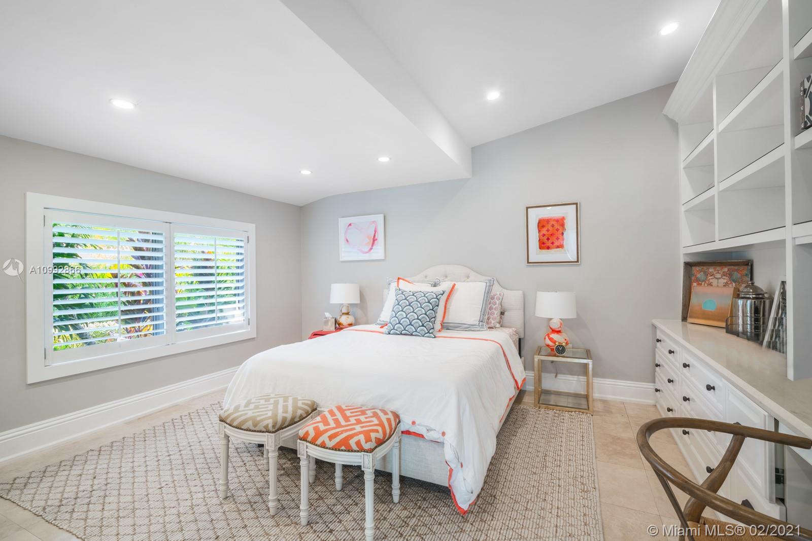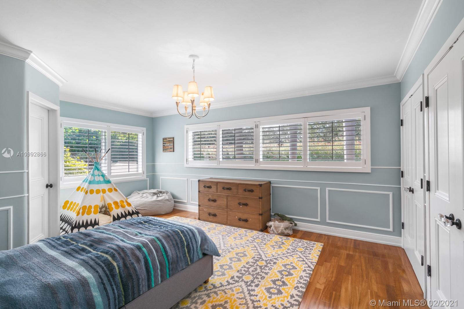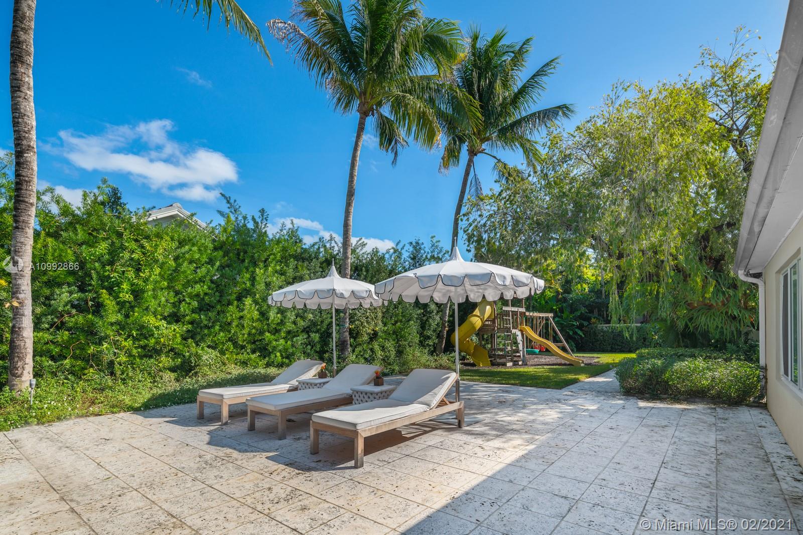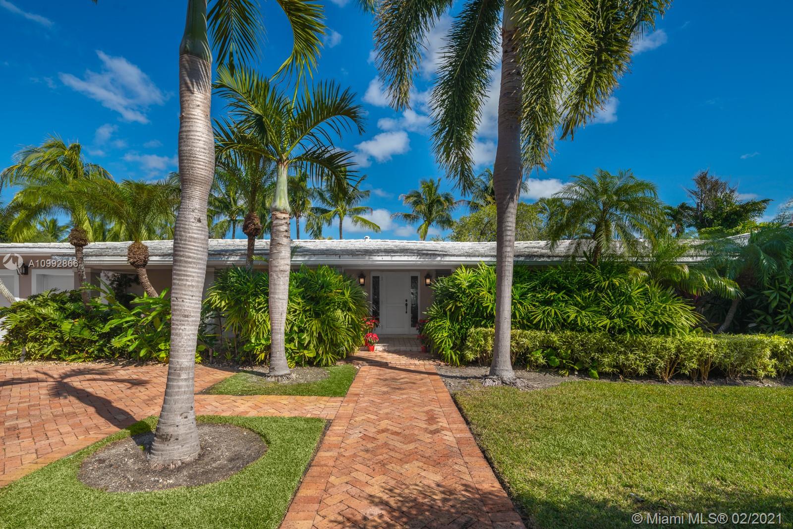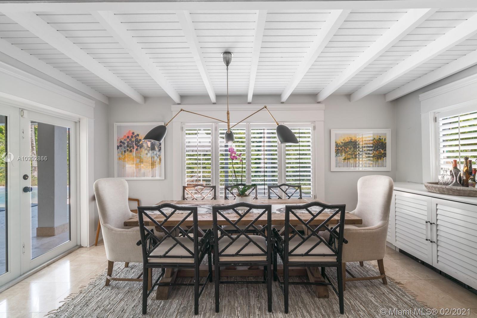 Beautiful 4,818 total Sq. Ft. midcentury modern Coral Gables home with exposed wood beam ceilings, plantation shutters, built-in bookshelves, and travertine floors. Open floor plan with abundant light from impact doors and windows. This jewelbox house includes 4 bedrooms, 4 bathrooms, a family room with plantation doors leading into a formal living room, and a formal dining room with a built-in bar console. Entertain in a sleek eat-in kitchen with breakfast area, marble countertops, and appliances by Wolf, Miele, LG, and SubZero. Lush 18,146 SF lot, ample driveway, spacious 2-car garage, with laundry room and built-ins. Kids playground, heated pool with beach entry, full cabana bathroom, and a whole house diesel generator.