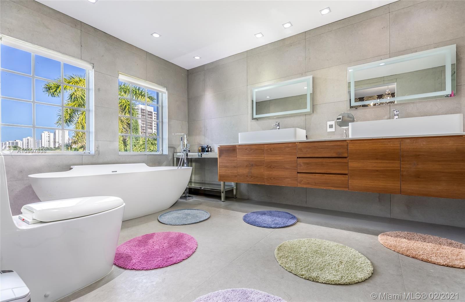 One of the few estates within Aventura Lakes sitting upon 80 ft of linear water frontage directly upon Lake. This modern Mediterranean mansion has 4 BRS and 5 BA. As you walk thru the foyer you welcome an open floor plan with formal dining room, formal bar area, formal living room, media room, chef's eat-in kitchen with Miele & Sub Zero appliances, full laundry facilities, and smart home system. This home’s living room is spacious with lots of natural light, floor to ceiling glass windows offering stunning panoramic views of the lake. A large master bedroom and bath suite has unique features and exquisitely designed with pure luxury and private oasis feels. This property is absolutely spectacular in every way. You have to see.
