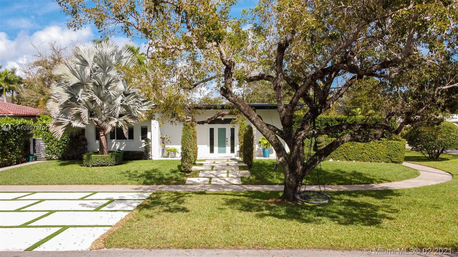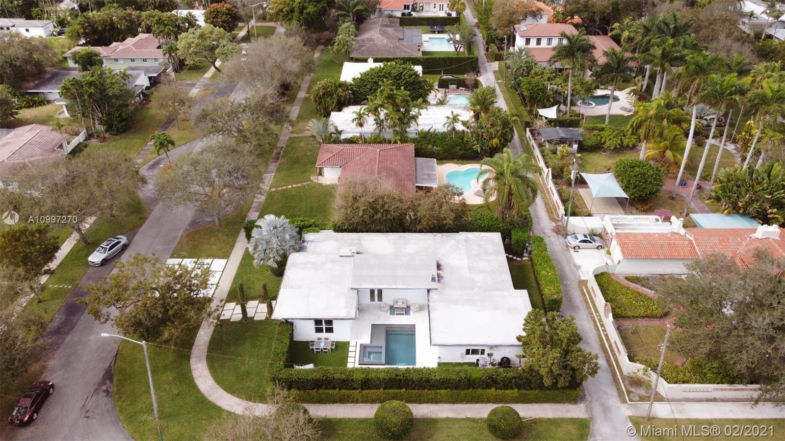 CORNER LOT...4 BEDROOM+4 FULL BATH, MID CENTURY MODERN HOME IN MIAMI SHORES. OPEN CONCEPT LIVING SPACES WITH HIGH CEILINGS-ALL SURROUNDING DELIGHTFUL HEATED POOL & SPA. PRIVATE YARD ENCLOSED WITH BEAUTIFULLY MANICURED HEDGES & MOSQUITO SPRAY SYSTEM... GREAT FOR ENTERTAINING! EAT-IN KITCHEN...STAINLESS STEEL APPLIANCES, QUARTZITE COUNTER TOPS WITH LED LIGHTING. BIG LIVING ROOM & DINING ROOM...GREAT NATURAL LIGHT. MASTER BEDROOM HAS WALK-IN CLOSET, EN-SUITE BATHROOM WITH SHOWER & JACUZZI TUB. 4TH BEDROOM COULD BE USED AS IN LAW QUARTERS, DEN/OFFICE. 1 CAR GARAGE/STORAGE. NEWER ROOF, IMPACT WINDOWS & DOORS. FRESHLY PAINTED EXTERIOR WITH SMART PHONE OPERATED LED RECESS LIGHTS. BRAND NEW DRIVEWAY. WALK TO COUNTRY CLUB, REC-CENTER, GOLF COURSE, AQUATIC CENTER & THE BAY.