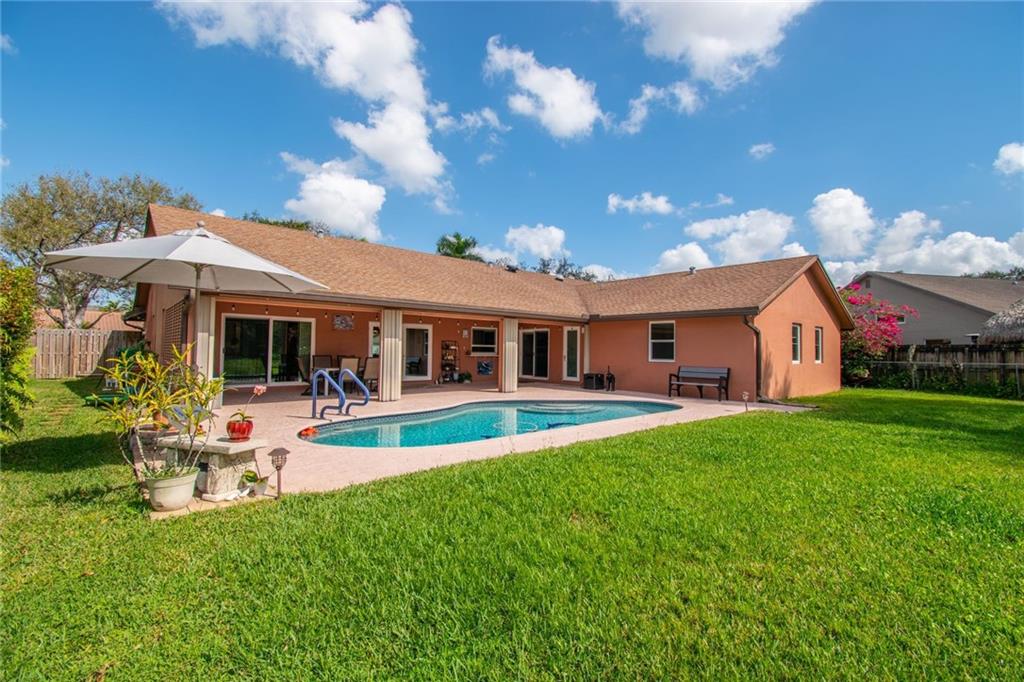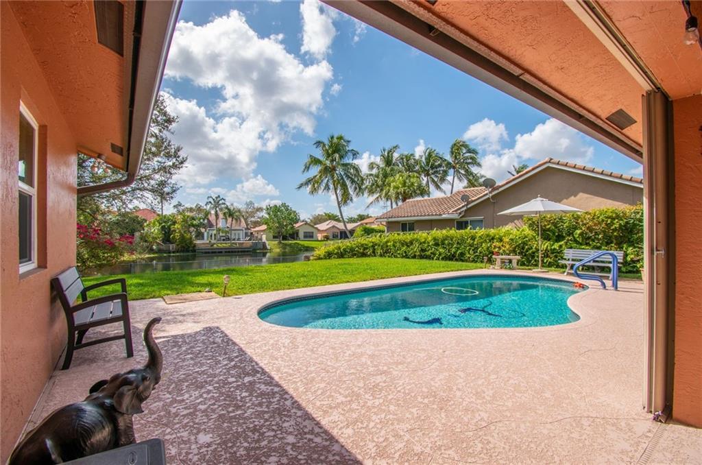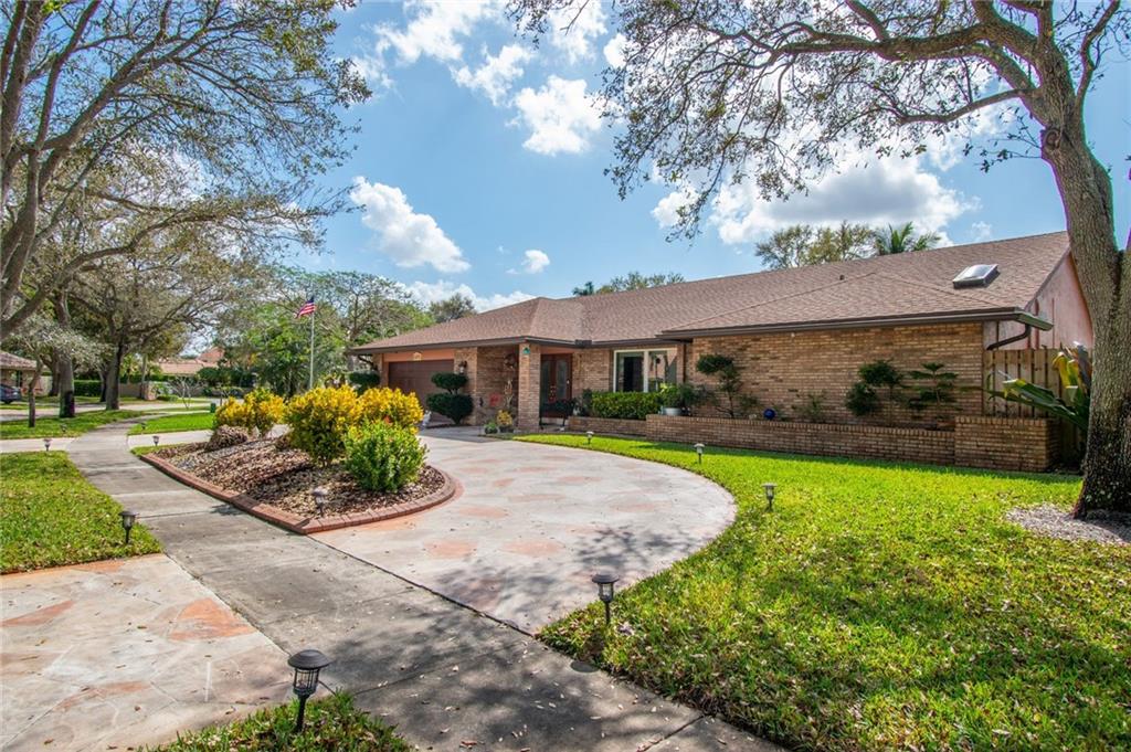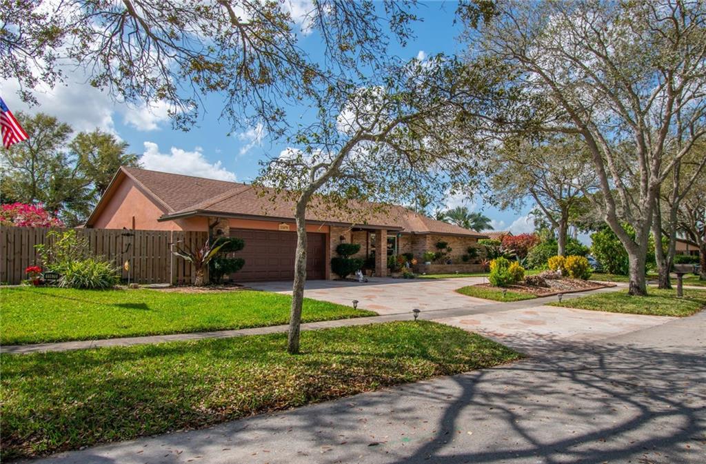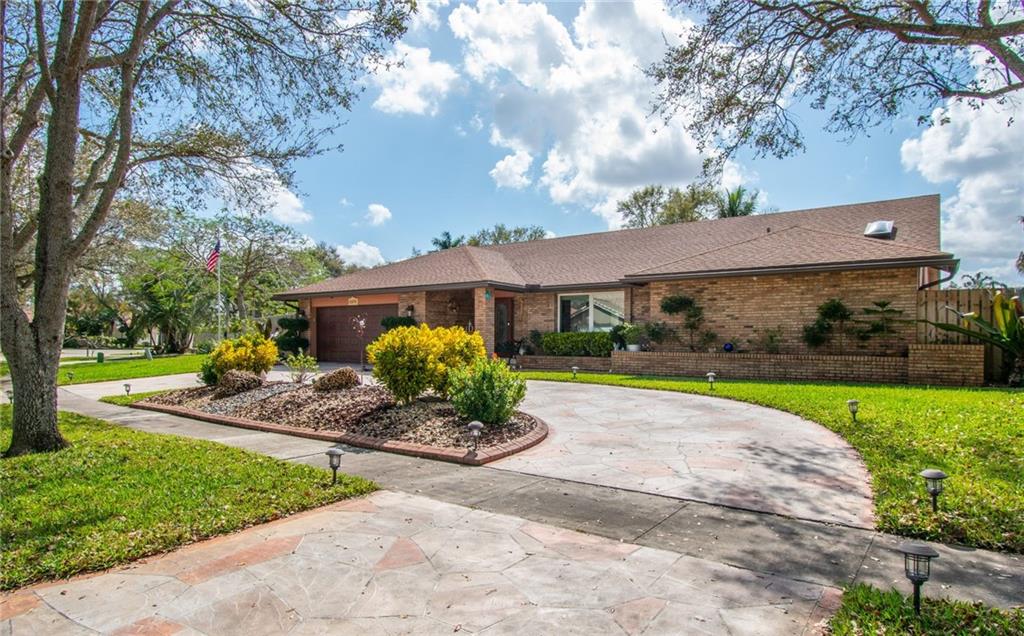 Spectacular Ranch House in the sought after neighborhood of Rock Creek with a private cul-de-sac location, large patio, pool and beautiful lake views! This lovely red brick 4 bedrooms, 3 baths and 2 car garage with circular driveway features over 14,000 SF Lot, offering plenty of space for entertaining outdoors and spacious covered patio which you can conveniently access from the master bedroom, family room or dining room, also offers a pass through window from the kitchen. Beautiful updated kitchen with wood cabinets, nice counters tops, tile backsplash & s/s appliances. Hurricane double glass entry doors. All windows & doors upgraded to HIGH IMPACT. Newer TRANE AC. Central vacuum, Laundry room , 3 zone sprinkler. Water softener system. Fully fenced yard. Low HOA and A+ rated schools!