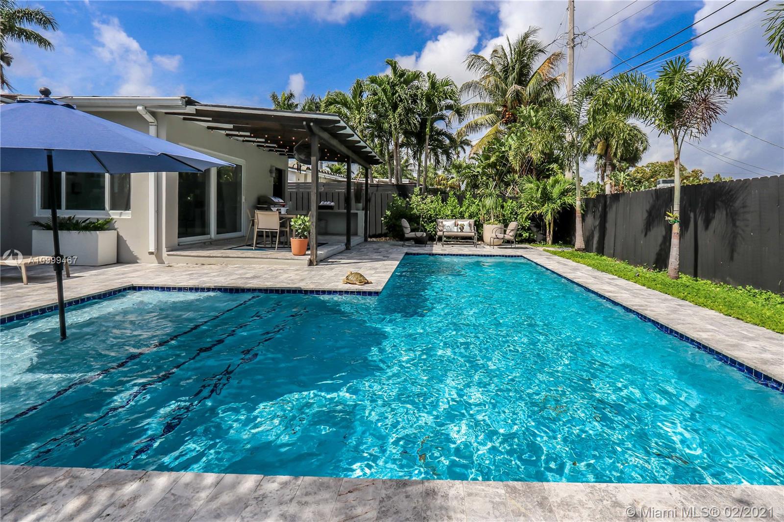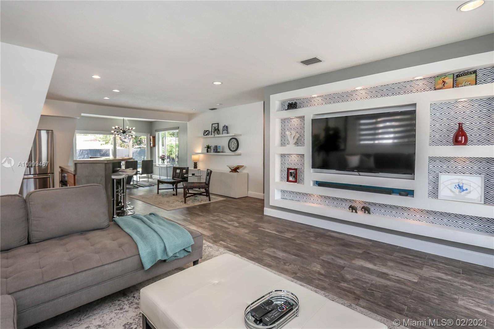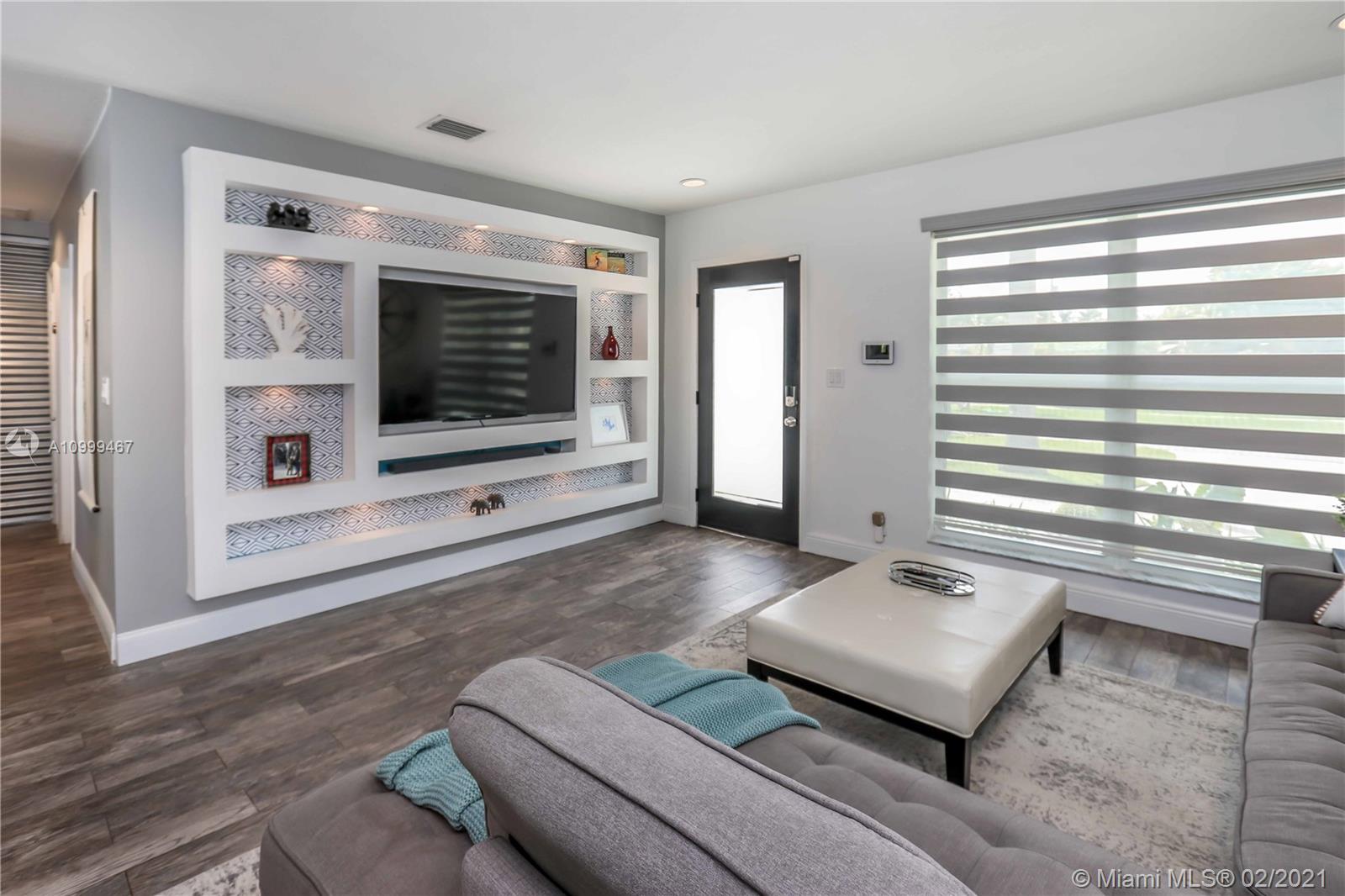 Contemporary 2 Bed/2 Bath residence with tropical landscaping and pool oasis. Featuring a circular drive, open porch, modern yet warm design elements. This superbly stylized layout continues with beautiful wood porcelain tile flooring, a sunlit living space and an open concept kitchen featuring custom island, concrete countertops, light cherry wood tone cabinetry, tile accents, ss appliances & gas stove leading to dining area. Oversized master bedroom/bath features a dual faucet sink with rainfall shower for a spa-like experience. An outdoor oasis awaits with a brand new saltwater pool perfect for entertaining. Features: Tankless Water Heater, Digital Nest Thermo, Pre-wired for ADT Camera System, Hurricane Impact Win/Shutters, Saltwater Pool, Deck, Landscaping & Lighting, Roof, AC, Shed.