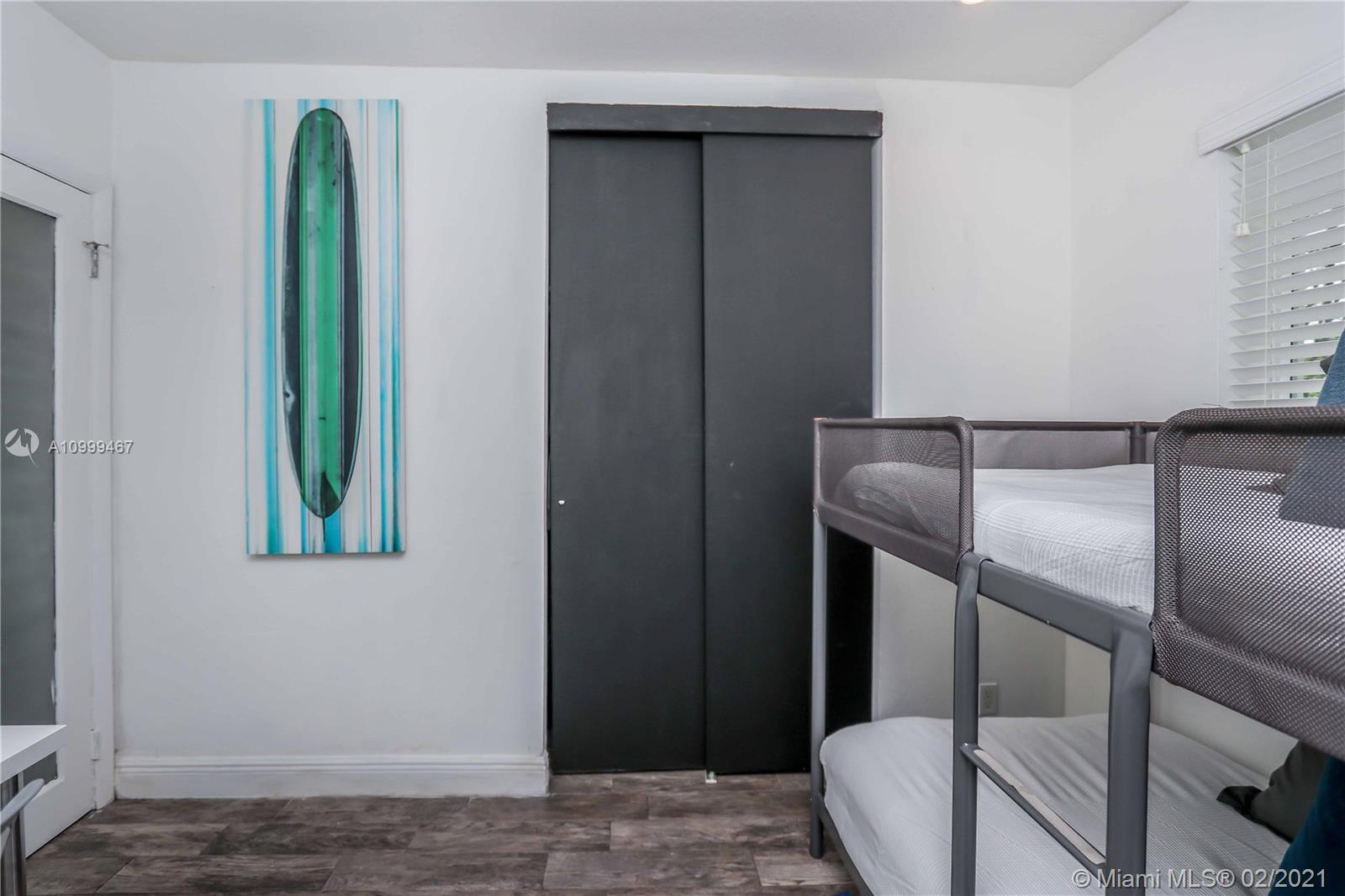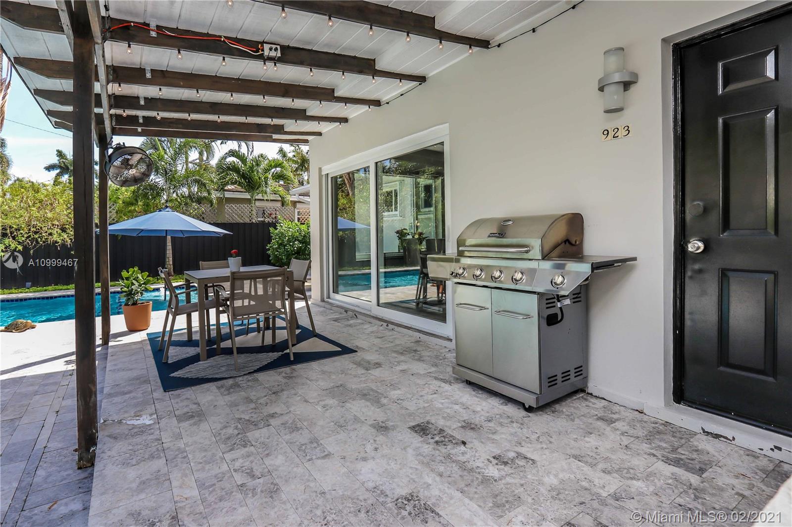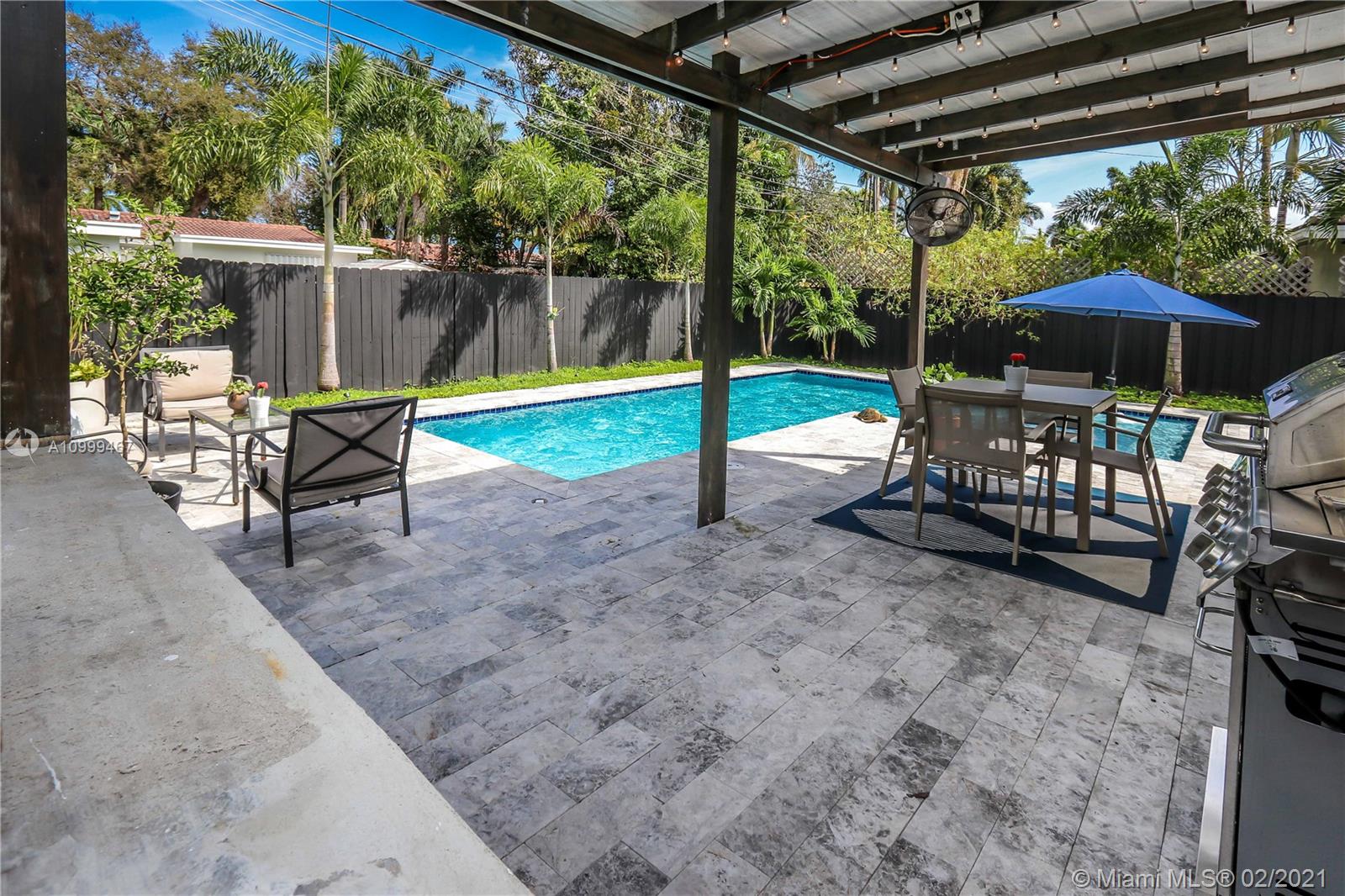 Contemporary 2 Bed/2 Bath residence with tropical landscaping and pool oasis. Featuring a circular drive, open porch, modern yet warm design elements. This superbly stylized layout continues with beautiful wood porcelain tile flooring, a sunlit living space and an open concept kitchen featuring custom island, concrete countertops, light cherry wood tone cabinetry, tile accents, ss appliances & gas stove leading to dining area. Oversized master bedroom/bath features a dual faucet sink with rainfall shower for a spa-like experience. An outdoor oasis awaits with a brand new saltwater pool perfect for entertaining. Features: Tankless Water Heater, Digital Nest Thermo, Pre-wired for ADT Camera System, Hurricane Impact Win/Shutters, Saltwater Pool, Deck, Landscaping & Lighting, Roof, AC, Shed.