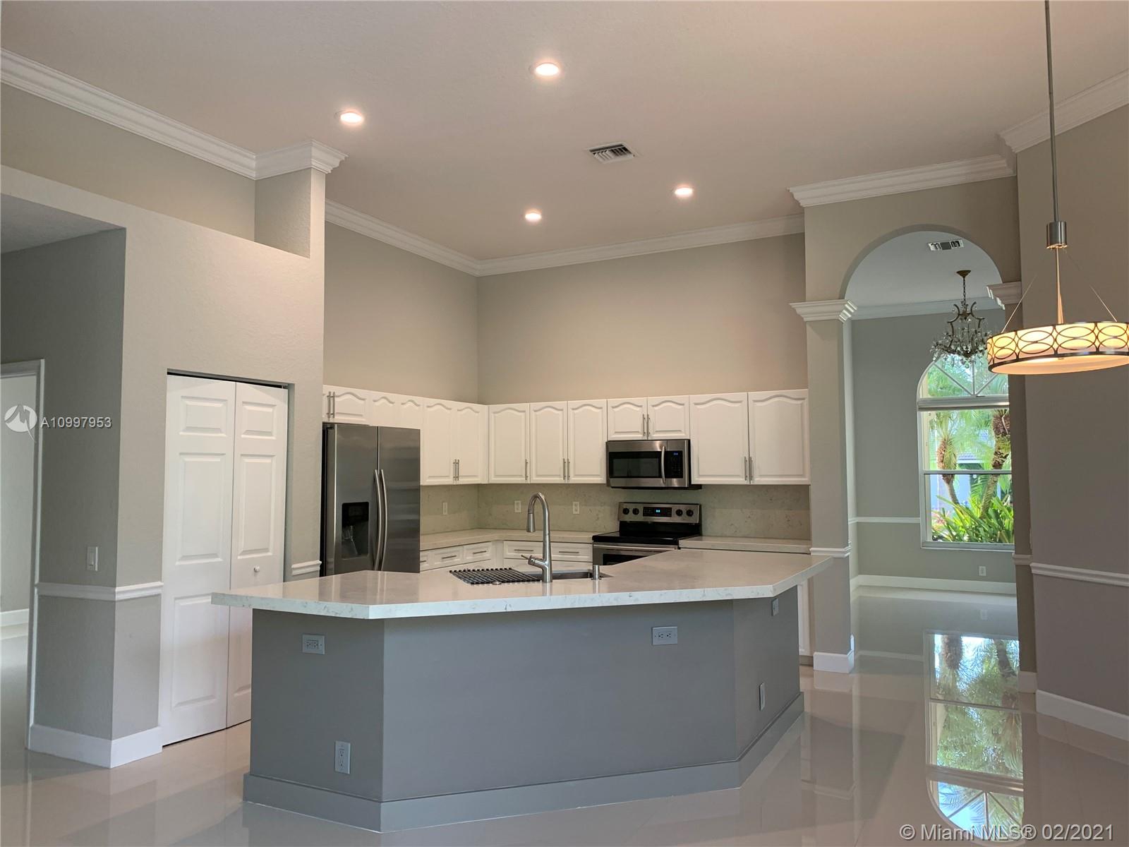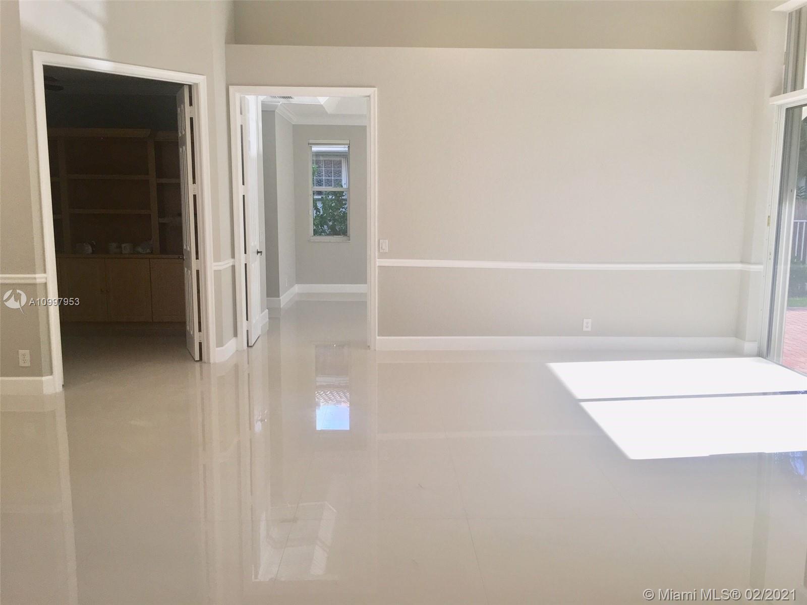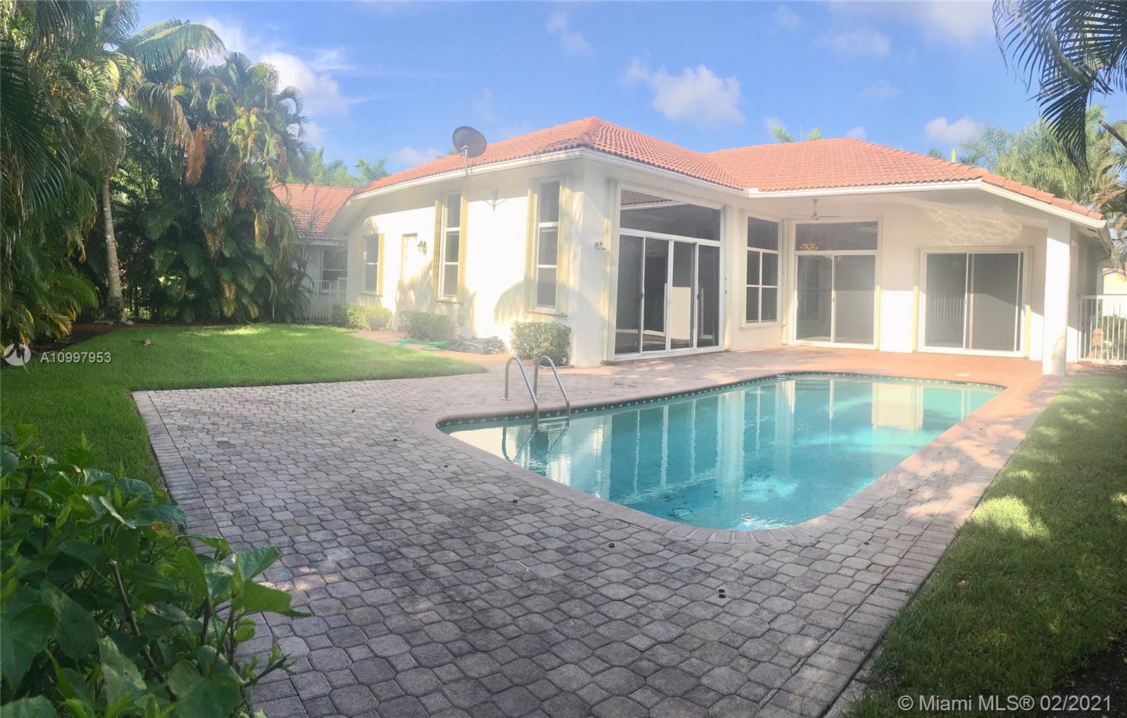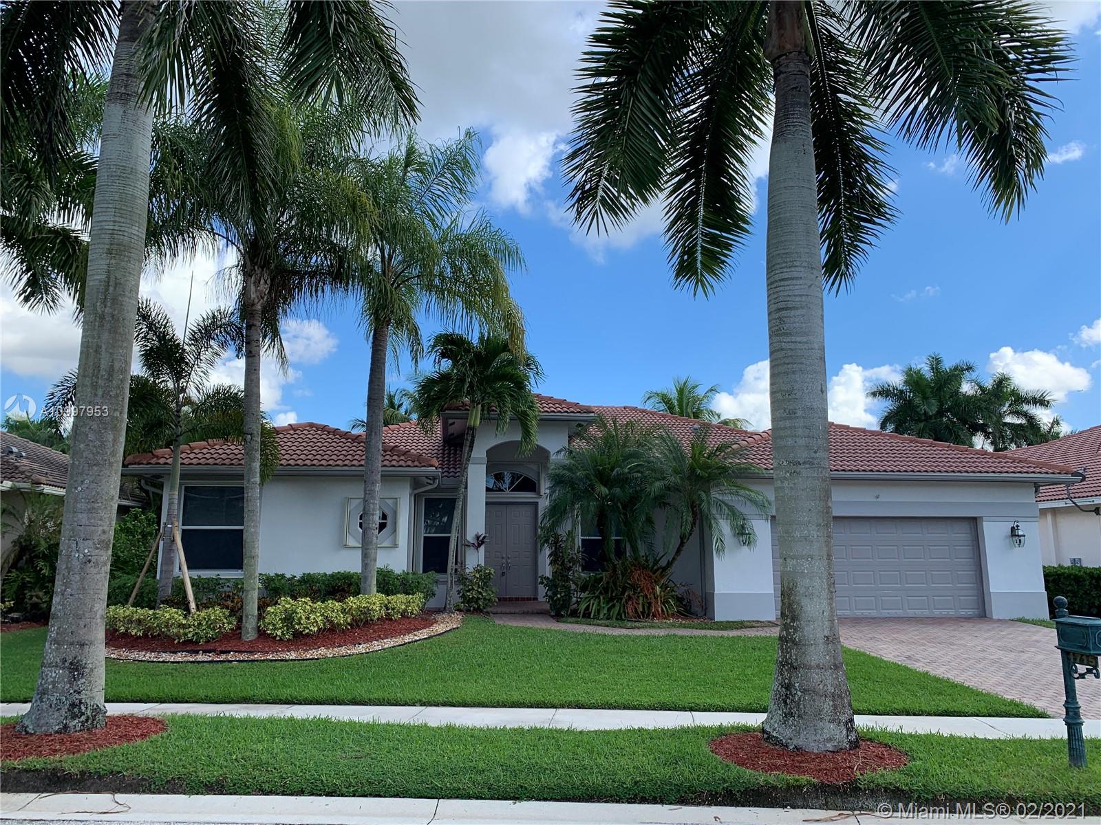 Beautiful home in Weston Hills, with spacious 1 story living, great pool in ample and very private backyard, tri-split bedroom design, 5th room is a den by the front door and next to the master bedroom, 2 big walk-in closets in the master bedroom. New porcelain floors throughout the whole house, new quartz counter top, completely remodeled cabana bathroom and guest bathroom, new shower in master bathroom, new toilets, tall ceilings, new LED ceiling lights, laundry room with sink; two year old stainless steel appliances. New diamondbrite in pool. Freshly painted. New accordion hurricane shutters. A must see!