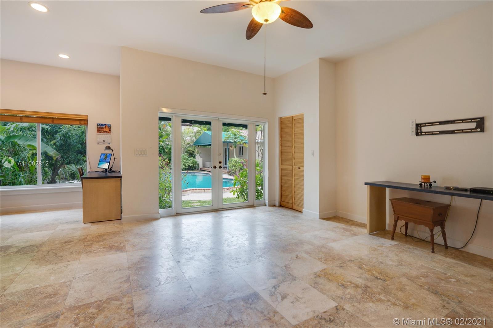 Located in a Prime Coral Gables location, behind a privacy wall, this 4 bd, 3 bath residence w/ cottage is on a quiet, low traffic street. The 12,000 sq. ft. lot is laden w/ exotic plants & fruit trees. Garden vistas from every rm. Charming details are exemplified by hardwood floors, fireplace in living rm & gabled ceiling in fam rm. Modern features incl Impact windows/doors/barrel tile roof. Large updated kitchen w/ granite countertops/island/ breakfast bar/eat in area/home office ideal for a family. Home offers a split plan: Master on west side features Bay window/window seat/ample closets. 3 bdrms & 2 baths on east side. The 592 sq ft cottage features high ceilings, saturnia flooring, large liv area/Murphy bed/full bath/kitchen & office space. All cast iron pipes have been replaced.
