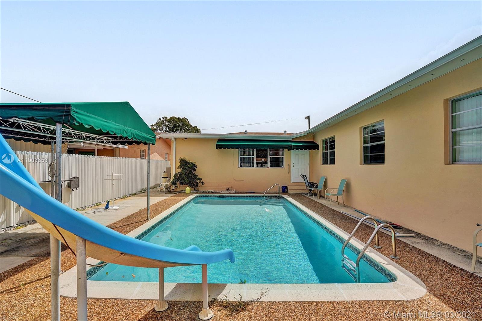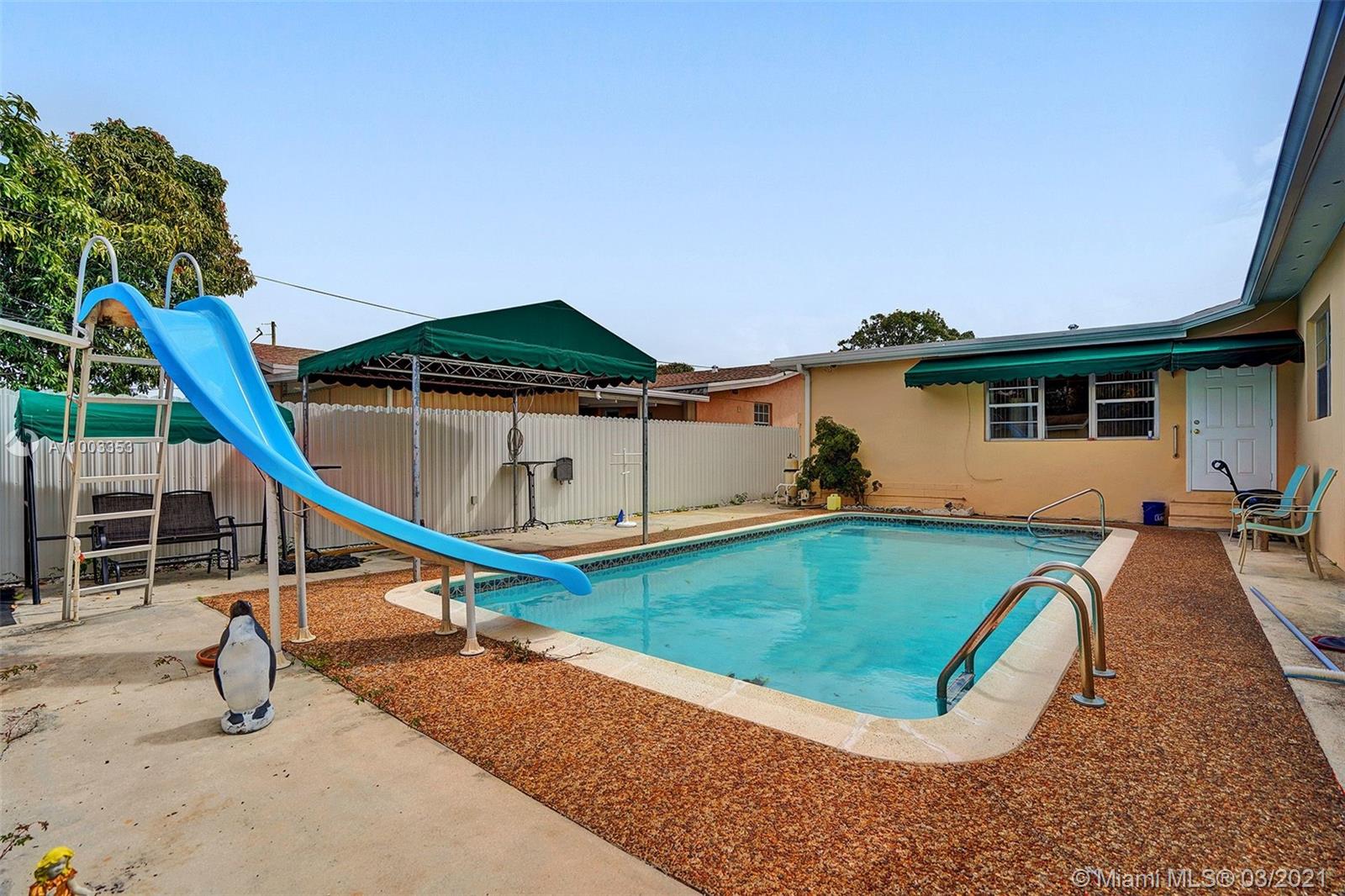 Look no further!!! The best one in Hialeah! Don’t miss this opportunity in a family-oriented neighborhood! Beautiful backyard oasis with a pool, slide, kitchen bar and an additional outside legal storage place for family entertainment! Excellent 4 bedrooms, 2 baths plus a family room and huge loft with an additional private area of a 1 bathroom and 1 bedroom. Many entrances to the house. One-story family home. Two outside carports, fenced. Open Kitchen with tile floors throughout the house. Rose/sunflower Garden in the front yard and a mango tree in the back. SELLER MOTIVATED!