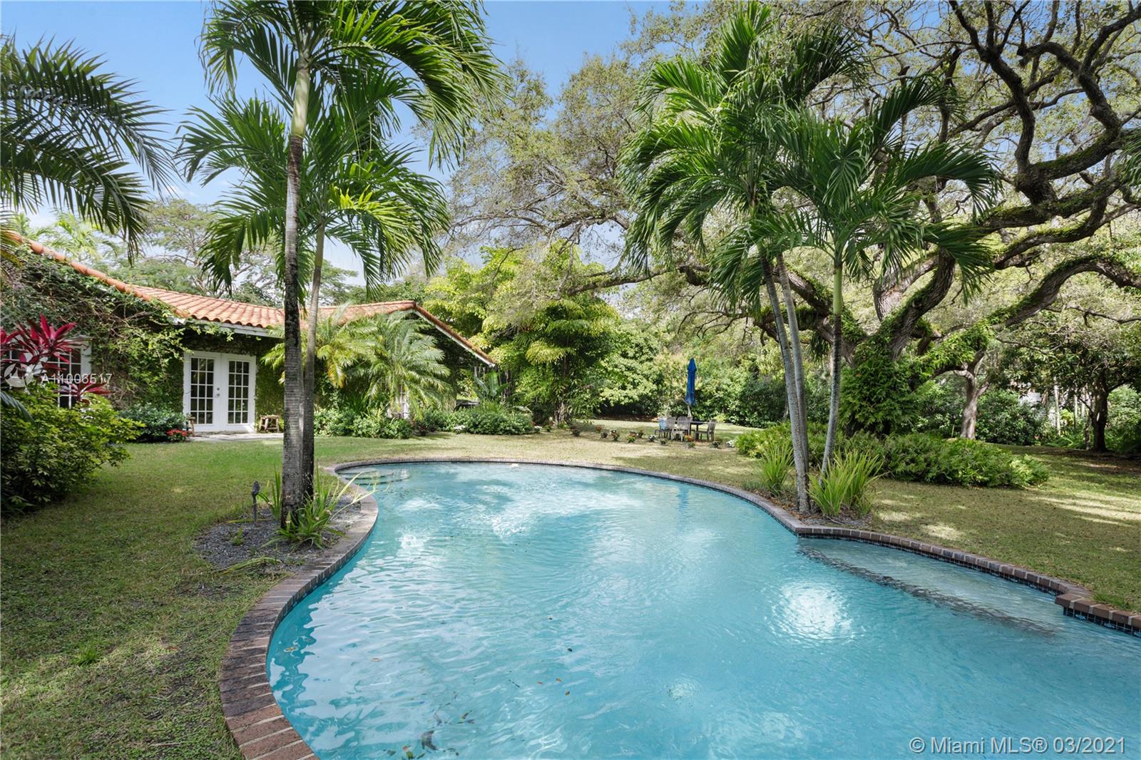 Beautiful Pinecrest ranch style pool home surrounded by lush tropical fruit trees on huge lot (52,000+ sq ft). Five full bedrooms plus an office or den or both, you choose. Master suite is enormous with sunken tub, separate shower, large walk-in closet and dressing room. Features a formal living room with a working fireplace, formal dining room plus a light airy Florida/family room with skylights. Vaulted ceilings with exposed wood beams and plenty of natural light in every room. Other features include a large circular driveway, an electric gated entrance for privacy, a hot tub just outside the master bathroom. Inside the Pinecrest elementary school district.