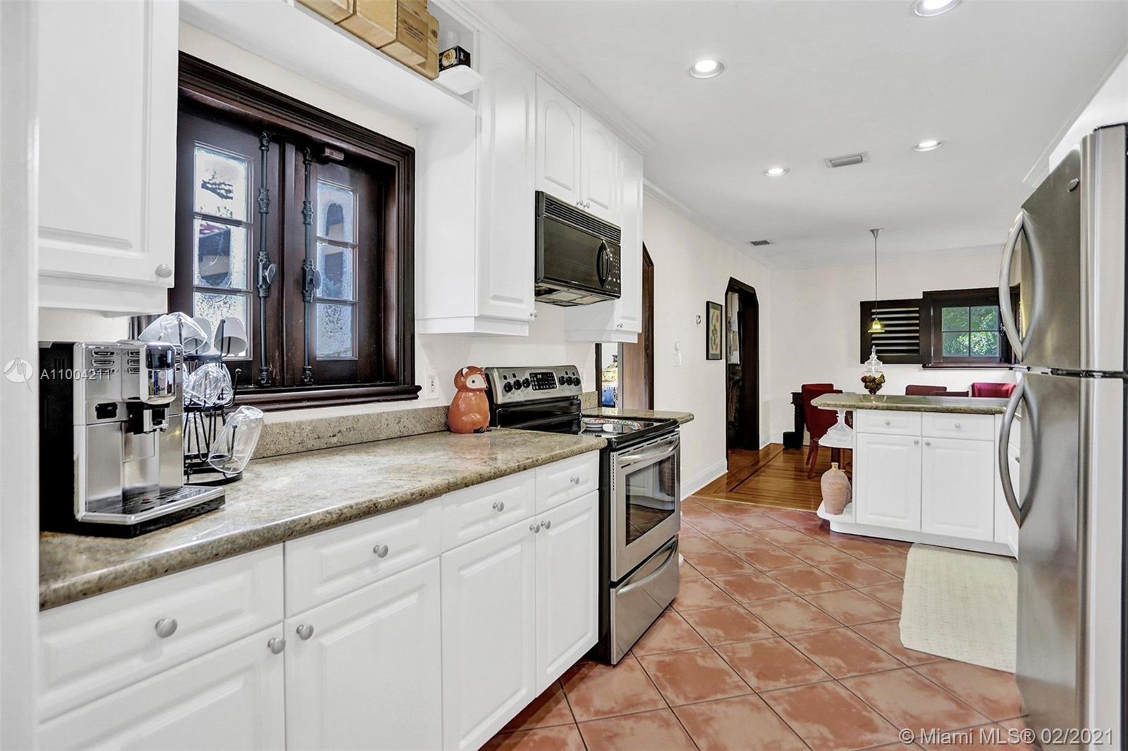 Charming 1940’s Spanish Mediterranean Shores home! Elegantly updated 2 bedroom, 2 bath with bonus 1.5 car garage under A/C and with marble floors that can be easily converted to a 3rd bedroom. Property is nestled on 9,600 sq. ft. lot offering lushly landscaped gardens and tree lined street, Chicago brick driveway & backyard patio that is fenced - great for entertaining. 2021 roof, 2021 paint and stucco, updated kitchen with stainless steel appliances and Carrara marble bathrooms. This property also features mahogany impact windows and doors with interior mahogany Bahama shutters, trim and moulding, beautiful oak floors throughout, majestic fireplace, natural gas generator and tankless gas water heater, irrigation system and built in level two electric car charger! Must See!