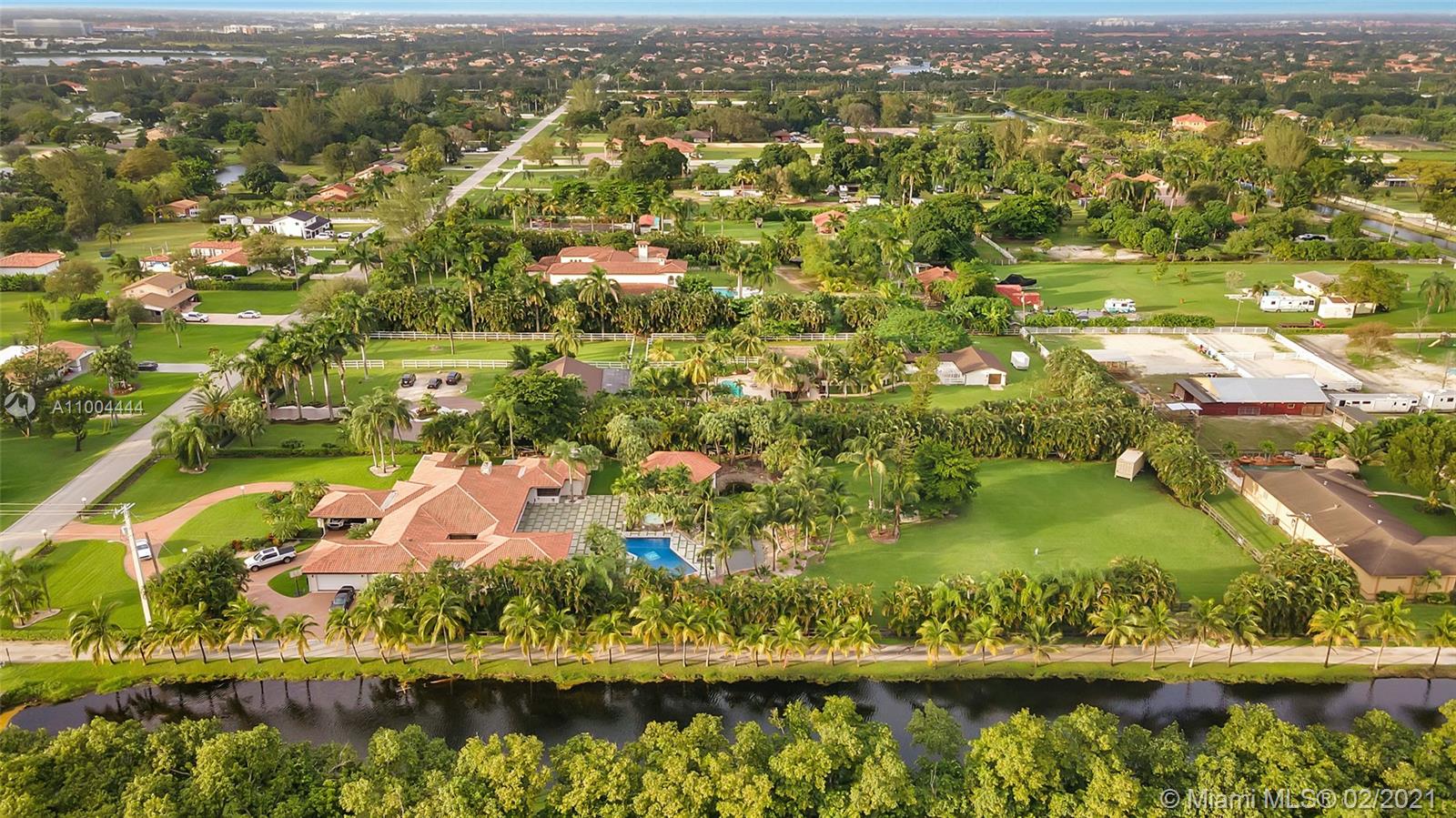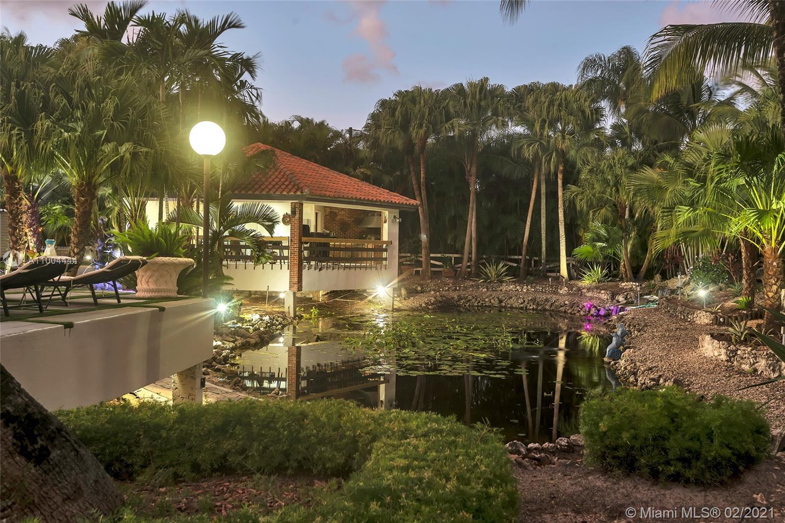 Exquisite 2-acre home in the exclusive Miramar Estate neighborhood. You can own a home centrally between Miami-Dade County & Broward County. Phenomenal location w/ access to I-75 & the Florida Turnpike. Property has been remodeled meticulously. Property has all stainless-steel appliances, gas dryers, gas stove, high efficiency A/C’s, 3 water heaters. A well water with a filtration system, a propane gas system consisting of 2 containers: 1st gas tank is underground w/ 1,000 gals and 2nd gas tank is above ground w/ 120 gals. The property has 16 camera security system. Ext and int Led lighting system. Backyard has a beautiful lagoon as well as a BBQ/picnic area. An exquisite pool w/ sauna. Property also has a 1/2 detached guest house, w/ views of the pool & lagoon. Beautiful outdoor space.