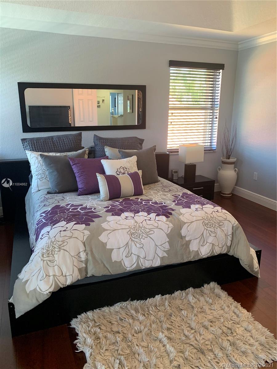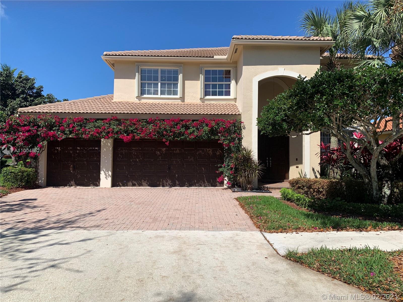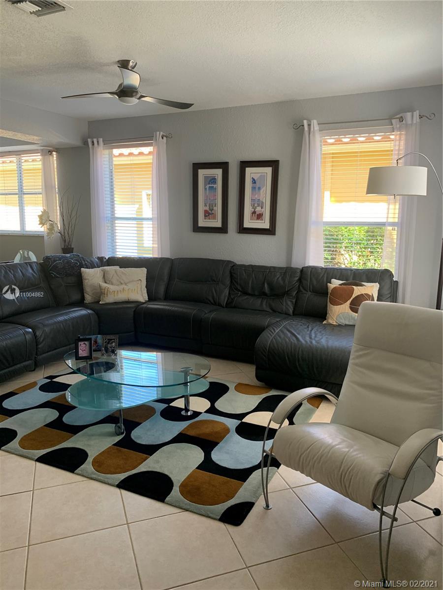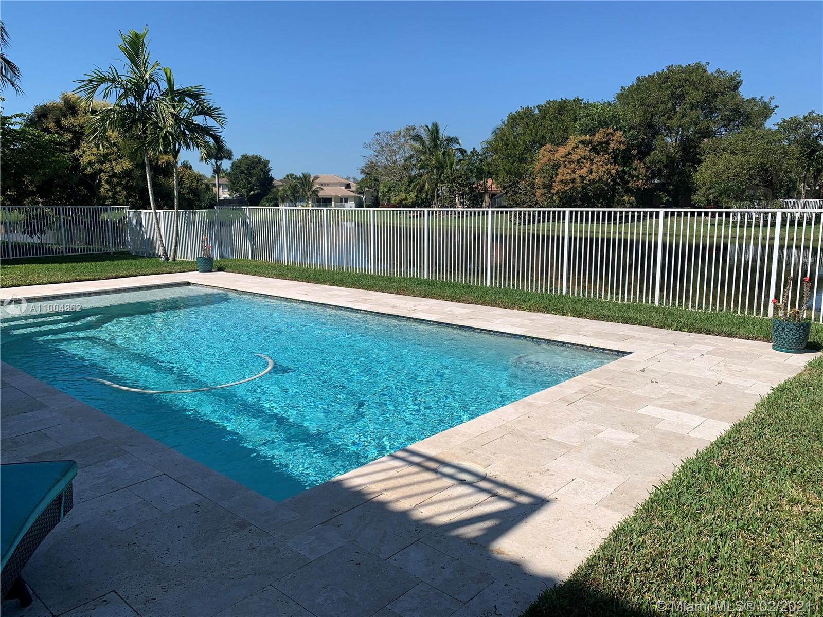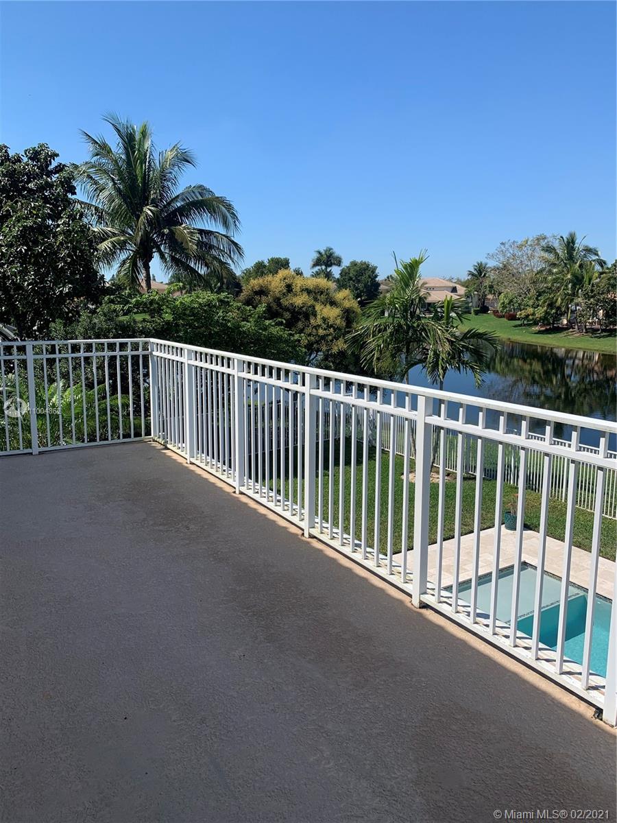 Spectacular two story home on desired Emerald Estates!! 5 bedroom and 3 full bathrooms. Enjoy amazing lake views, and beautiful sunsets in your private backyard. Pool with lush tropical garden, perfect for entertain, and featuring convenient Cabana Bath and retractable awning. Open layout with dining room, living room, family room and breakfast area. Ceramic tiles on first floor, hardwood, laminate floors, and accordion shutters on second floor. Just upgraded, beautiful modern kitchen with new kitchen appliances, and quartz countertops. Upgraded full bathrooms. Emerald Estates has 2 Guarded gates, sidewalk trails, playground, gym, and community pool. Maintenance includes ADP alarm, cable, and lawn mowing.