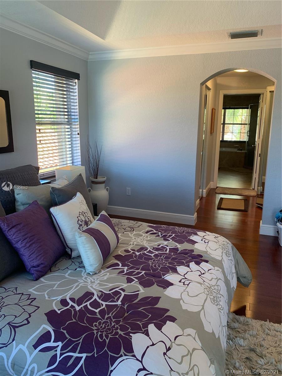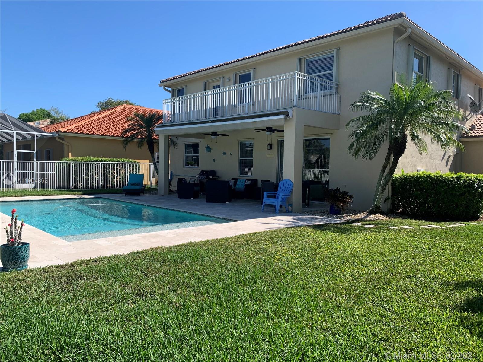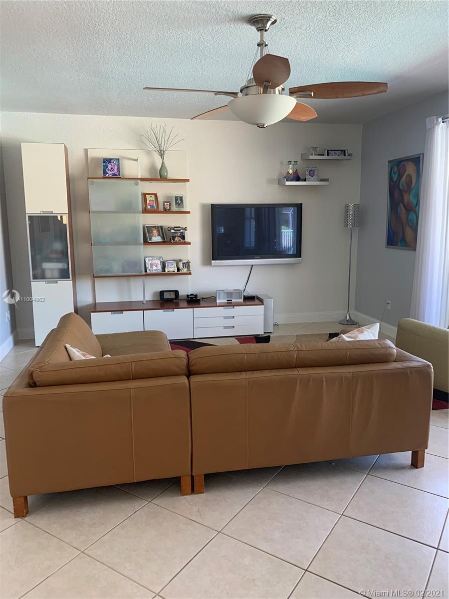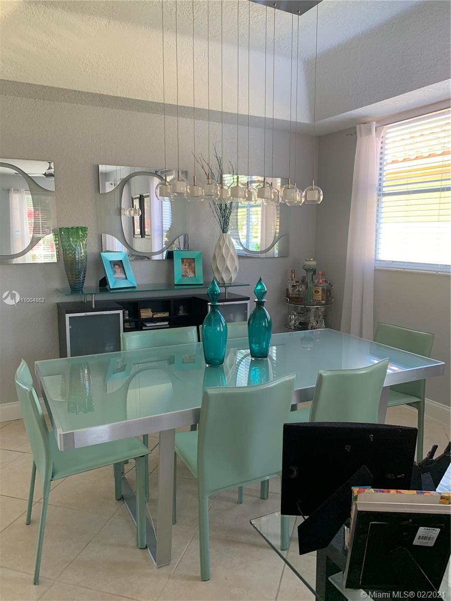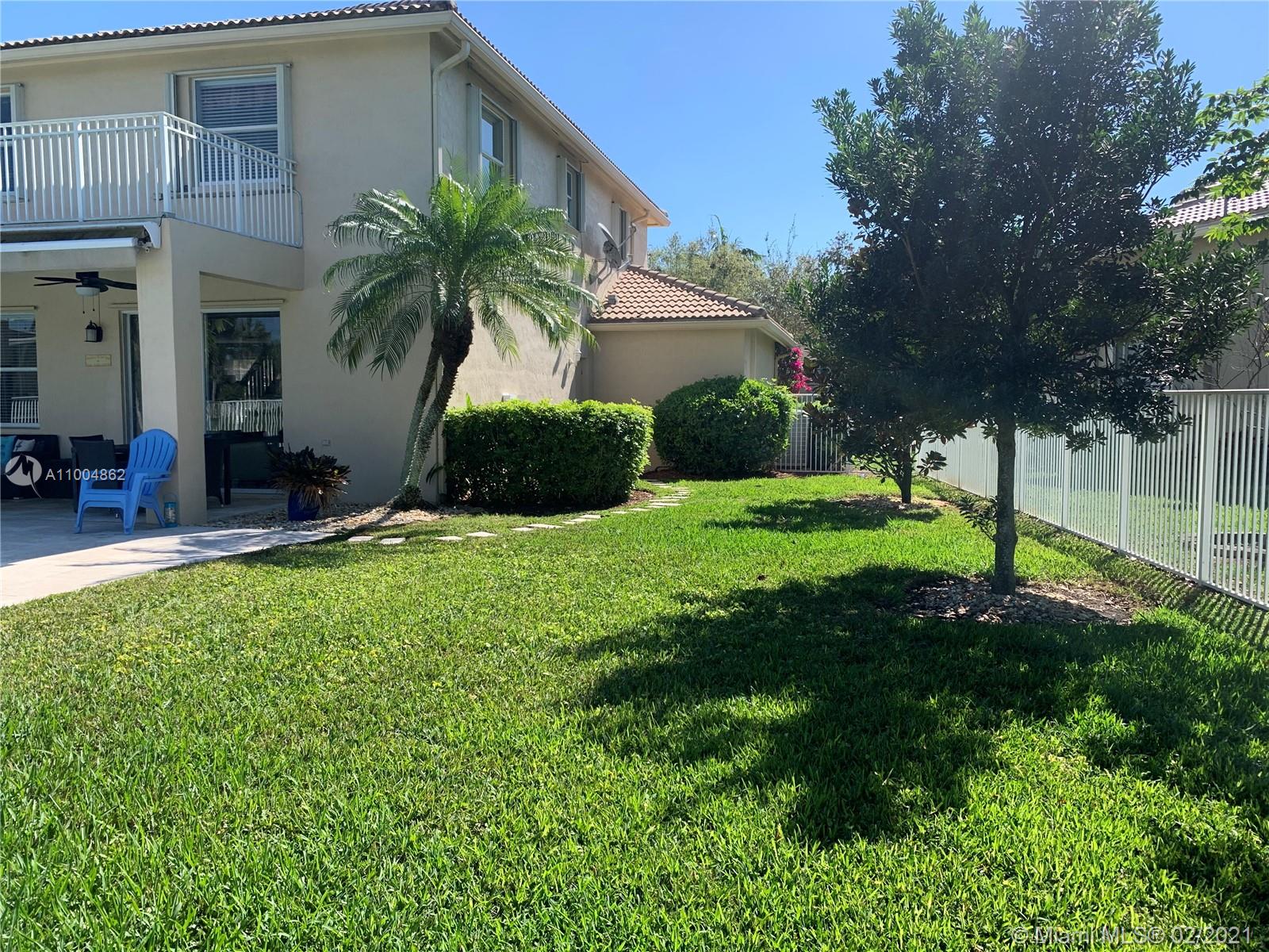 Spectacular two story home on desired Emerald Estates!! 5 bedroom and 3 full bathrooms. Enjoy amazing lake views, and beautiful sunsets in your private backyard. Pool with lush tropical garden, perfect for entertain, and featuring convenient Cabana Bath and retractable awning. Open layout with dining room, living room, family room and breakfast area. Ceramic tiles on first floor, hardwood, laminate floors, and accordion shutters on second floor. Just upgraded, beautiful modern kitchen with new kitchen appliances, and quartz countertops. Upgraded full bathrooms. Emerald Estates has 2 Guarded gates, sidewalk trails, playground, gym, and community pool. Maintenance includes ADP alarm, cable, and lawn mowing.