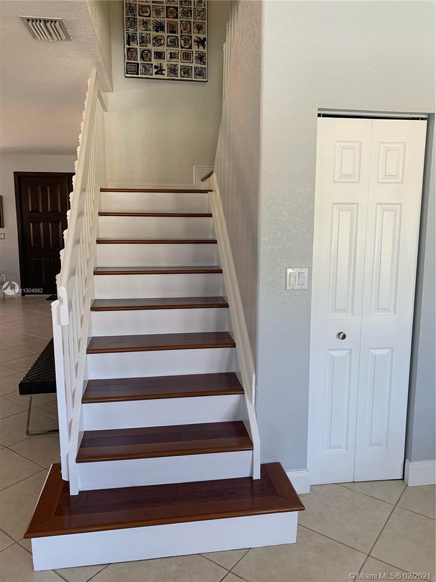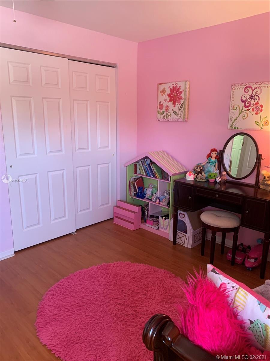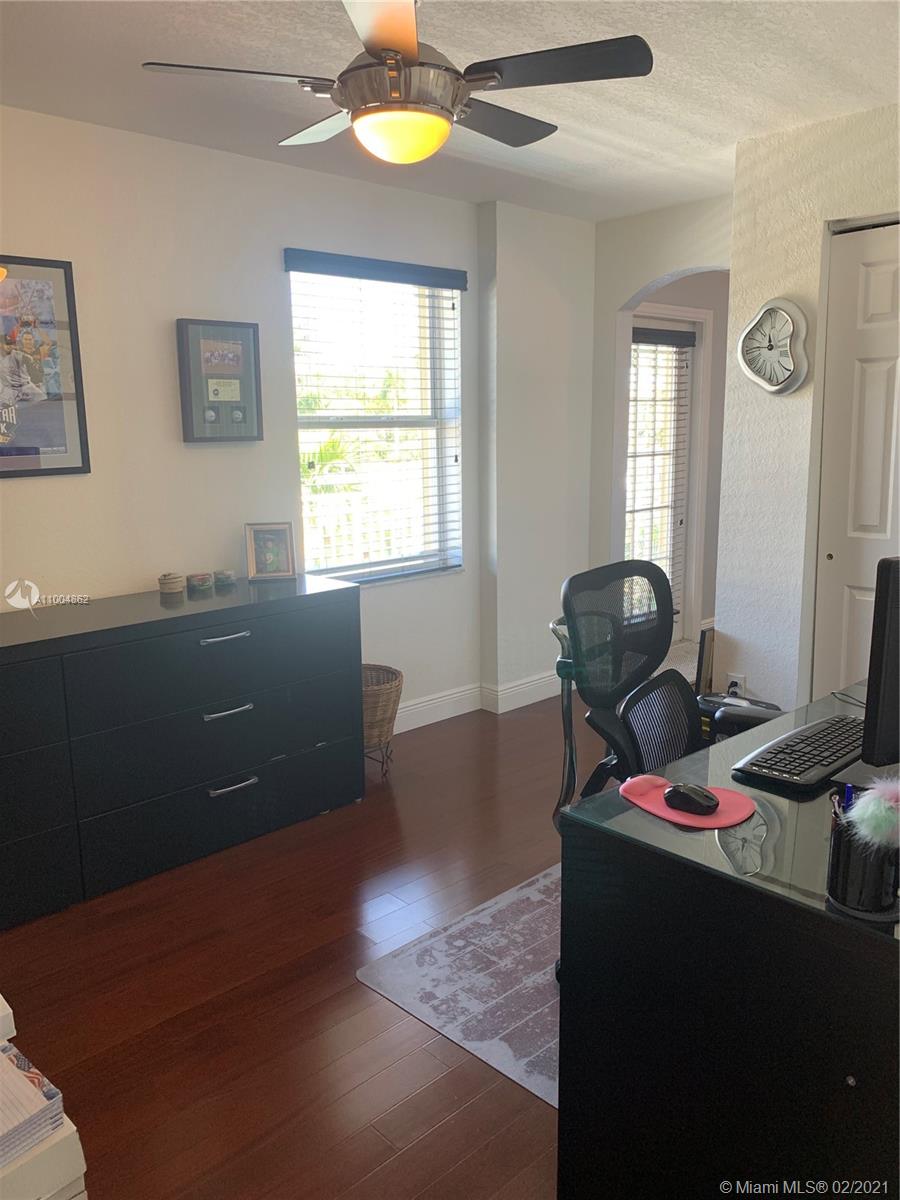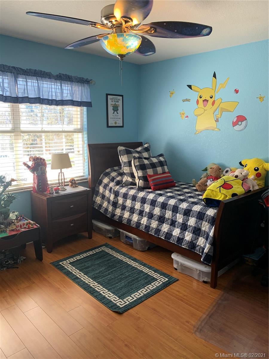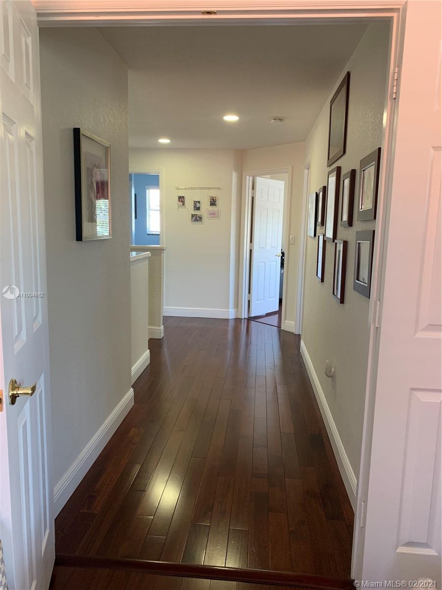 Spectacular two story home on desired Emerald Estates!! 5 bedroom and 3 full bathrooms. Enjoy amazing lake views, and beautiful sunsets in your private backyard. Pool with lush tropical garden, perfect for entertain, and featuring convenient Cabana Bath and retractable awning. Open layout with dining room, living room, family room and breakfast area. Ceramic tiles on first floor, hardwood, laminate floors, and accordion shutters on second floor. Just upgraded, beautiful modern kitchen with new kitchen appliances, and quartz countertops. Upgraded full bathrooms. Emerald Estates has 2 Guarded gates, sidewalk trails, playground, gym, and community pool. Maintenance includes ADP alarm, cable, and lawn mowing.