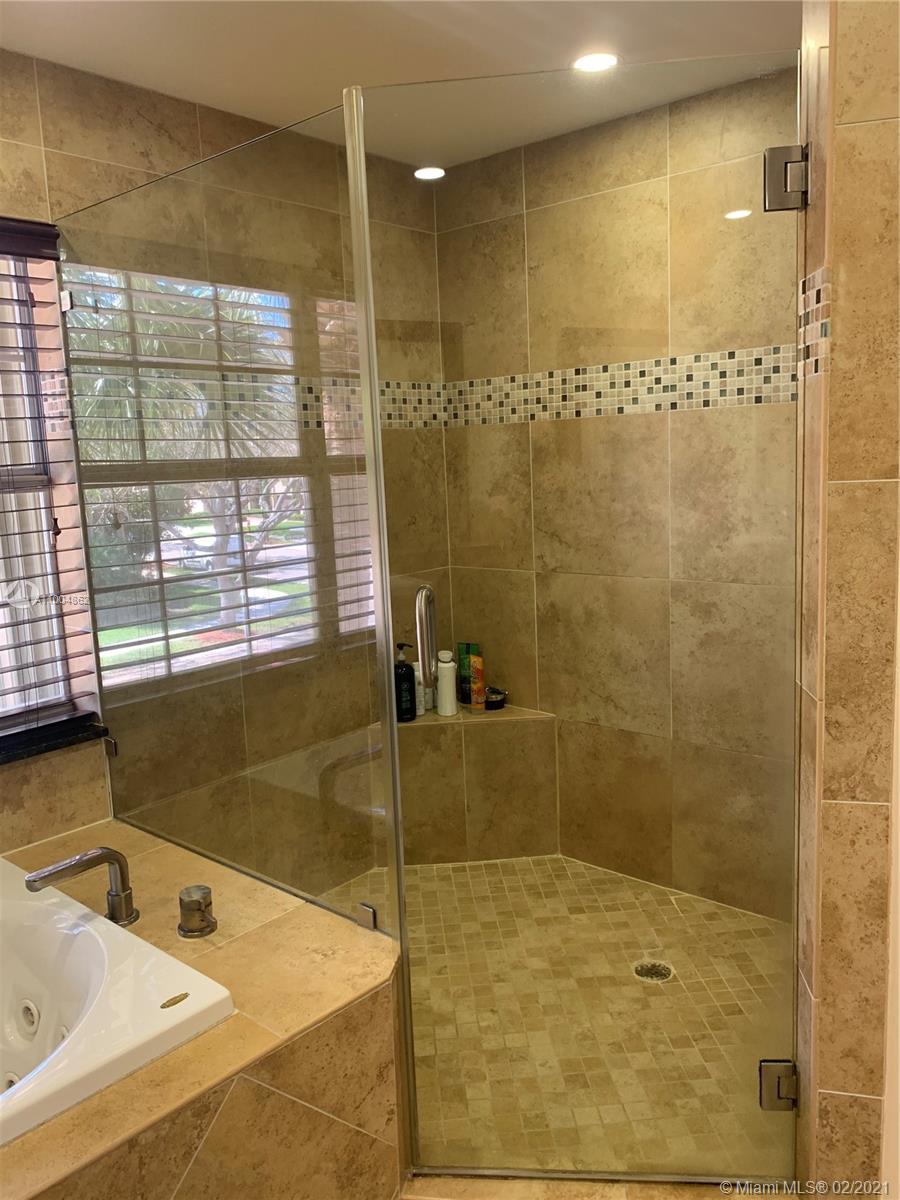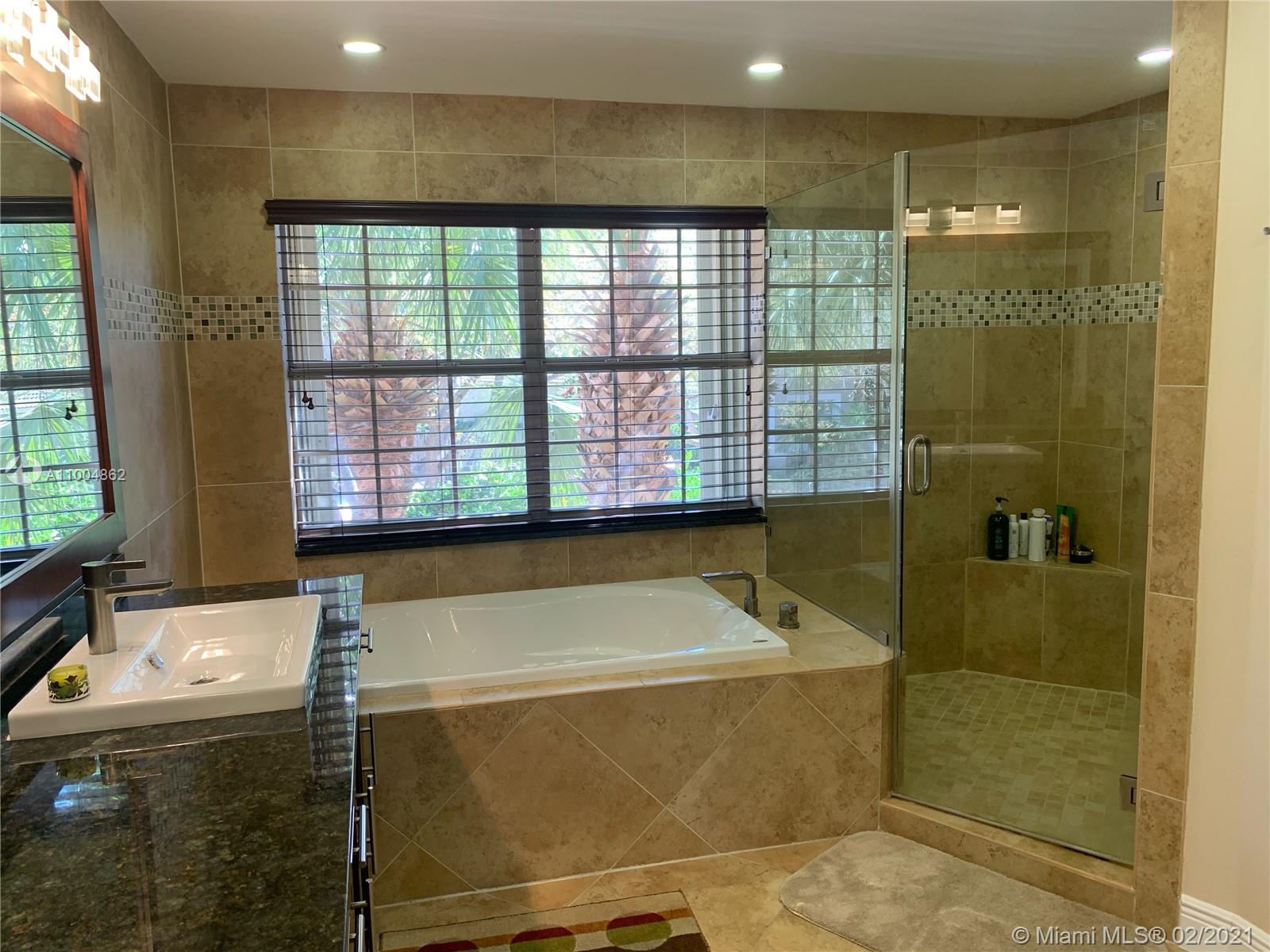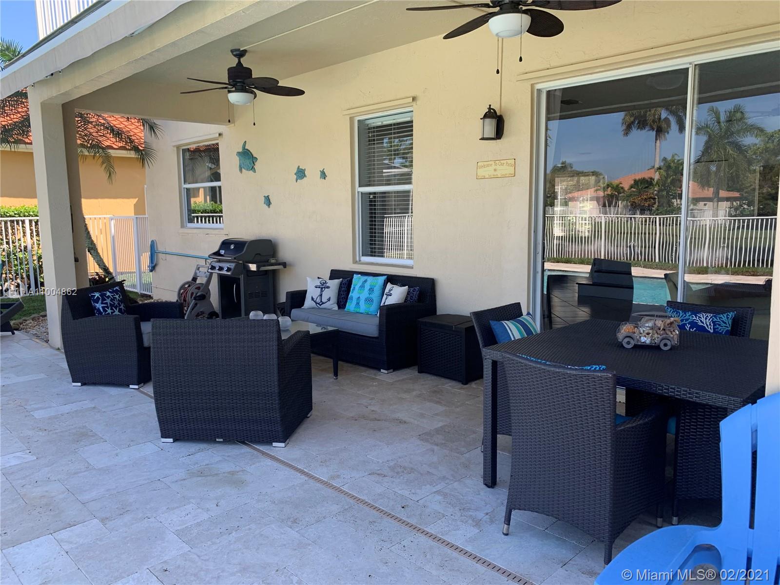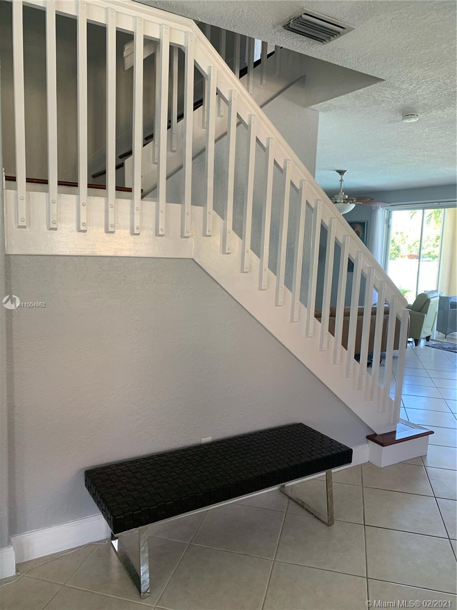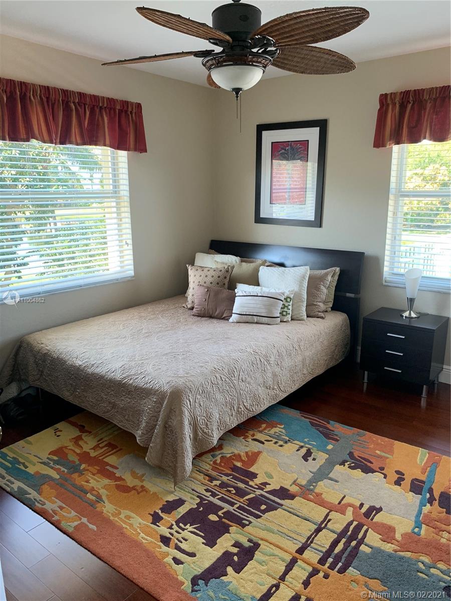 Spectacular two story home on desired Emerald Estates!! 5 bedroom and 3 full bathrooms. Enjoy amazing lake views, and beautiful sunsets in your private backyard. Pool with lush tropical garden, perfect for entertain, and featuring convenient Cabana Bath and retractable awning. Open layout with dining room, living room, family room and breakfast area. Ceramic tiles on first floor, hardwood, laminate floors, and accordion shutters on second floor. Just upgraded, beautiful modern kitchen with new kitchen appliances, and quartz countertops. Upgraded full bathrooms. Emerald Estates has 2 Guarded gates, sidewalk trails, playground, gym, and community pool. Maintenance includes ADP alarm, cable, and lawn mowing.