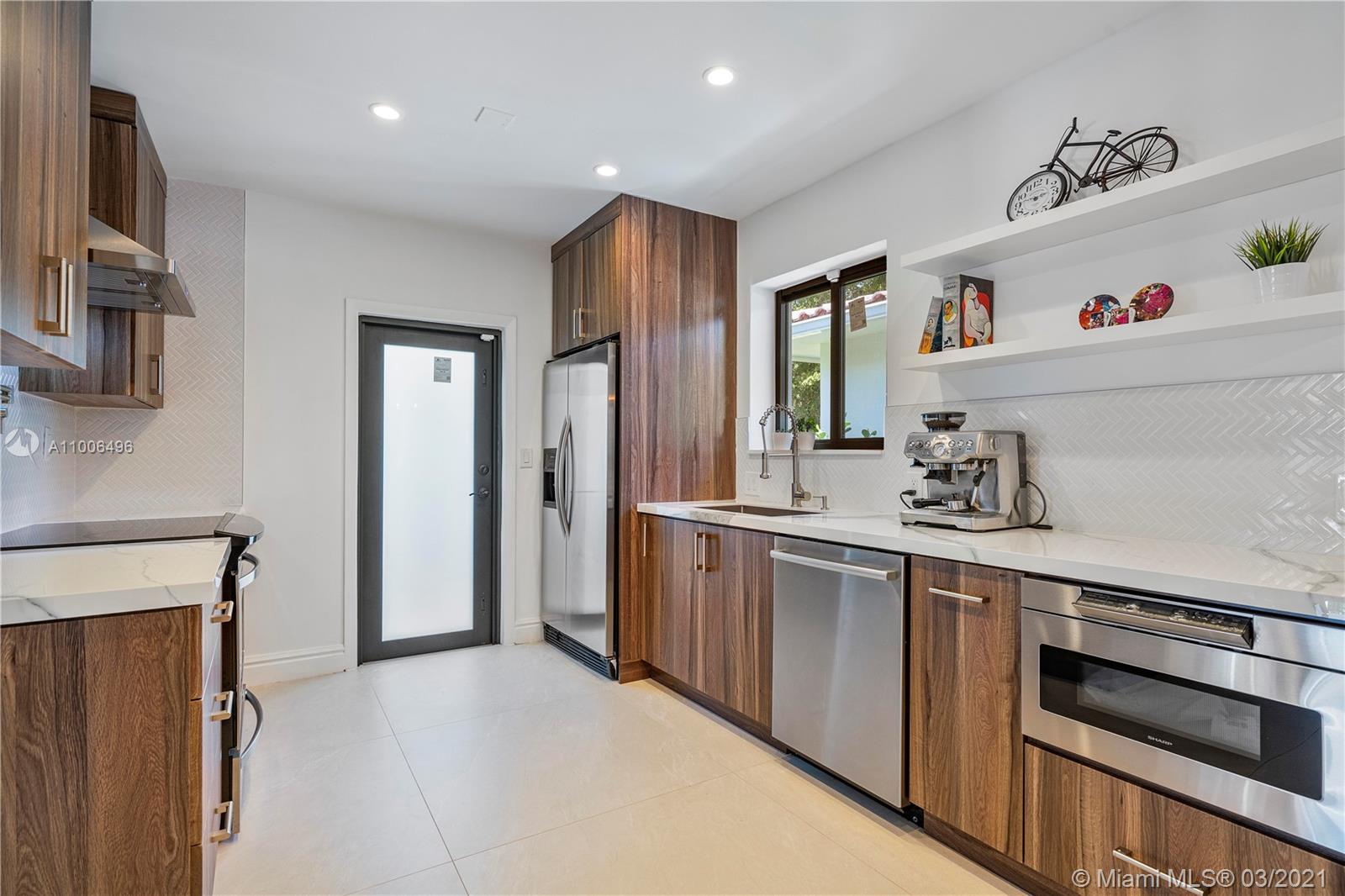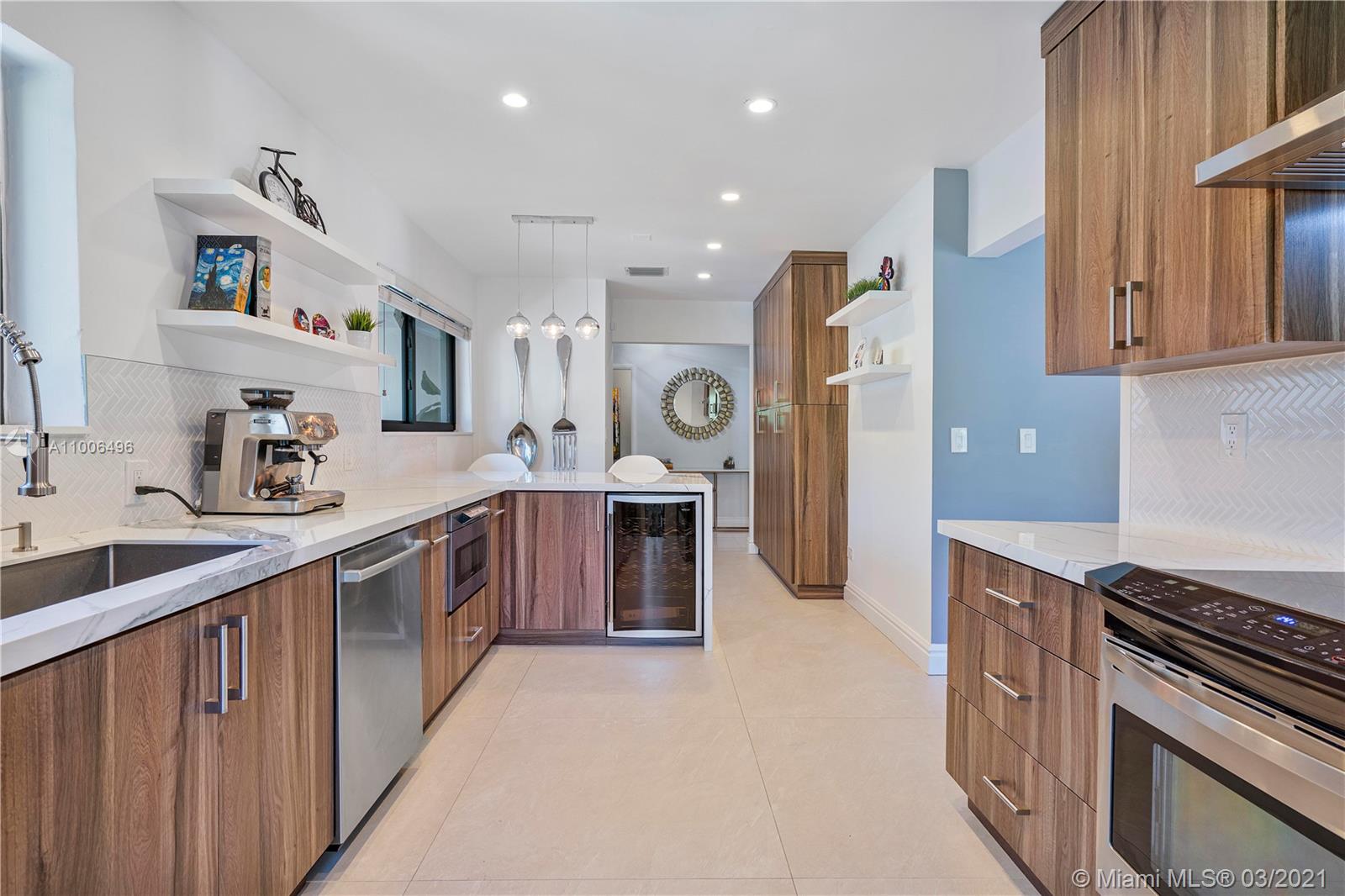 Prestigious Pine Tree Drive Mid-Century elegantly remodeled home with BEAUTY, WARMTH AND ELEGANCE! Magnificent split floor plan features three bedrooms, two bathrooms, formal dining, living room, grand family room with gorgeous views. An impeccably designed new kitchen with beautiful Calacatta Porcelain, custom cabinets, and stainless steel appliances. The backyard is an OASIS, lush landscaping ideal for entertaining, luxurious heated midnight Pool/Jacuzzi; the covered terrace is pure CASUAL OPULENCE with marble columns, wood ceiling and outdoor kitchen. SWIMSUIT REQUIRED BLACK TIE OPTIONAL. High impact windows and doors throughout. One car garage/gym. Short drive to South Beach, restaurants. THREE WISHES LOCATION, QUALITY, COMFORT.