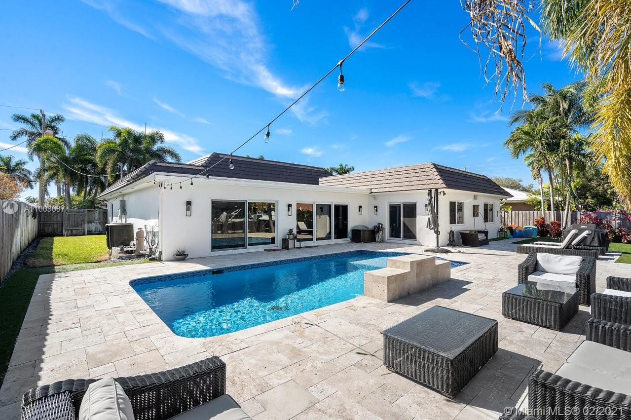 Coral Ridge Country Club Waterfront home at its finest. Modern luxury designer finishes throughout. Completely remodeled in with everything new, plumbing (no cast iron), electric, AC, impact windows, roof, pool, and more. 4 bedrooms, 3.5 baths, with a gorgeous gourmet kitchen. Light and bright home with an open floor plan. Fantastic for entertaining. Enjoy the tropical back yard with beautiful pool w/ waterfall. 85' of waterfront allow you to park a 75' boat on your new Trex dock. Perfect location for walking across the street to CRCC, salt life, or fine dining. Here is the lifestyle you have been waiting for.