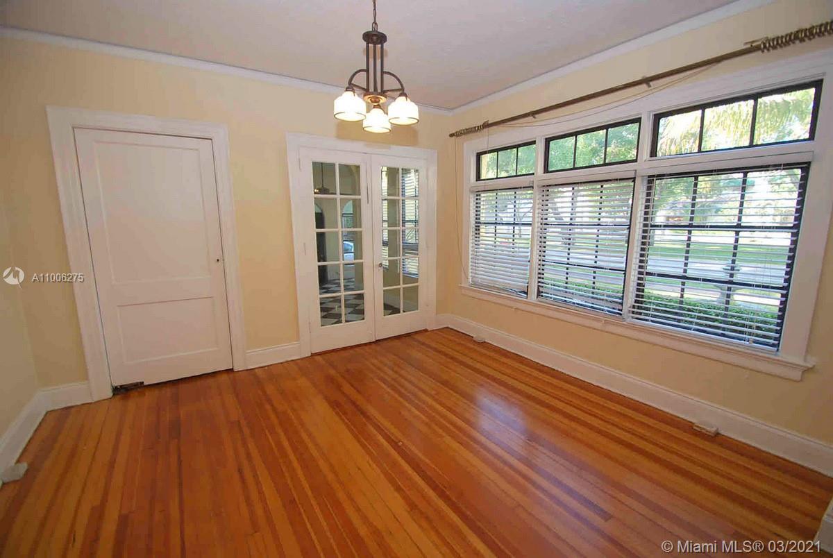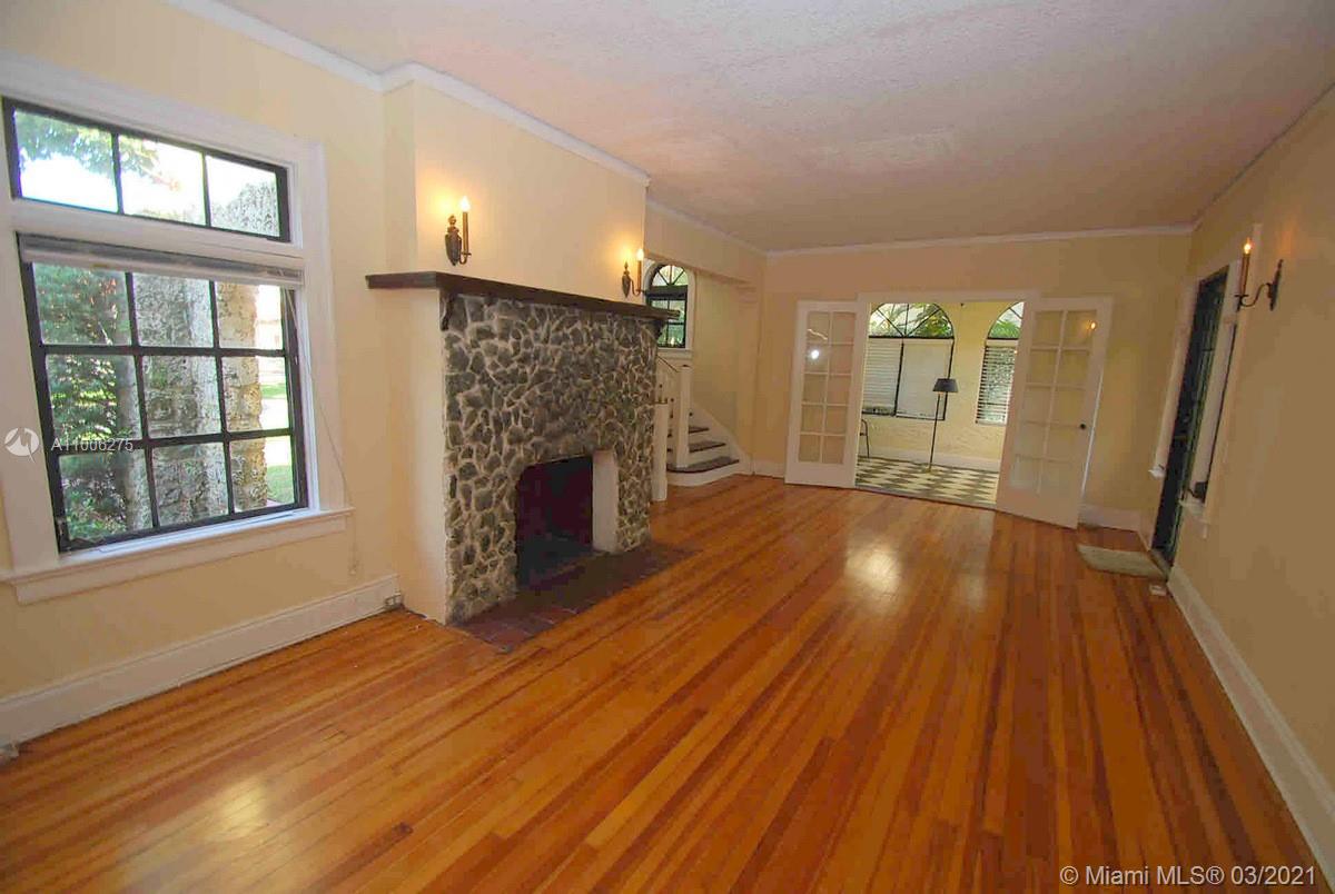 Charming Old Spanish home sits pretty on elegant and picturesque tree-lined Alhambra Circle. A coral rock covered entry leads to a foyer. Beyond is the living room, sunroom and a formal dining, spacious kitchen with eat-in area and bar or pantry. The main house has two bedrooms on the first floor, including the principal suite, and the third bedroom upstairs. Most of the home has pine wood floors. A separate, original structure has two living areas: a studio with a bath on the second floor, a two-bedroom, one bath unit on the first floor plus a full two-car garage with laundry. Romantic pool surrounded by mature trees and beautiful garden, fountains.