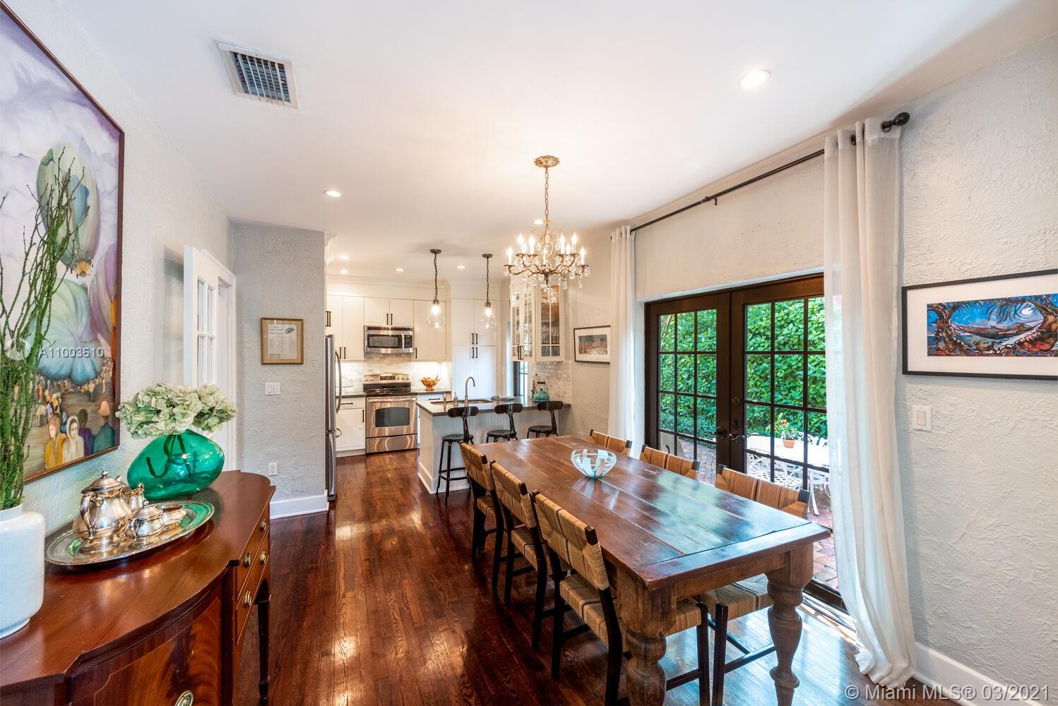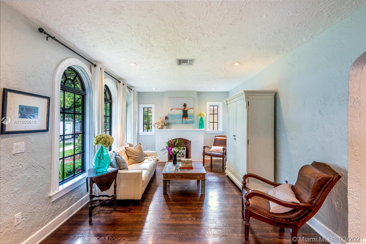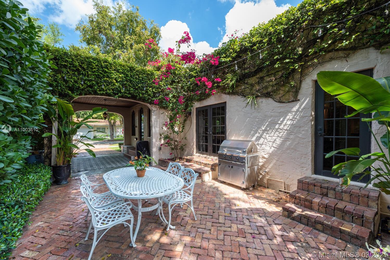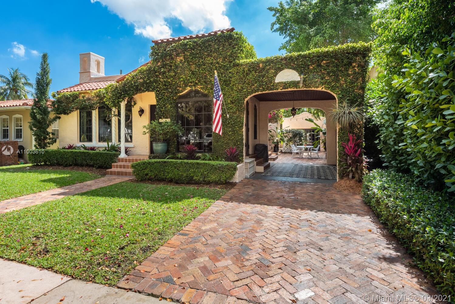 Situated on one of Coral Gables beautiful tree-lined streets & meticulously maintained & renovated. This 1926, Old Spanish, 3 bedroom 2 bath home has a detached 1/1 guest house, 2023SF total area & sits on a 5,000 SF lot. Fall in love with a charming outdoor space filled with lush landscape of ivy & orchids, a Porte-a-corchere, brick pavers & BBQ area great for family entertaining. Enter into an open space living area w/ beautiful Dade County Pine wood floors, wood-burning fire place, bonus room, large dining with French doors leading to the exterior & an updated kitchen w/ quartz countertops & newer s/s appliances. Arched IMPACT windows & doors allow lots of natural light flow through this home. Quiet street with no through traffic. Walking distance to Miracle Mile shops & restaurants!