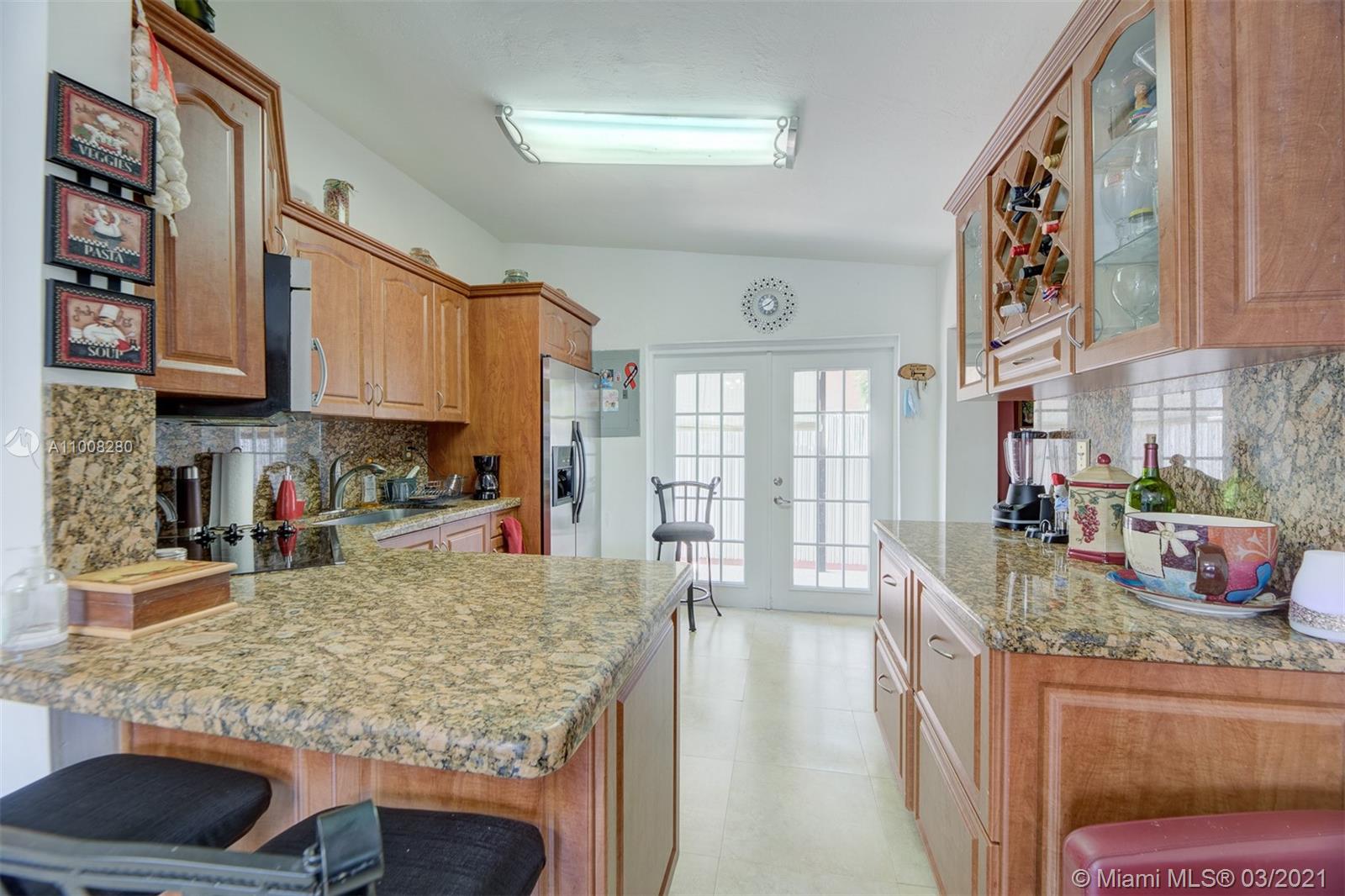 This corner lot home is great for outdoor entertainment! Featuring a custom bar, a large sink and a brick oven. The patio has plenty of room for activities. Inside, the kitchen and bathrooms have been tastefully remodeled. Newer appliances and tile floors are present throughout the home. The property is also fully fenced and has impact windows and accordion shutters.