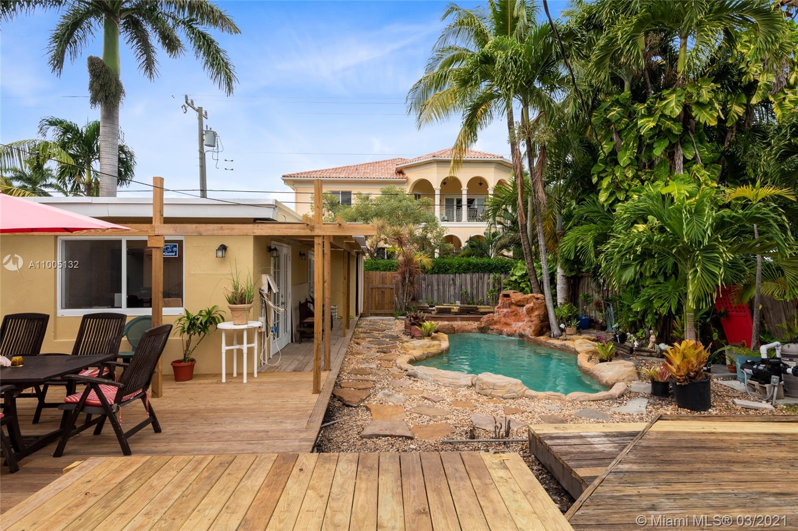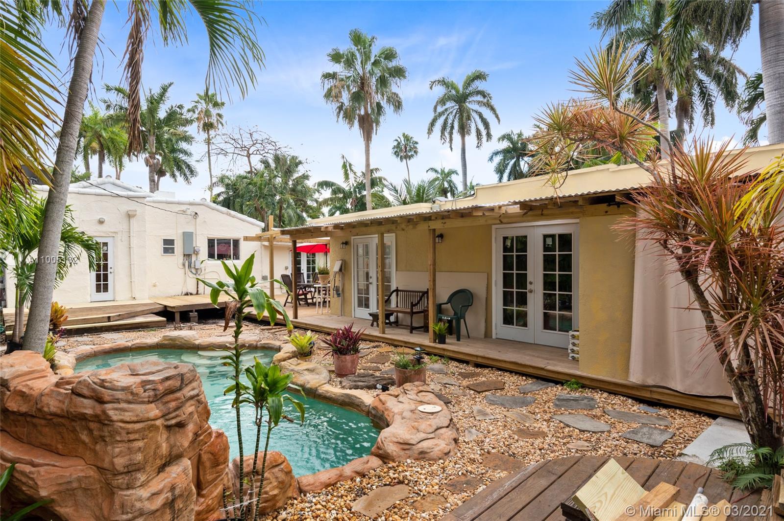 Amazing opportunity to own an original Hollywood Lakes Mediterranean Revival home. Built in 1924 its historical significance will endure. Home features a detached guest living house, beautiful rockscaped in ground pool, and rear deck space ideal for entertaining. Royal palms line the street just minutes to the beach and downtown. Hollywood Lakes is the premiere beachside community in SE Broward with easy travel to Ft Lauderdale and Miami. Home is concrete block on pilings with 2 bd/2ba plus a rear guest house with 1bd/1ba with partial interior renovations. Home eligible for the Historical registry with the proper touches. Bring your imagination and make this a great home or vacation retreat.