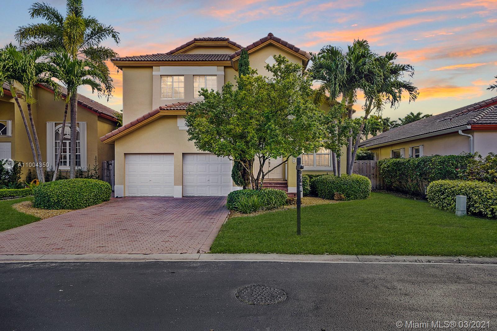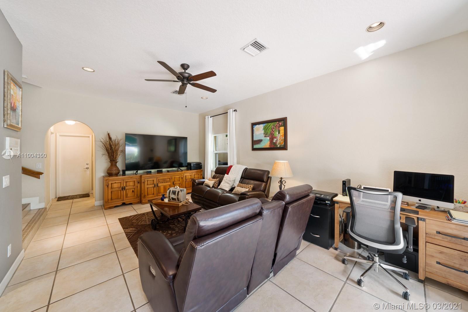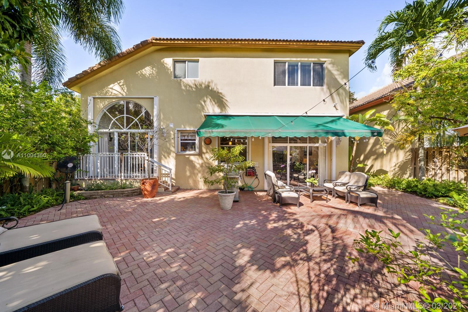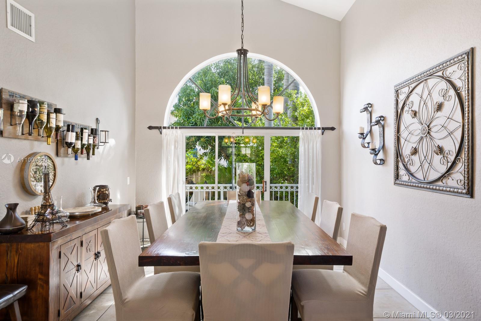 Elegant home featuring vaulted ceilings lots of natural light from the arched windows, spacious living area. Remodel kitchen with stainless steel appliances all the comforts of a luxury home, including a wine cooler, all wood cabinets with under light, spacious pantry area and room for a breakfast table. Florida room opens access to the patio 1 full bath and laundry room on 1st floor Beautiful wooden stairway takes you to 2nd floor 1 Master and 3 more comfortable bedrs. The back yard is paved ,electrical awning including cozy landscaping with fruit trees and exotic plants, custom made aviary to enjoy nature and relax with the family. Impact windows & accordion shutters, 2 car garage with an extra refrigerator, 2 new AC units. Low HOA $219 Gated