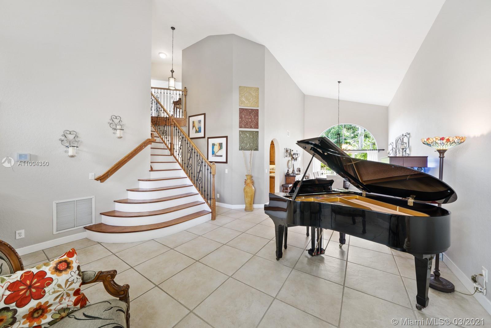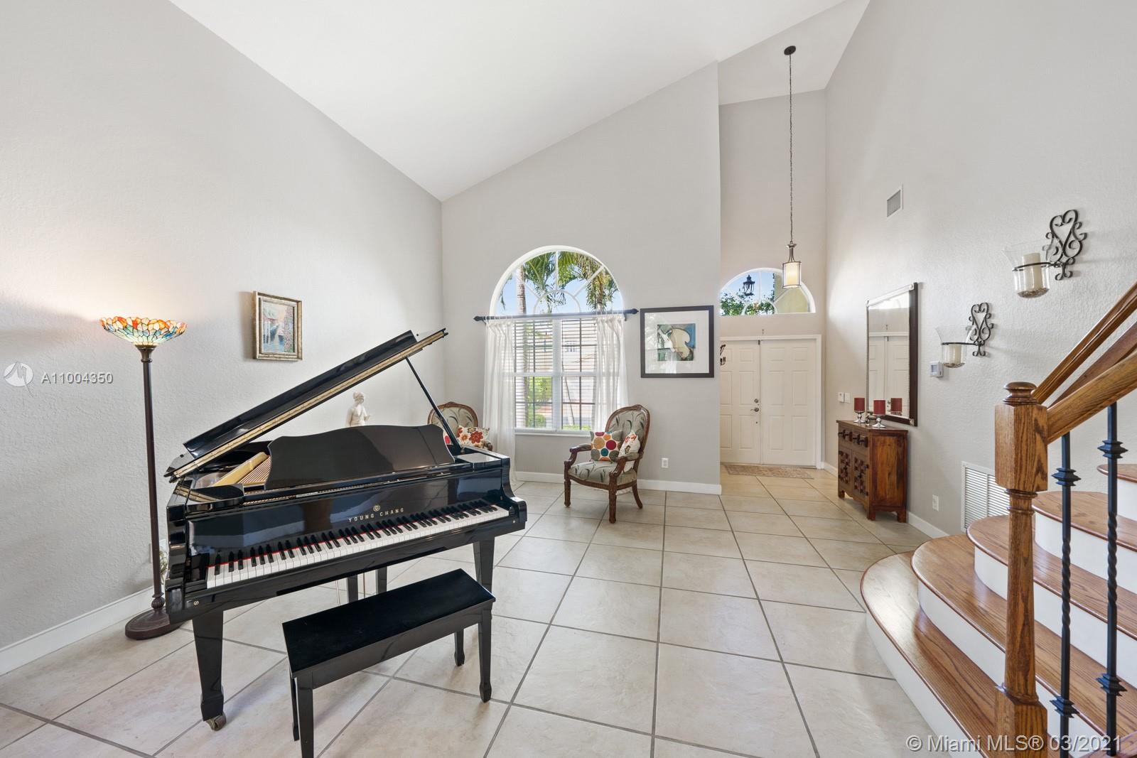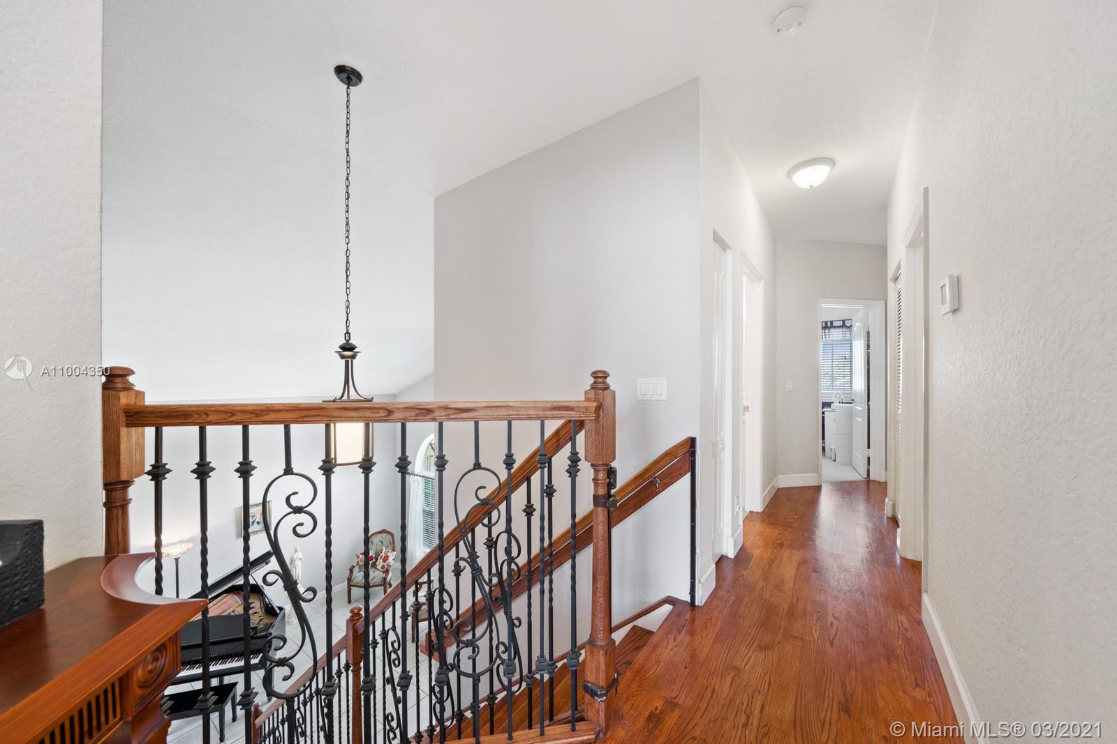 Elegant home featuring vaulted ceilings lots of natural light from the arched windows, spacious living area. Remodel kitchen with stainless steel appliances all the comforts of a luxury home, including a wine cooler, all wood cabinets with under light, spacious pantry area and room for a breakfast table. Florida room opens access to the patio 1 full bath and laundry room on 1st floor Beautiful wooden stairway takes you to 2nd floor 1 Master and 3 more comfortable bedrs. The back yard is paved ,electrical awning including cozy landscaping with fruit trees and exotic plants, custom made aviary to enjoy nature and relax with the family. Impact windows & accordion shutters, 2 car garage with an extra refrigerator, 2 new AC units. Low HOA $219 Gated