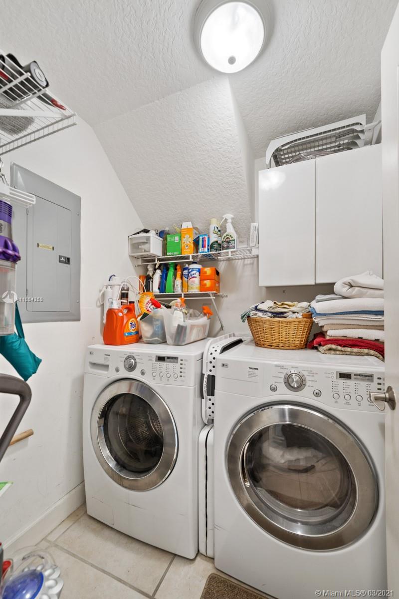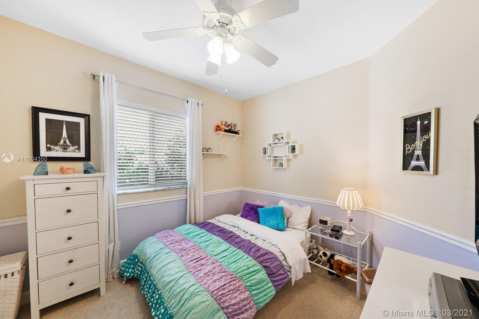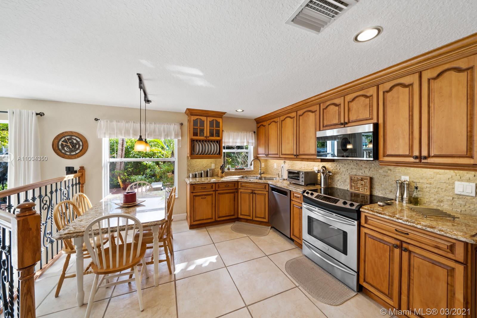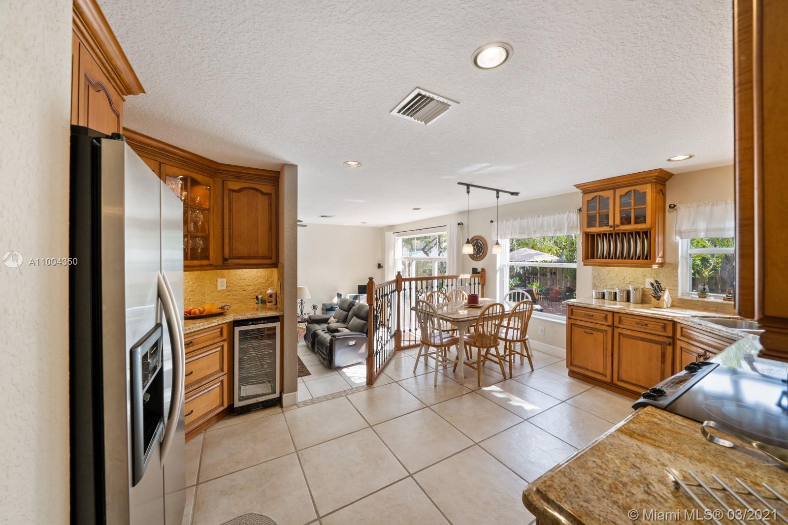 Elegant home featuring vaulted ceilings lots of natural light from the arched windows, spacious living area. Remodel kitchen with stainless steel appliances all the comforts of a luxury home, including a wine cooler, all wood cabinets with under light, spacious pantry area and room for a breakfast table. Florida room opens access to the patio 1 full bath and laundry room on 1st floor Beautiful wooden stairway takes you to 2nd floor 1 Master and 3 more comfortable bedrs. The back yard is paved ,electrical awning including cozy landscaping with fruit trees and exotic plants, custom made aviary to enjoy nature and relax with the family. Impact windows & accordion shutters, 2 car garage with an extra refrigerator, 2 new AC units. Low HOA $219 Gated