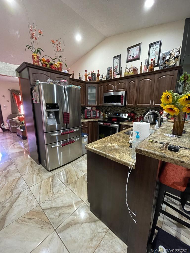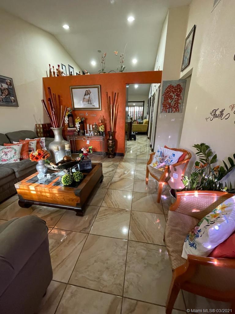 Beautiful Hialeah house!. Nicely decorated. High Ceilings, Remodeled Kitchen and bathrooms, Stainless Steal appliances. Tile throughout. Relaxing Covered Terrace, Driveway fits three cars. Roof is only 2 years new. Mango and avocado tree. HOA $110 annual. Owner occupied please call LA for showing instructions. Realtors, please wear a mask.