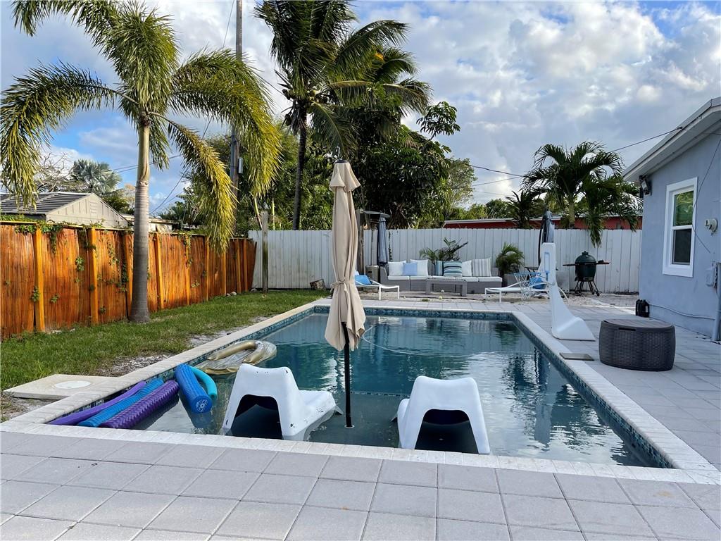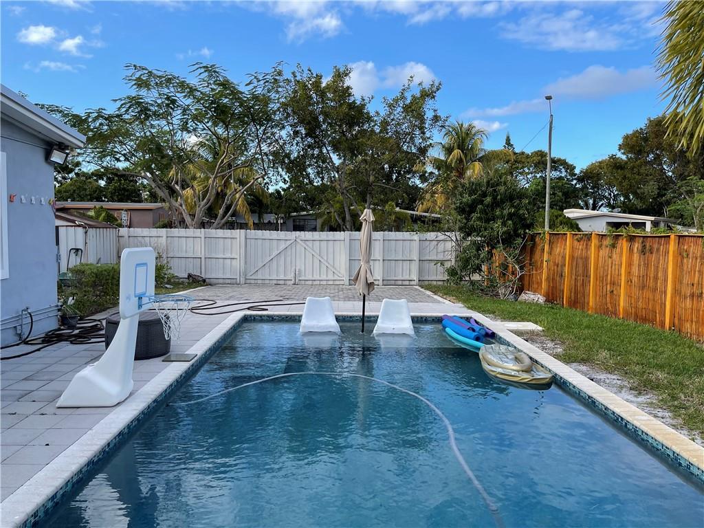 Beautifully upgraded 3/2 home plus den/office in the heart of east Pompano Beach. Upgrades include Hurricane impact windows & doors, custom built kitchen w/ top of the line appliances, wardrobe closets throughout the house, remodeled bathrooms one featuring a deep bathtub, gas water Heater, below ground gas heated salt chlorinated pool w/ spa & fountain jets and much more. This corner home has large front and backyard with a circular paved driveway and a side driveway that can be used for boat or RV parking, two sheds storage and newer fence.