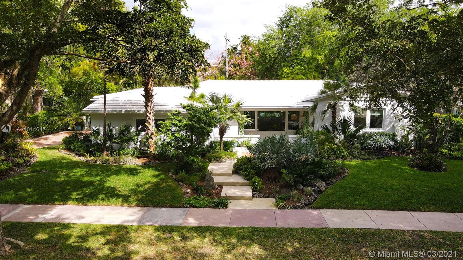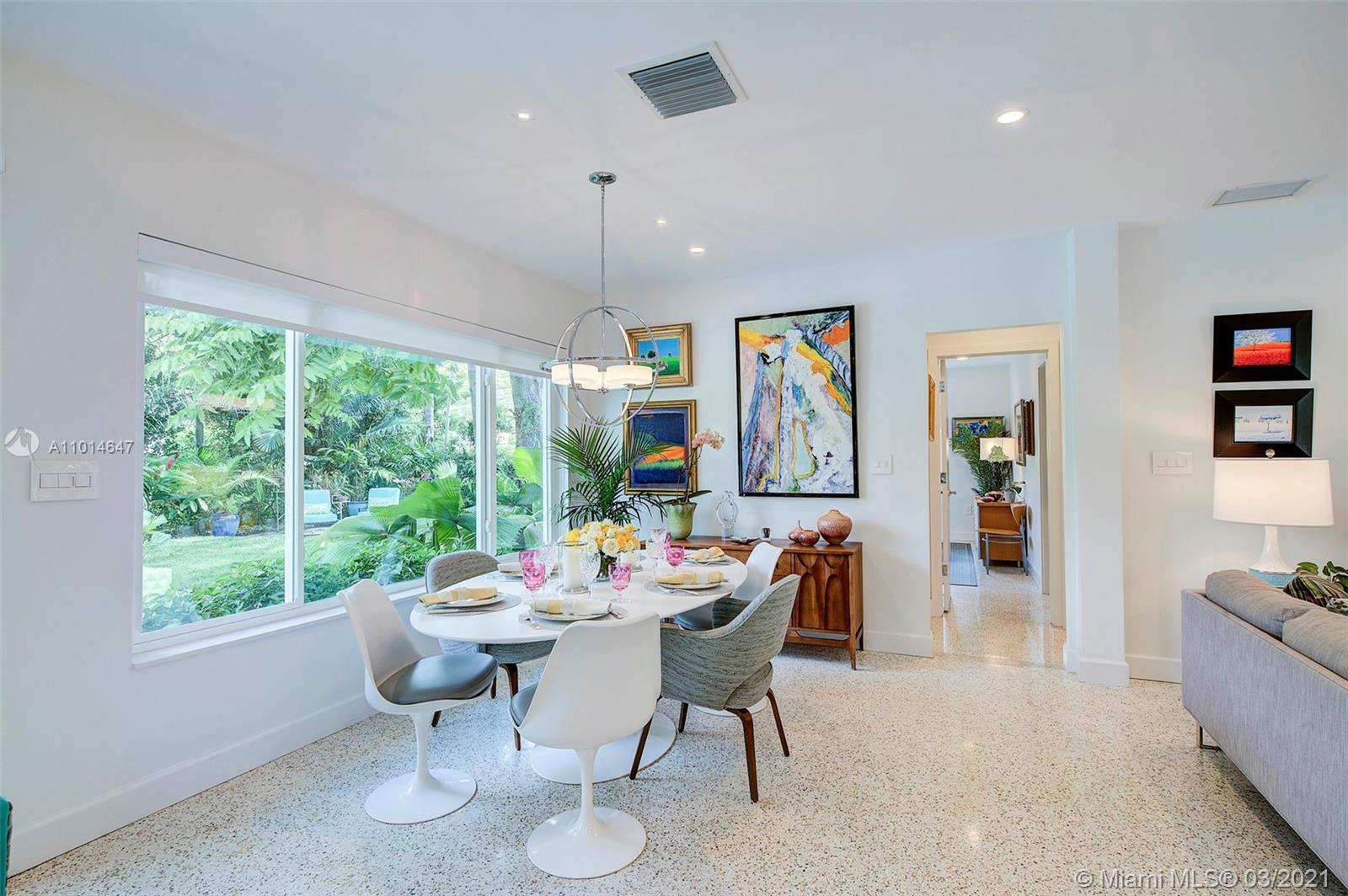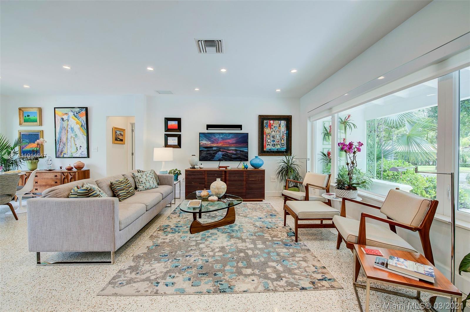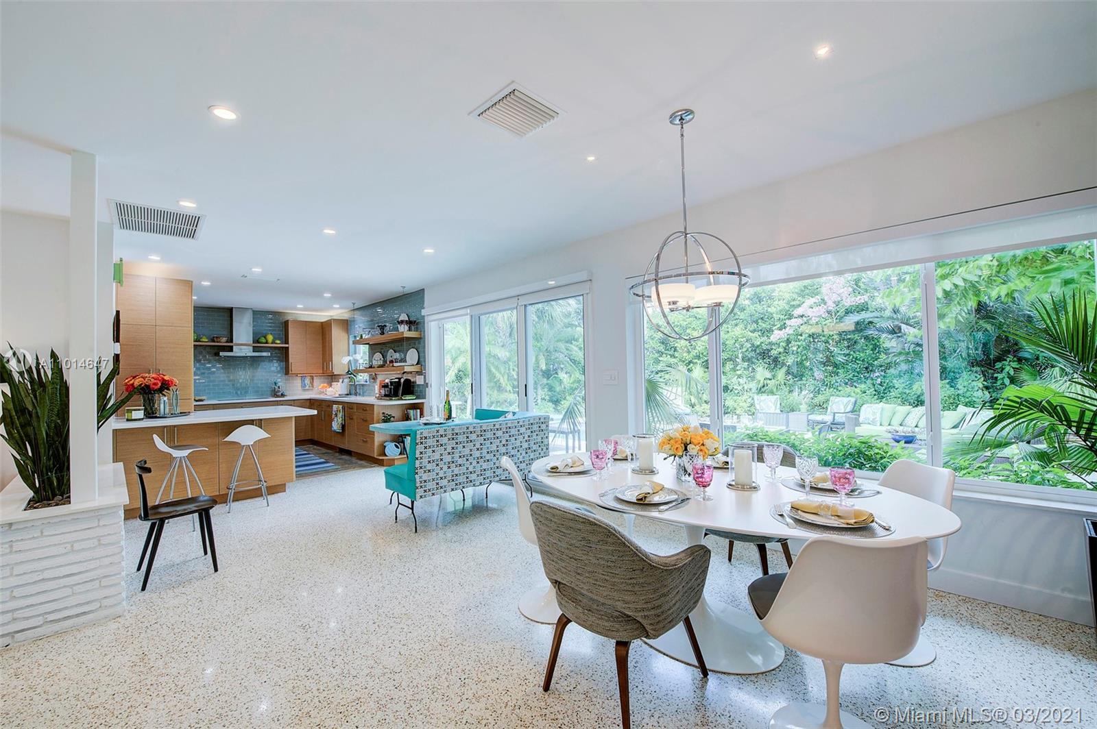 Mid century classic three bedroom renovated to perfection inside and out in the coveted Riviera section of Coral Gables. Offered furnished to complement the home design and neighborhood. Expansive windows and doors provide beautiful views and access to the professionally designed landscape featuring native flora. The smallest details were considered in maximizing the space to make the most of the Florida lifestyle. Multiple living areas make entertaining a breeze. Home chef's dream kitchen, induction & integrated Bosch appliances. Bedrooms have custom outfitted walk in closets and spa like baths. Heated salt water pool, built in summer kitchen, landscape and pool lighting with plenty of room for entertaining on this double lot. Complete renovation from the roof to the septic.