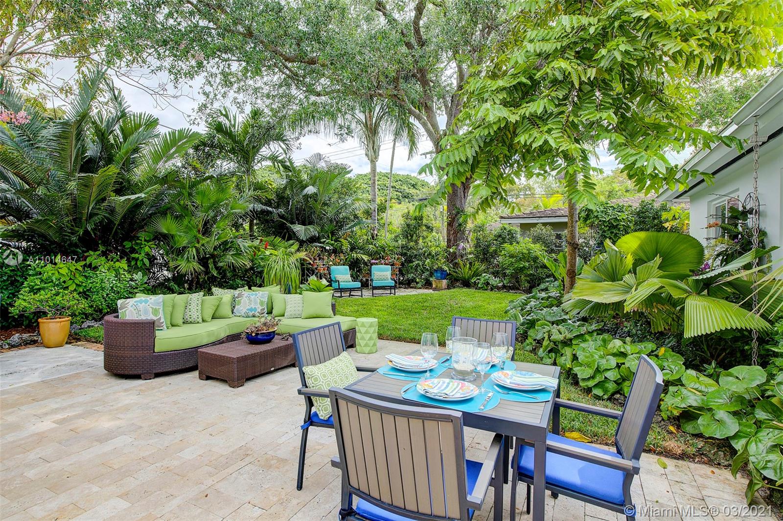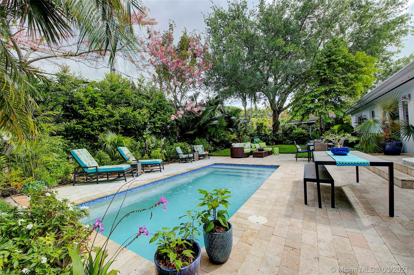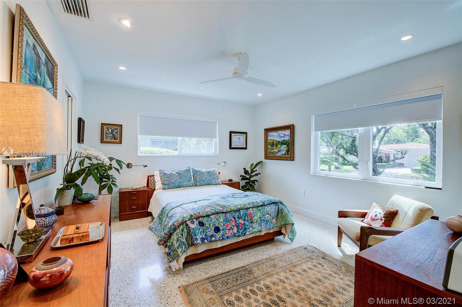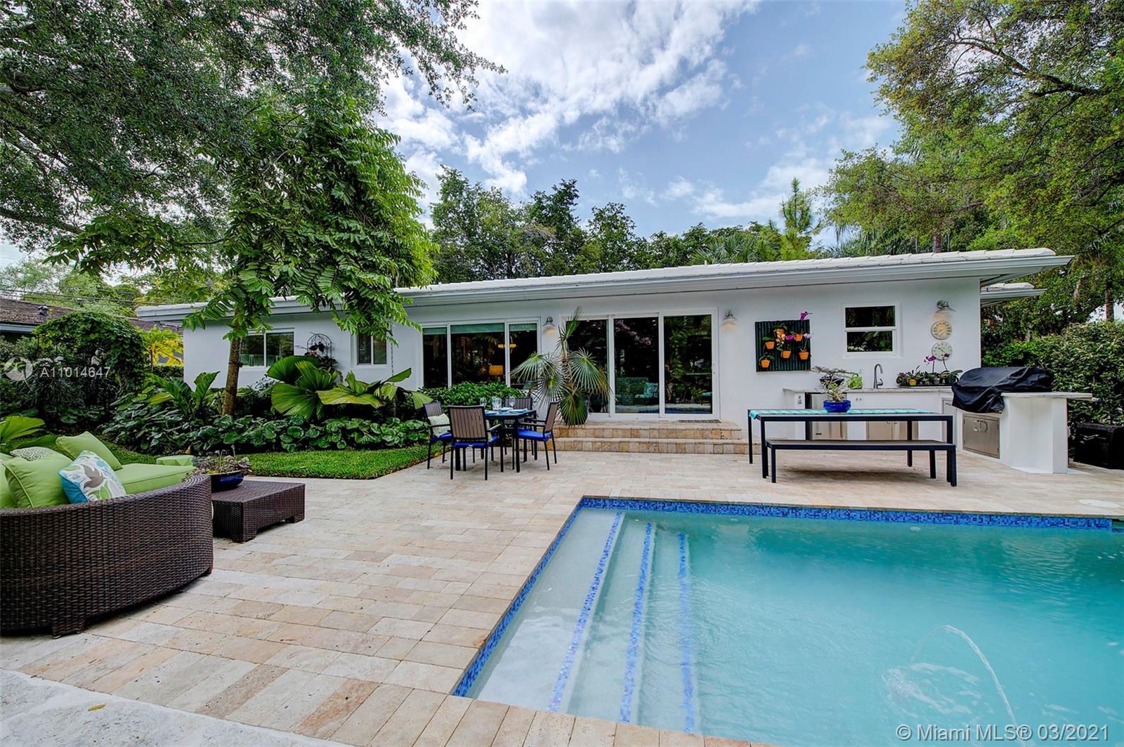 Mid century classic three bedroom renovated to perfection inside and out in the coveted Riviera section of Coral Gables. Offered furnished to complement the home design and neighborhood. Expansive windows and doors provide beautiful views and access to the professionally designed landscape featuring native flora. The smallest details were considered in maximizing the space to make the most of the Florida lifestyle. Multiple living areas make entertaining a breeze. Home chef's dream kitchen, induction & integrated Bosch appliances. Bedrooms have custom outfitted walk in closets and spa like baths. Heated salt water pool, built in summer kitchen, landscape and pool lighting with plenty of room for entertaining on this double lot. Complete renovation from the roof to the septic.