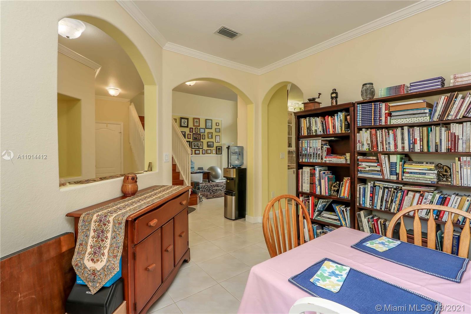 Gorgeous 3 bedrooms, 2.5 bathroom, 2 car garage plus driveway parking and 5 visitor parkings close by, formal living room, formal dining room, family room, open kitchen with large breakfast counter bar, pantry, volume ceilings, crown molding, fenced patio with pavers throughout, rear porch/terrace, bedrooms upstairs, in the gorgeous gated community of Las Cascadas. Community pool, close to great schools, turnpike, Dolphin and International mall, Dinning and more!!!!