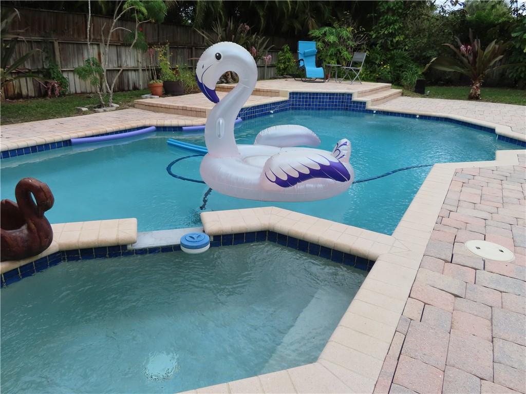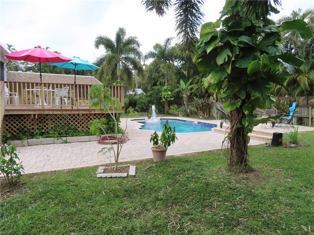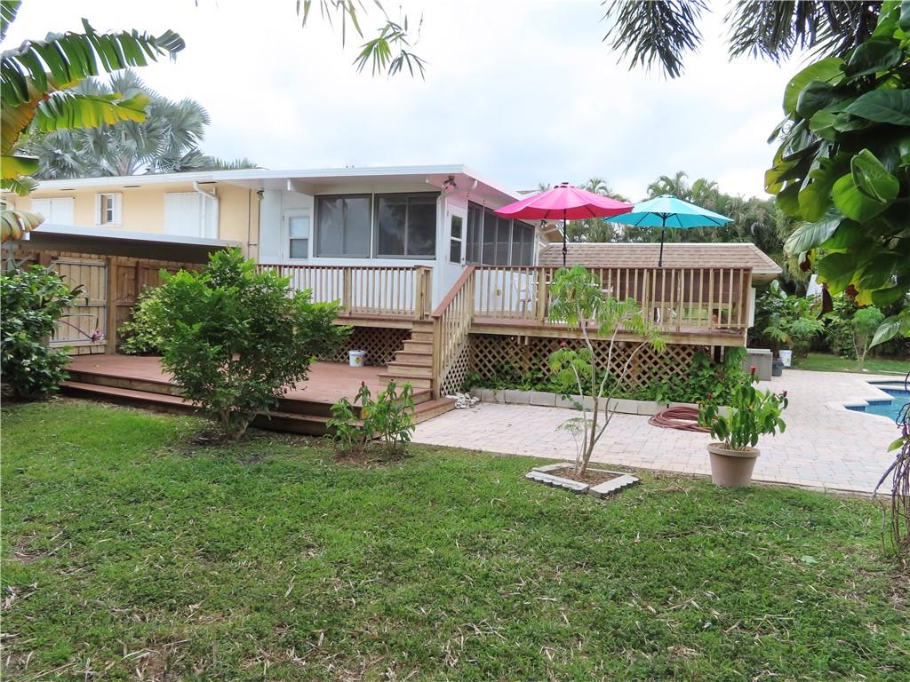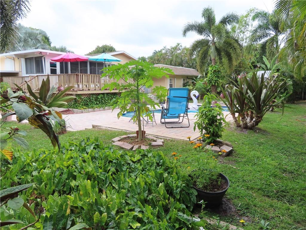 One of a kind on huge lot! Tons of parking - bring the boat, trailer, or RV - bring all 3! Circular drive plus 2 car carport & separate driveway. House re-built in 2007 after a fire. Tri-level home with basement storage. Eat-in kitchen features wooden cabinets & stainless steel appliances. Private Master suite on ground level may be accessed from house and/or has private entrance. Large two story deck overlooking free form pool & paver patio Yard is a lush private tropical oasis with fruit trees, heliconia, bamboo & space to spread out. Dual A/C. Additional storage shed on side (outside fence) has electric. Accordion shutters for house windows but not enclosed porch (lanai). Lanai cooled with wall unit. Septic tank on west side of house replaced in 2019. A/C new in 2019.