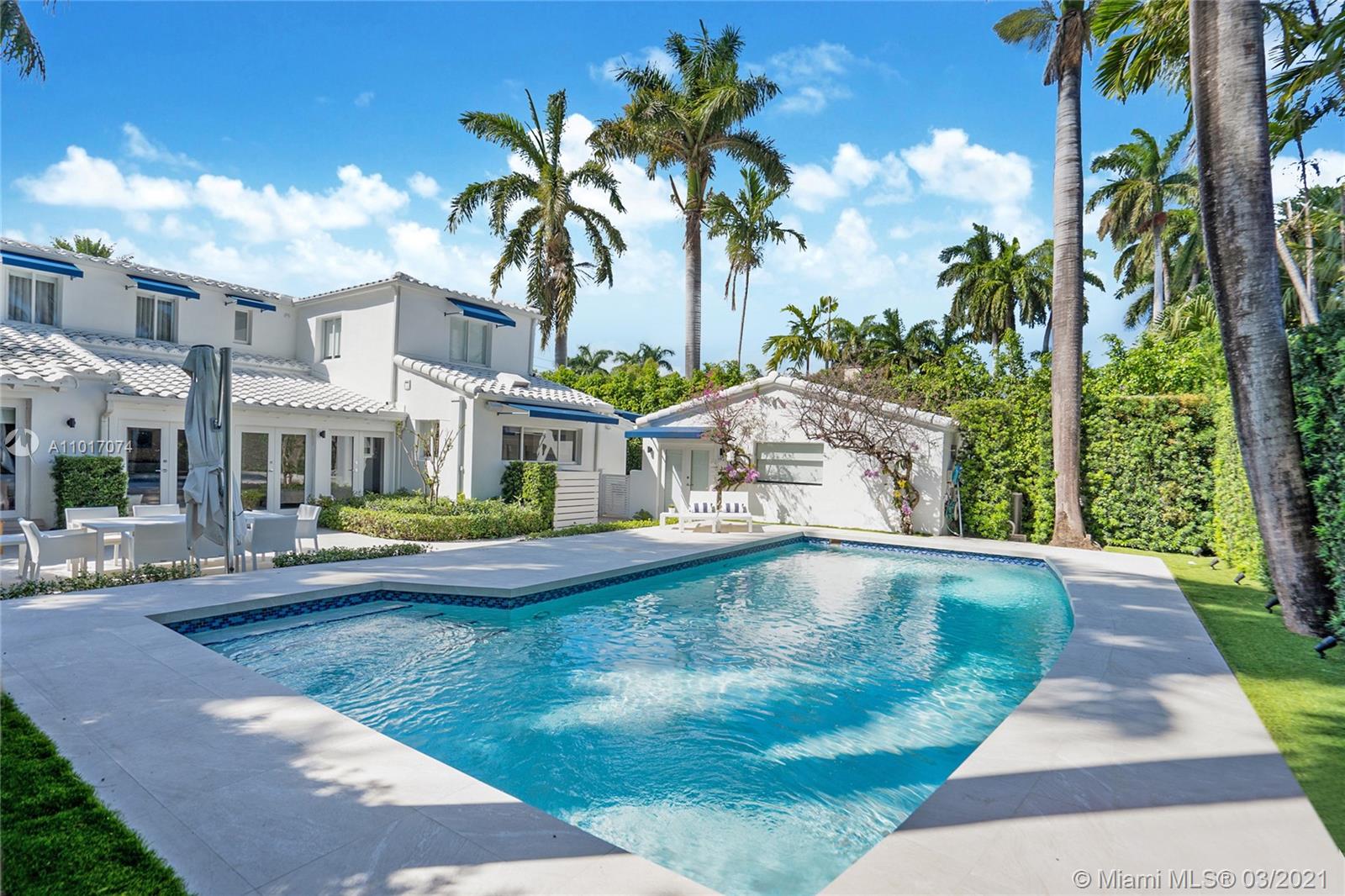 Enjoy living in this impeccably renovated and stylish two story residence located at the desirable and prestigious North Bay Road in Miami Beach. Spacious and bright home features 4 bedrooms / 4 baths which includes a 1 bed / 1 bath guest house and pool cabana. Art Deco architect Russell Pancoast design with a grand entryway staircase, open floor plan, top of the line finishes, Sonos smart sound system, security camera system throughout, electric carport fence, hurricane impact windows and doors. Amazing open chef's kitchen equipped with Wolf gas appliances, designer upgrades and finishes. Backyard is an entertainers paradise oasis with a private heated salt water pool, towering palm trees, lush landscaping, and fountain for the perfect ambiance. Close to great schools & Mt. Sinai Hospital