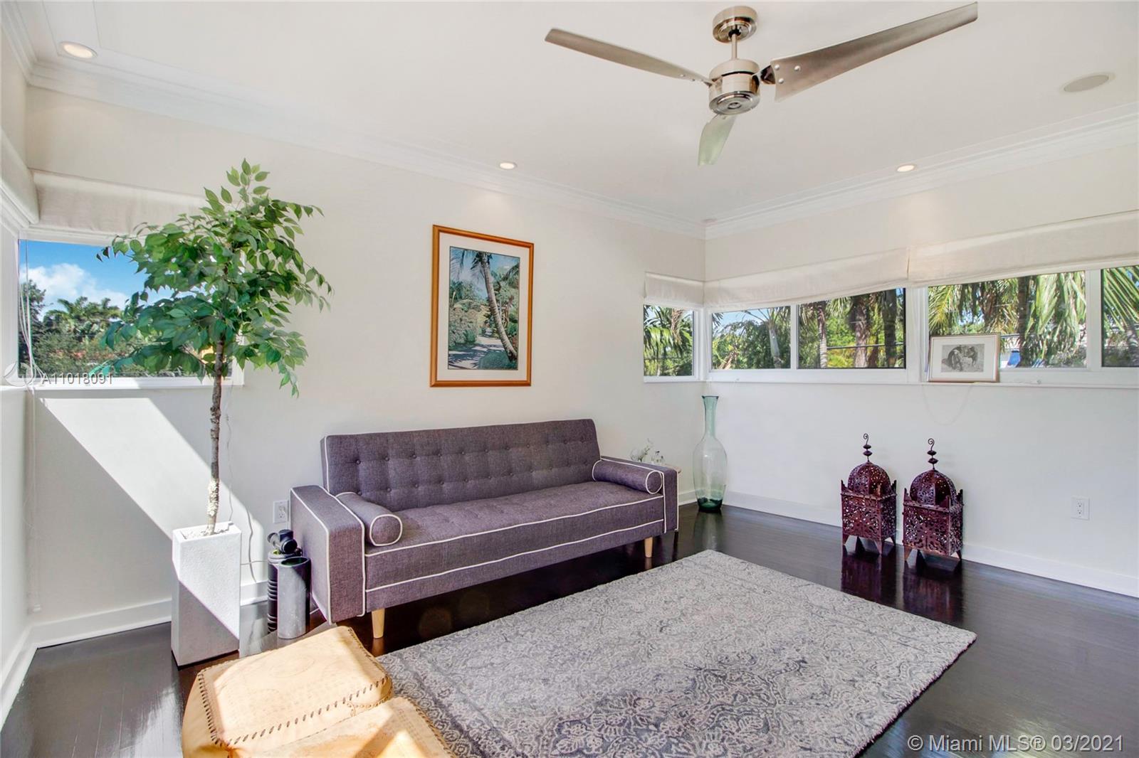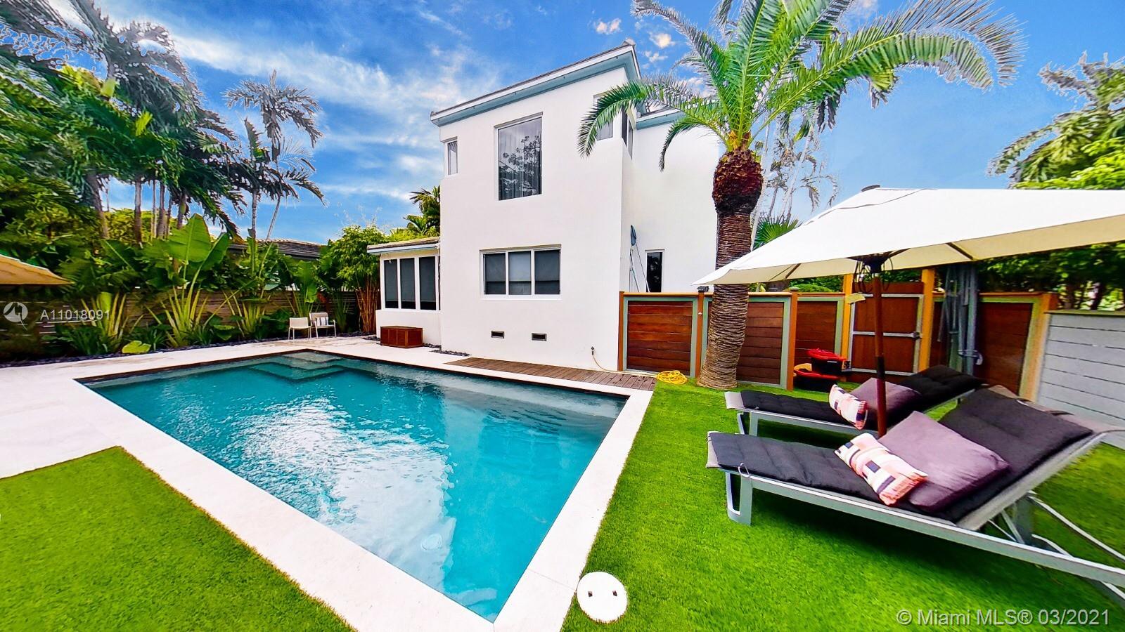 This fully renovated and meticulously upgraded 4 bedroom pool home is located on one of only a handful of "flow-thru" corner lots in Miami Beach. Tons of natural light in every room! Professionally manicured, the outside space includes a fully gated and beautifully landscaped yard, an oversized salt water pool, lush tropical trees, retractable awnings, and a BBQ area. Impact windows throughout. New roof, custom drapes and blackout shades, new kitchen, fully remodeled bathrooms, master bath with tub and steam shower, upstairs wet bar, hardwood floors, and lots of custom detail. House also has a huge sunroom, an office, and a full sized laundry/storage room. Walking distance to the park, beach, golf course, and more. Click link for 3-D virtual tour. Call listing agent to schedule showing.