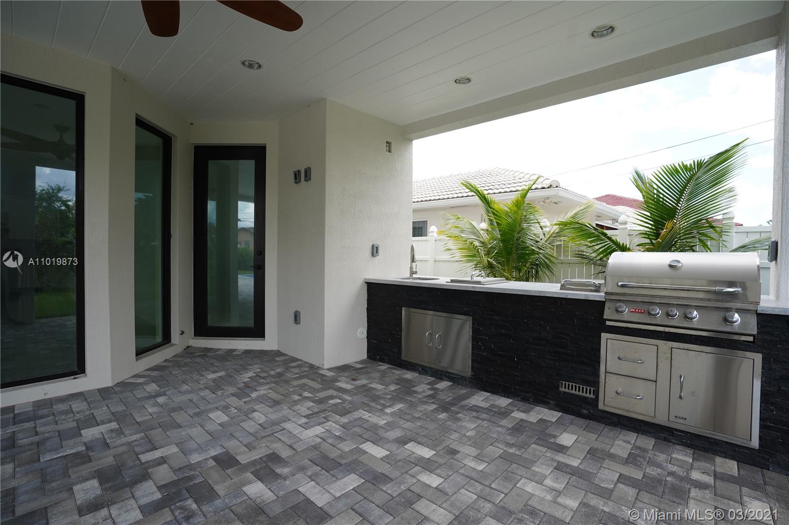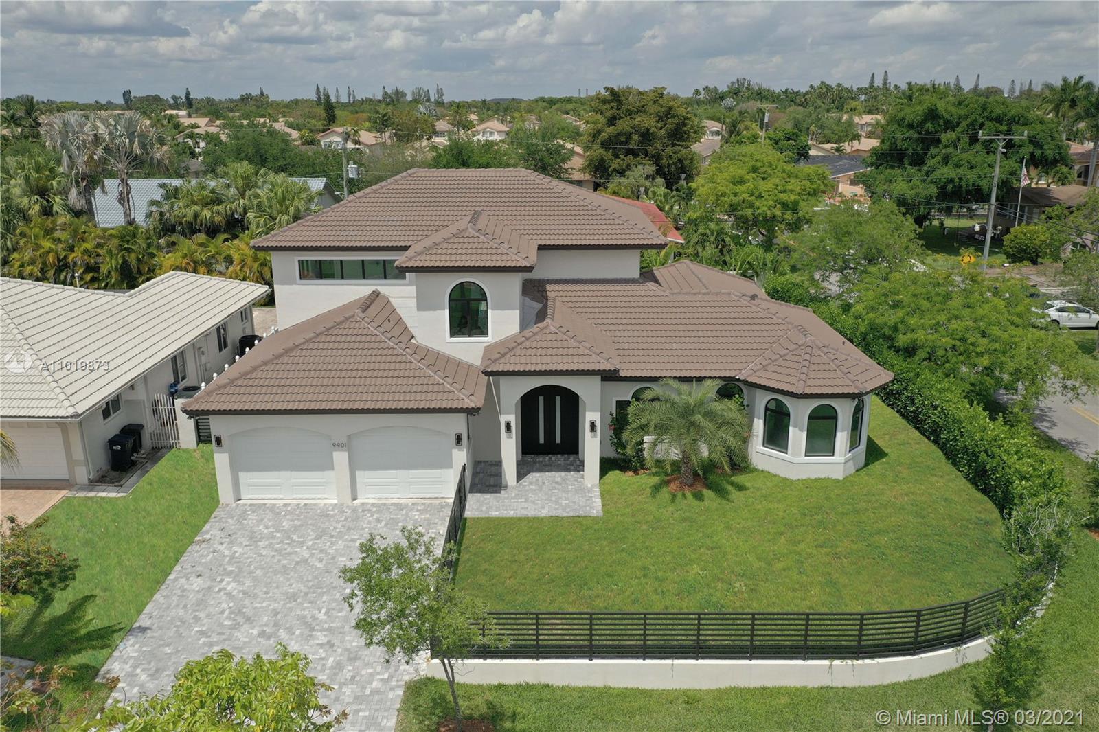 This astounding two story custom home is a new construction and sits on a corner lot of almost half an acre with luxurious landscaping that provides an ambiance of privacy and tranquility. The main entrance brings you into the living area, an open concept design with high ceilings and picture windows that is extremely ample and full of natural light. The ground floor also showcases an impressive master suite, spacious kitchen with marble throughout and new stainless-steel appliances, dining room, den, laundry room and a full guest/pool bathroom. An elegant marble and glass staircase brings you to three spacious en suite rooms and a hallway work area. The backyard includes a covered terrace with an outdoor kitchen and a rectangular pool to lounge and entertain family and guests.