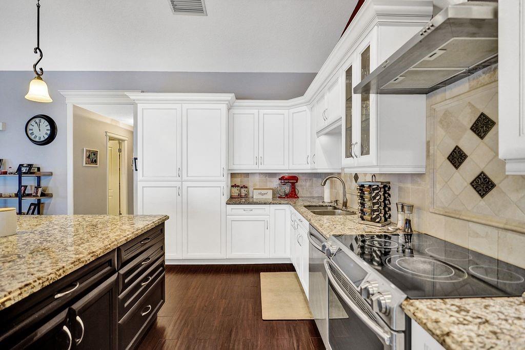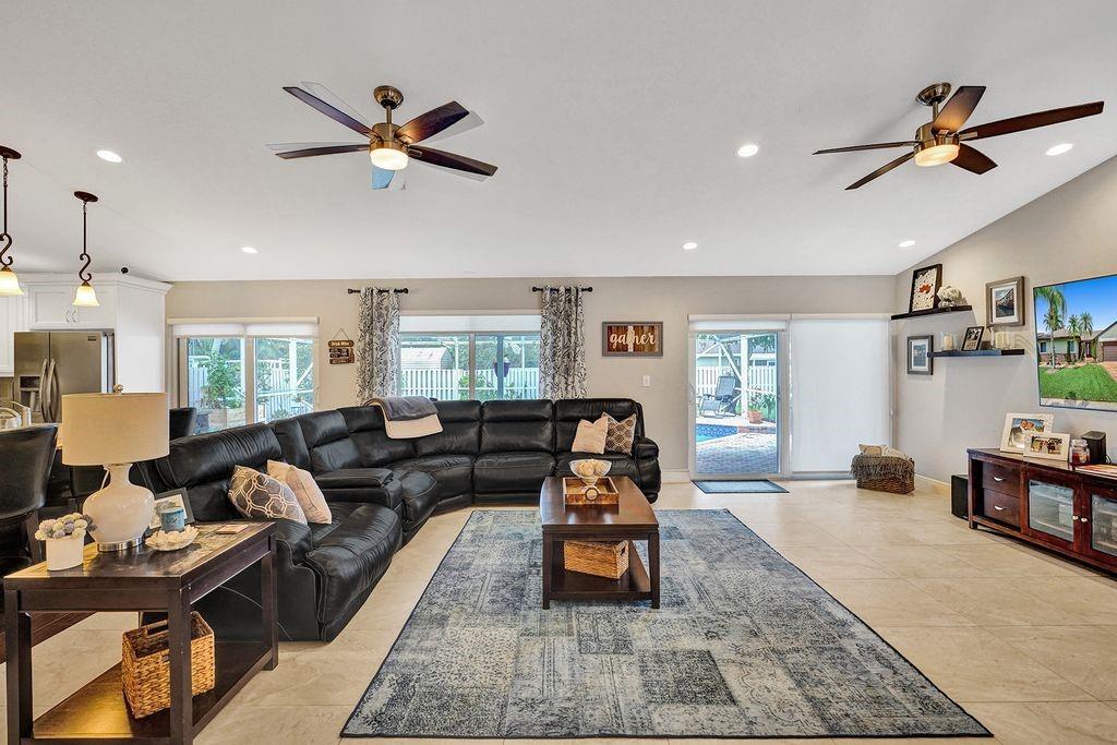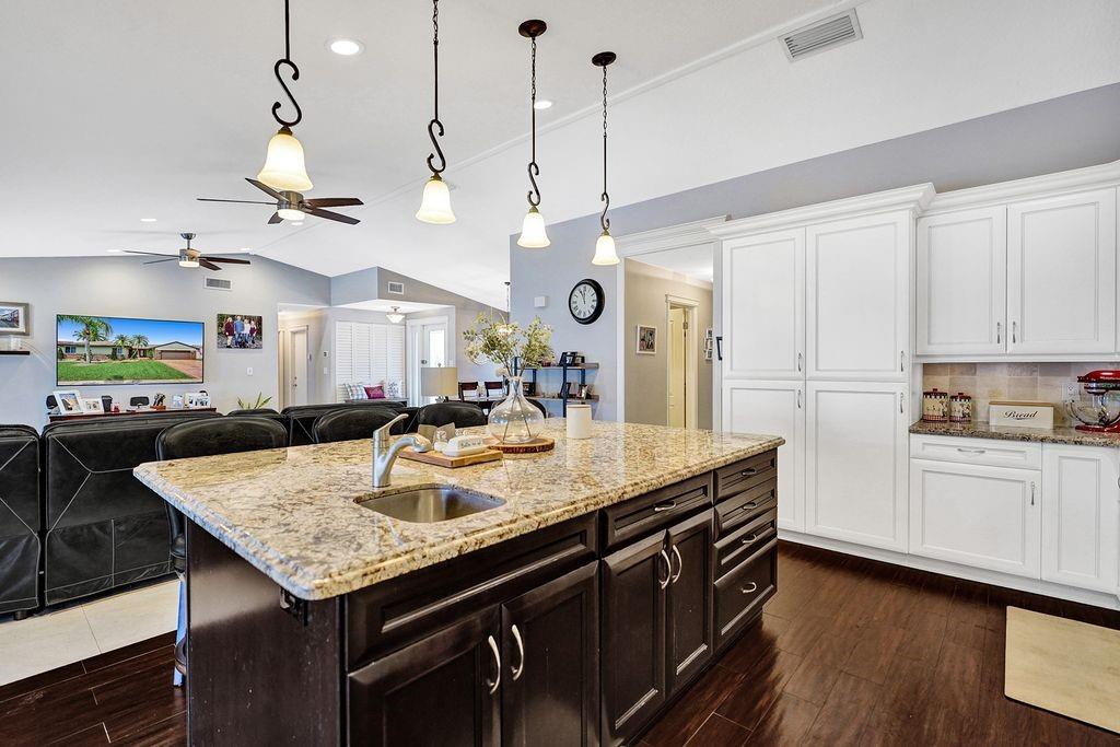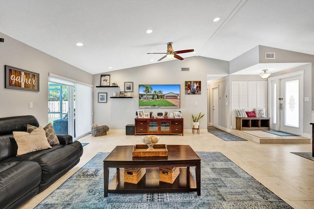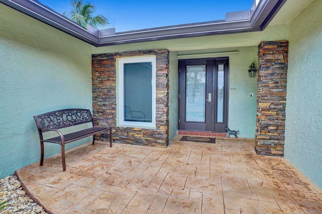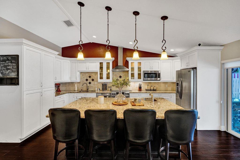 Substantially and tastefully remodeled; beginning with the expertly designed and meticulously maintained tropical landscaping, custom stamped concrete driveway with matching patio and poured concrete flower beds, premium stack stone accents on the facade, handmade mailbox with stone, and all hurricane impact windows and doors including skylight. Open living area with vaulted ceilings, custom kitchen complete with seamless premium granite, soft close cabinets and drawers with brushed aluminum fixtures, under cabinet lighting, properly ventilated stainless steel range hood, stainless steel appliances and glass top stove, dual pantry with pull out shelving, lazy susan, and wood plank style ceramic tile, 5x8 island bar. MBR walk-in closet, dual sinks + frameless glass shower door... cont. supp