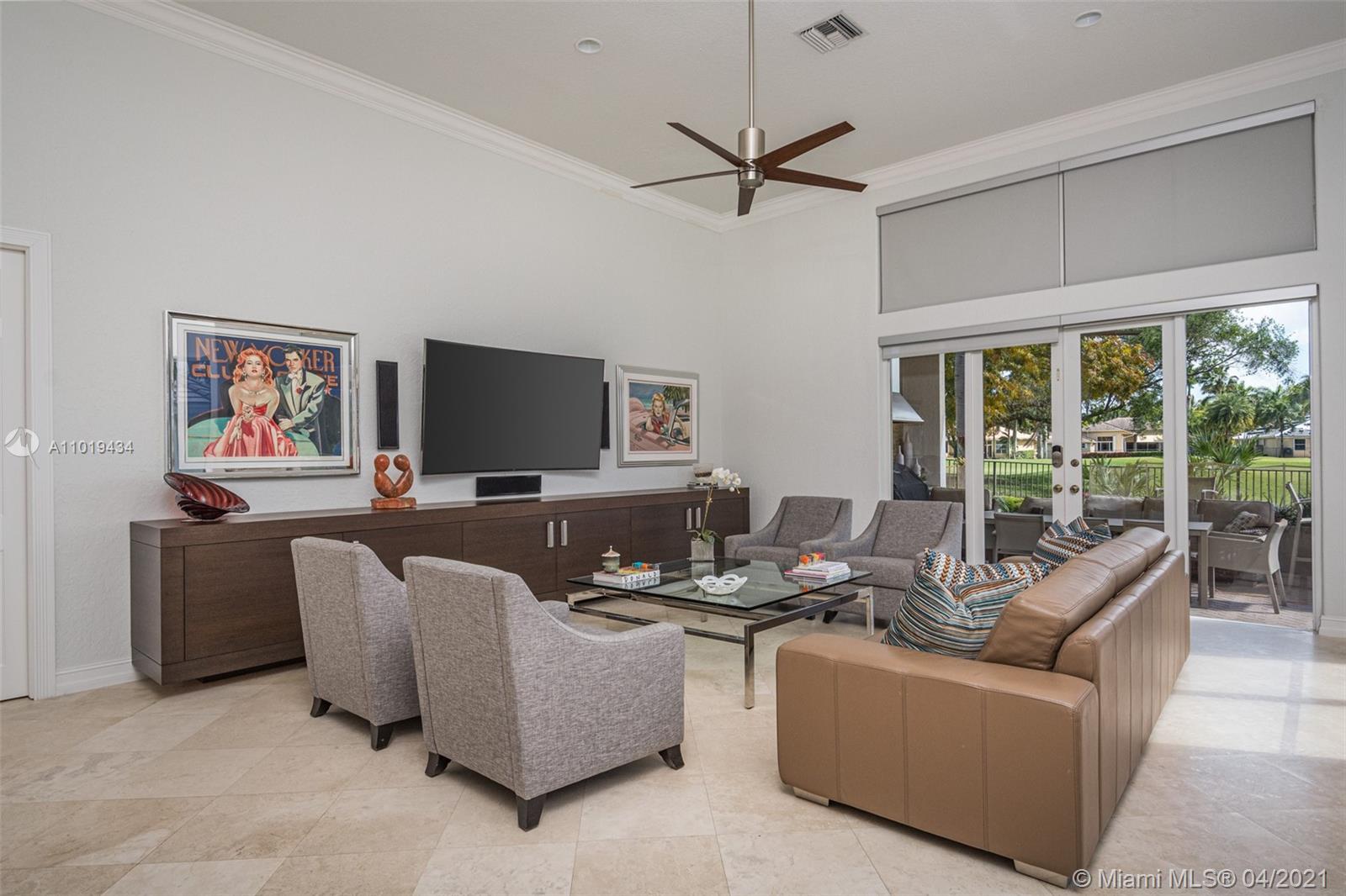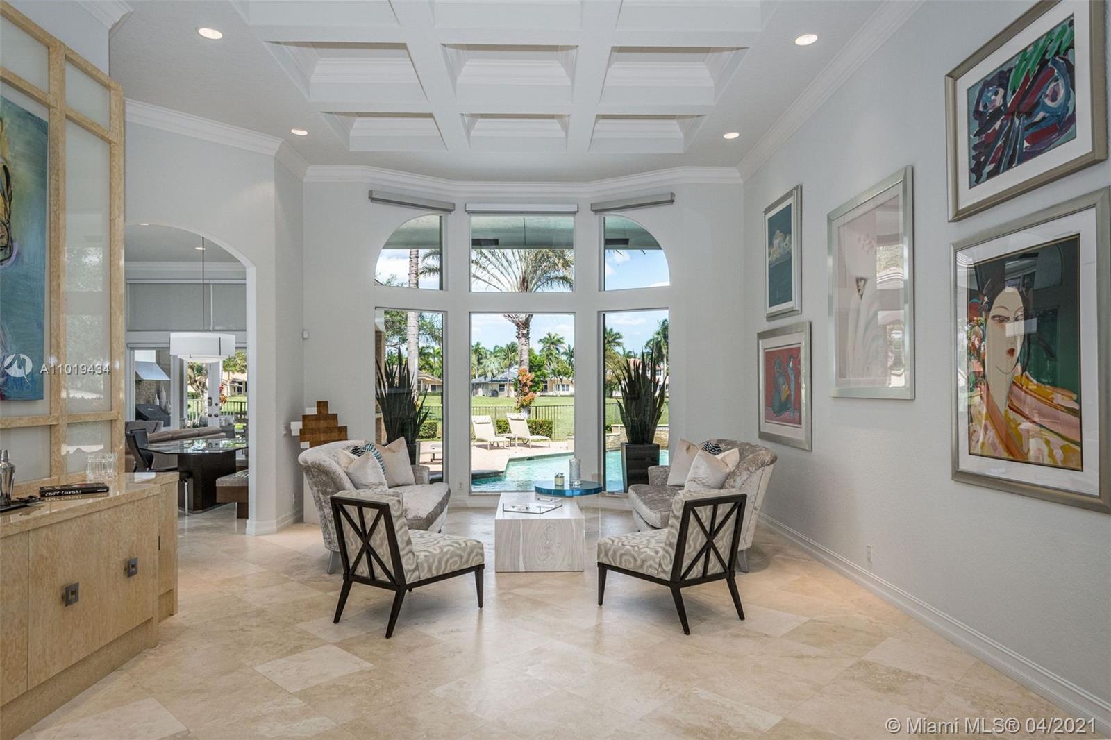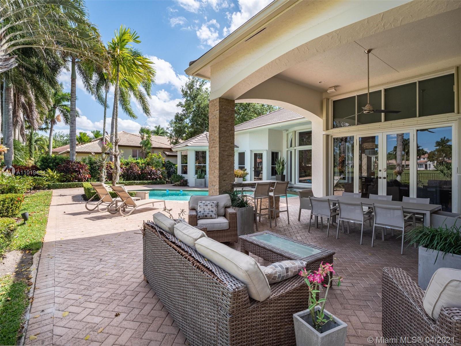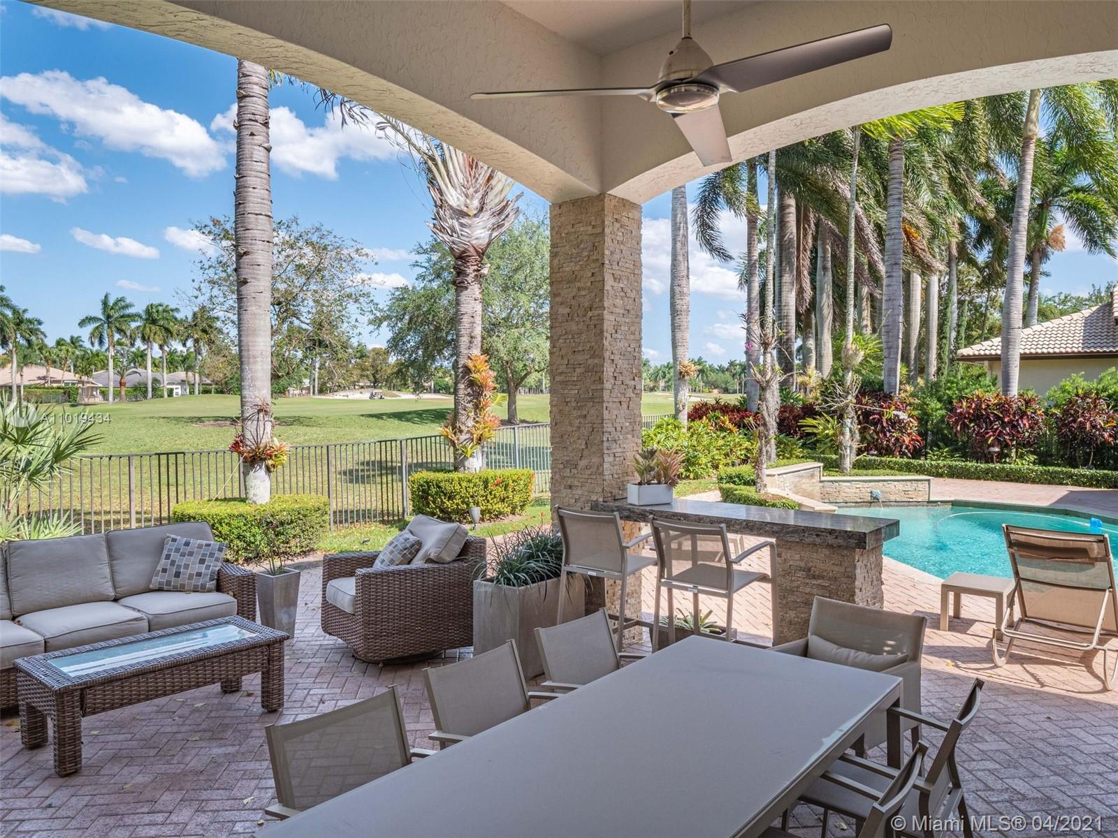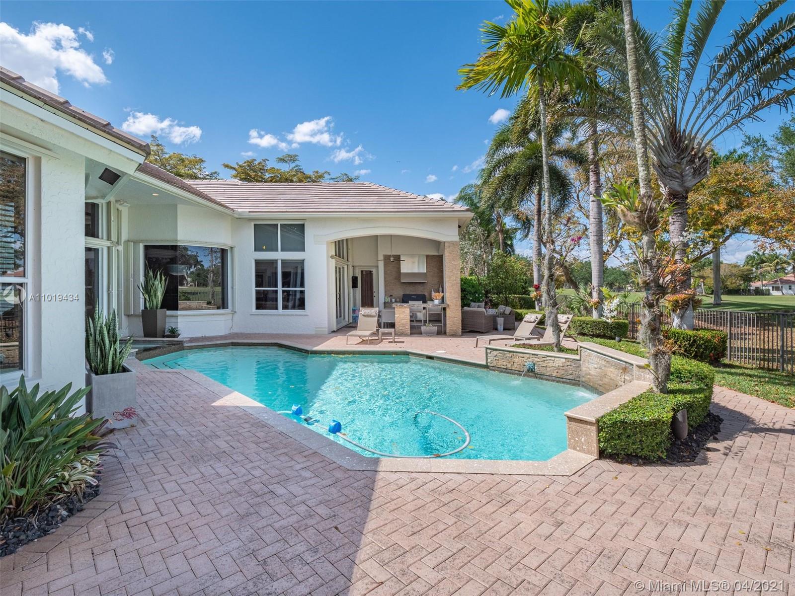 Meticulously maintained 4,364sf 5 bed/4bath/office home located on the Players Course 7th hole in Weston Hills Country Club has it all. This professionally decorated home has an open floor plan with 14' ceilings and upgrades throughout. Modern kitchen with all the top stainless steel appliances. Marble and porcelain wood-like tile floors. Huge floor to ceiling windows w/ motorized shades provide an impressive backdrop for any gathering. Oversized backyard with heated pool, spa, summer kitchen and beautiful golf course views. 2021 ROOF. Accoridan shutters. 3-car garage w/ Chicago brick pavers.