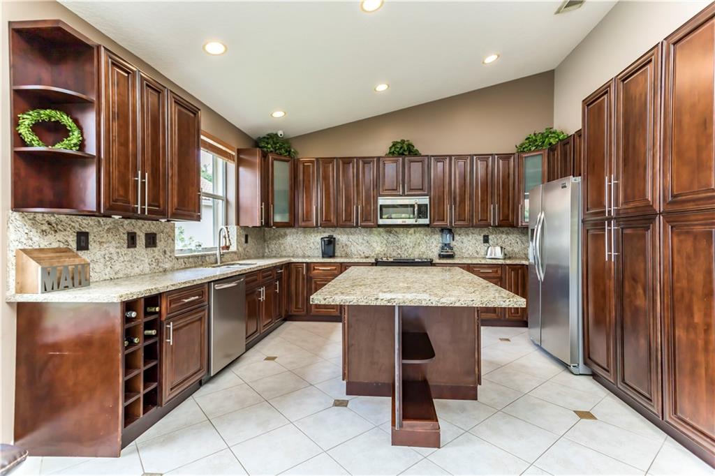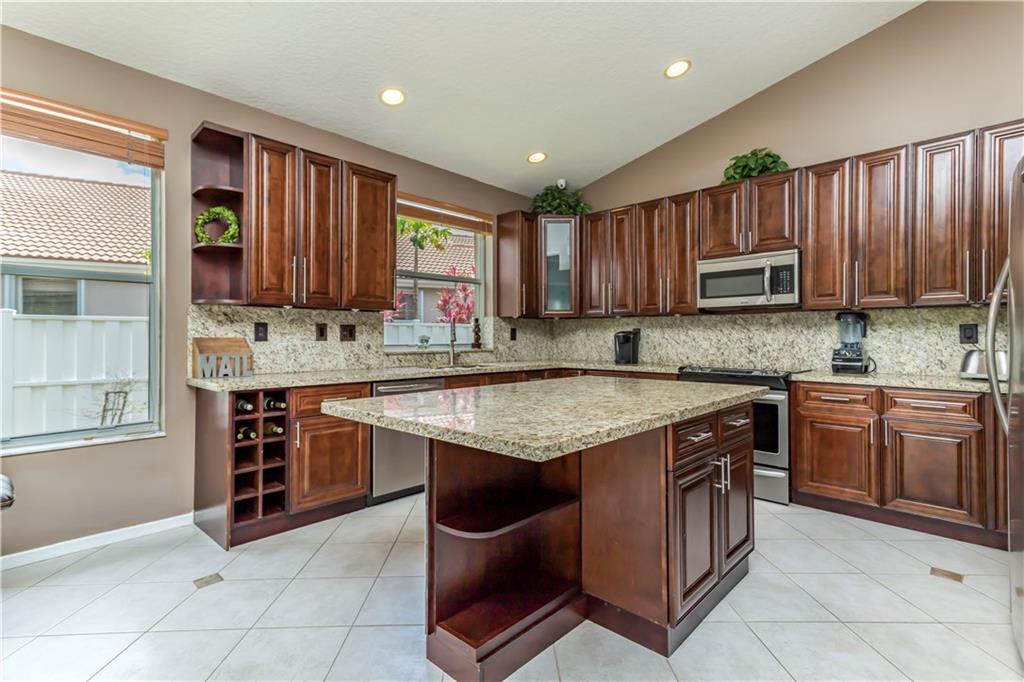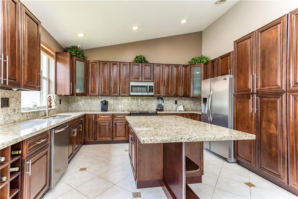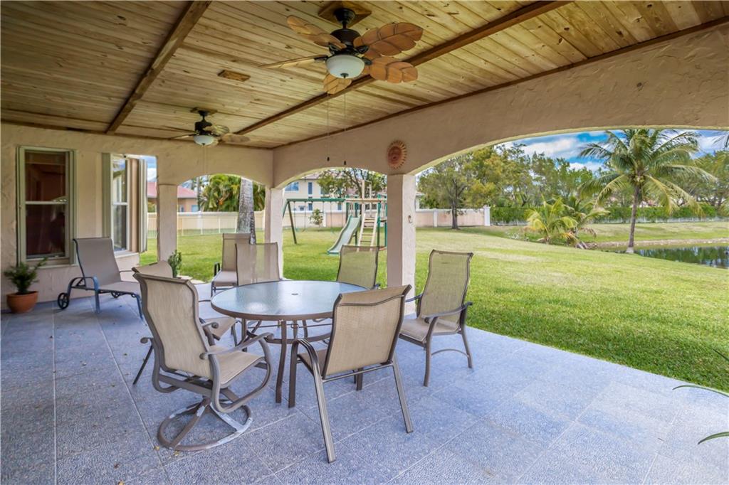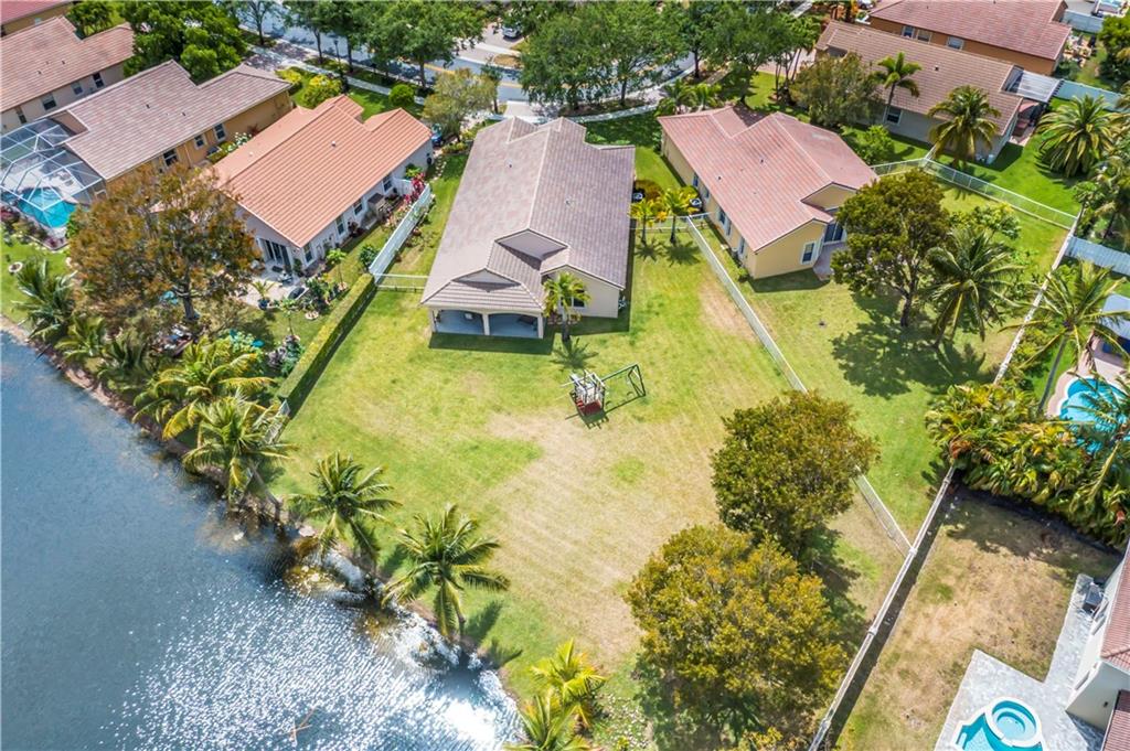 Enjoy this HUGE one of kind yard, large enough for you to host all your family and friends. This oversized lot gives you plenty of privacy with no neighbors behind and beautiful lake views. Plenty of room for a large pool. A custom covered sitting area was added giving you the perfect place to enjoy the backyard. The kitchen was completely remodeled with gorgeous, rich wood cabinetry with soft close drawers and doors. All stainless steel appliances, beautiful granite countertops and backsplash, large center island with sitting area. 2 bathrooms have been completely remodeled with new tile and fixtures. Home is protected by accordion shutters and a security system with numerous cameras throughout the property. AC was replaced in 2013, water heater replaced 2015.